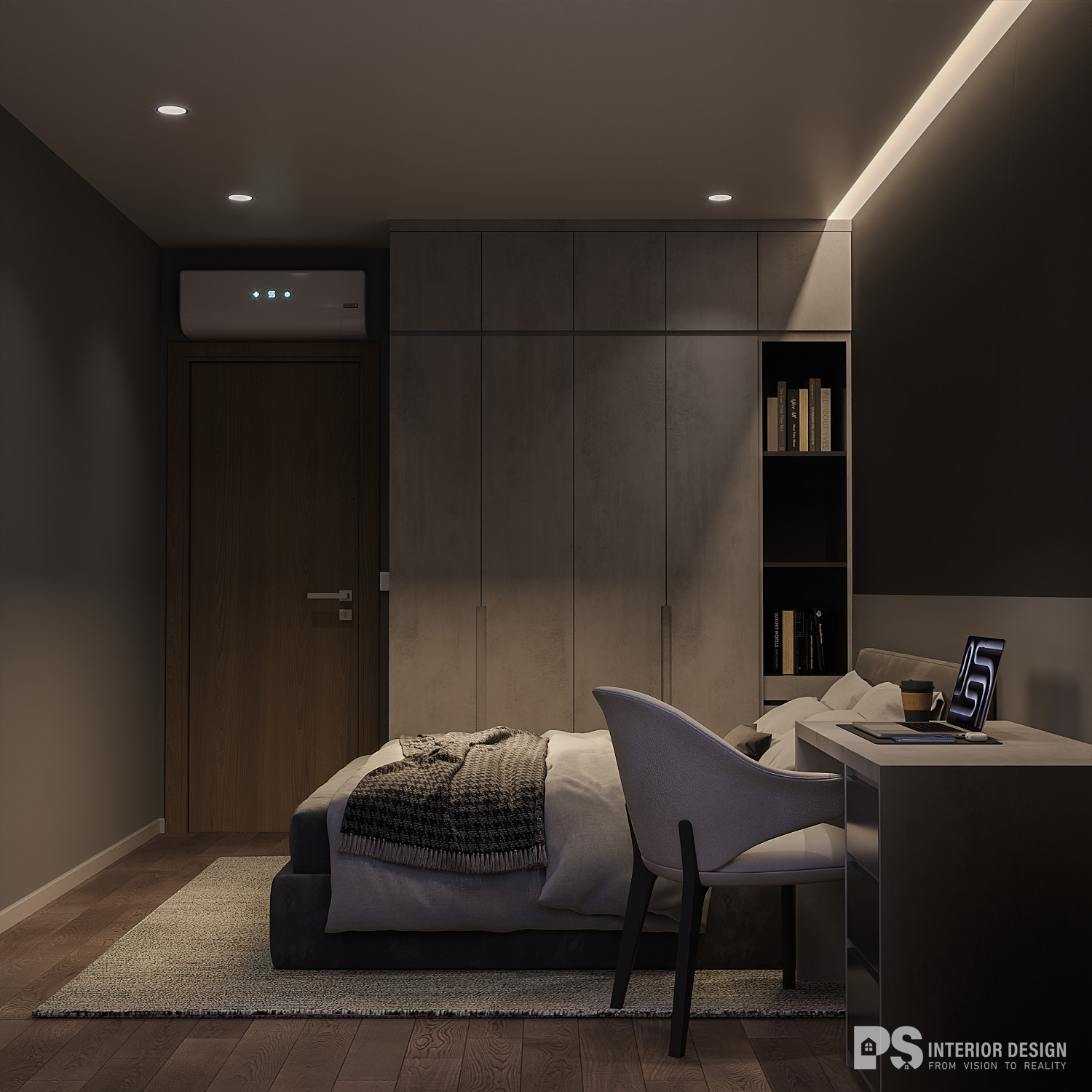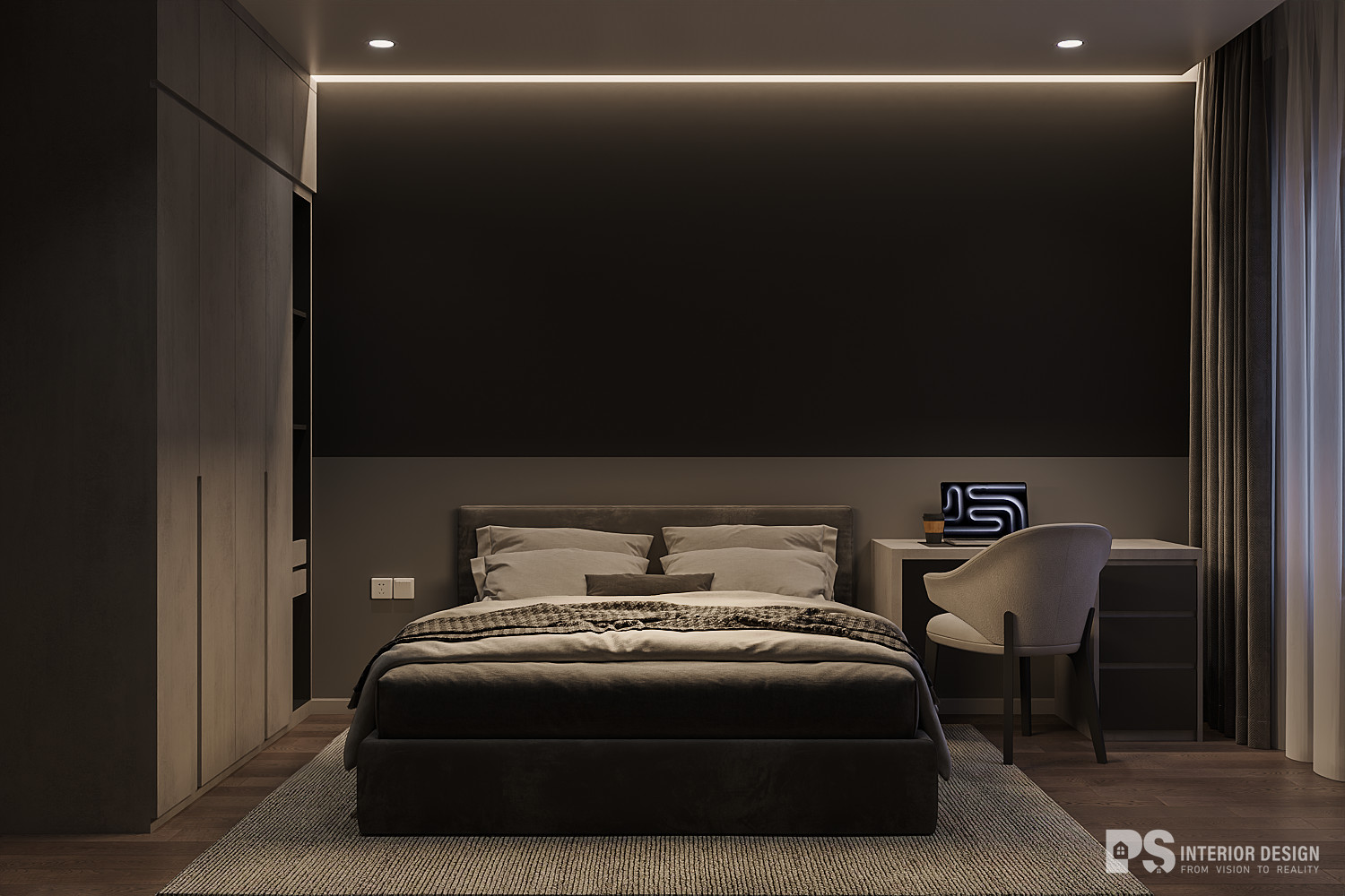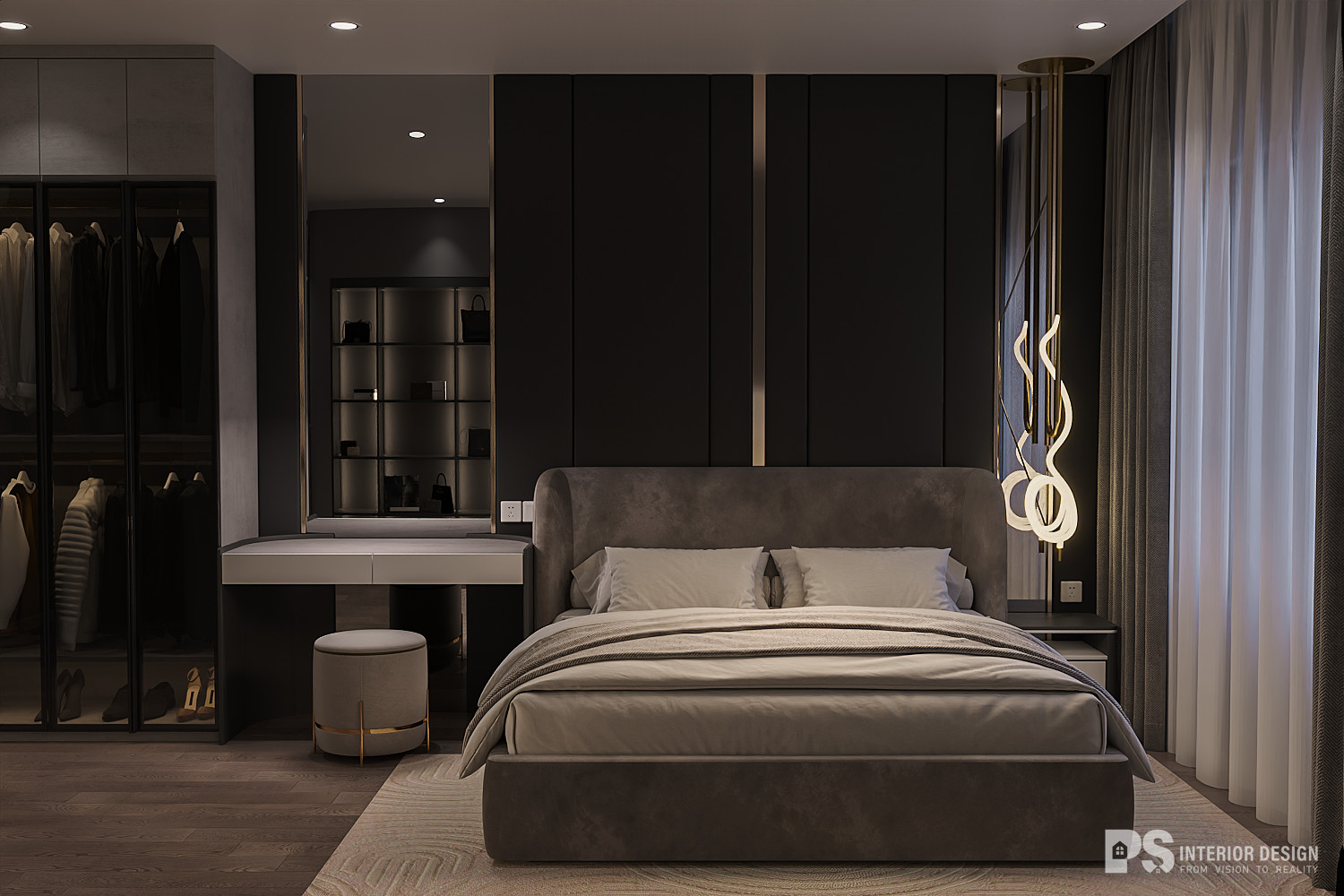 Phòng ngủ master được PS thiết kế hiện đại, tối giản với tủ quần áo vừa đủ tiện nghi cho Gia Chủ. Đèn ngủ với dáng hình độc đáo, đơn giản nhưng vô cùng phong cách.