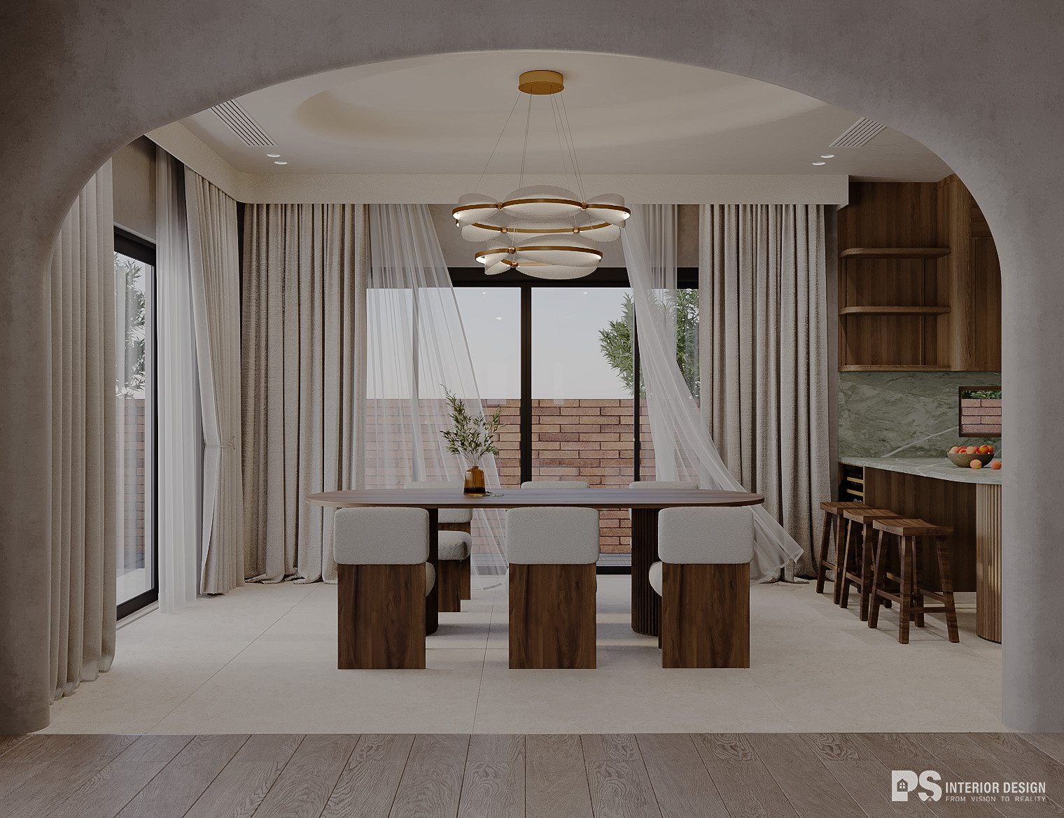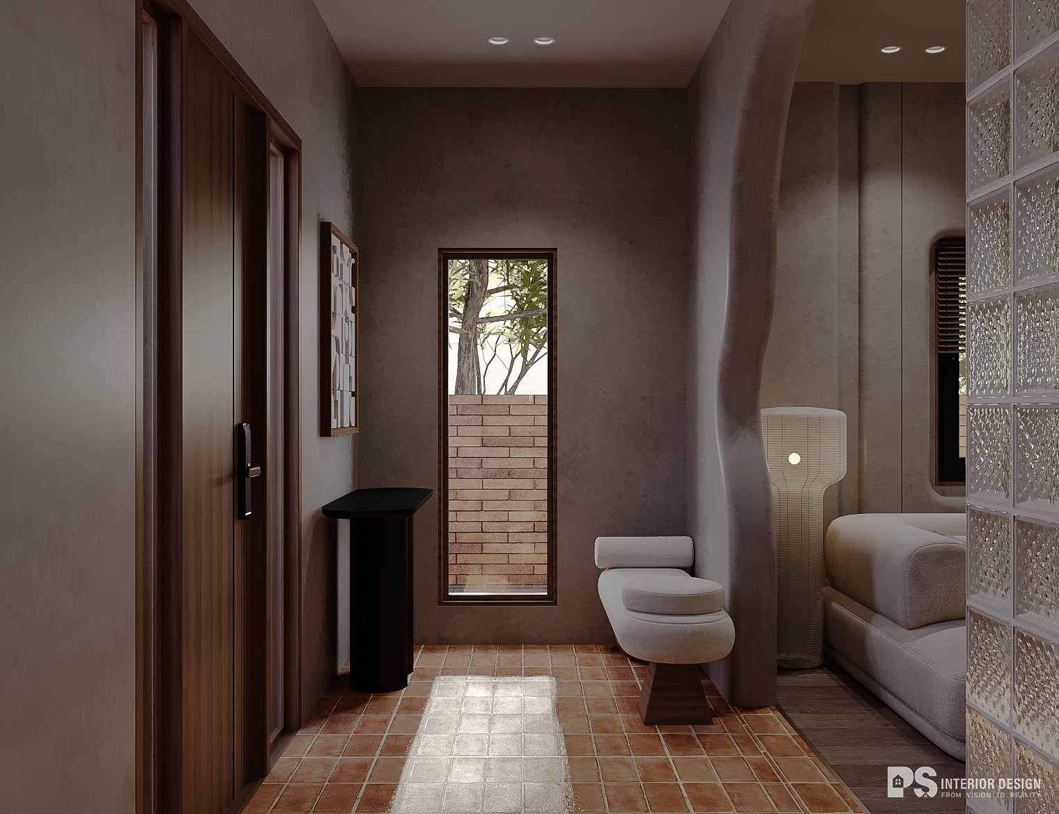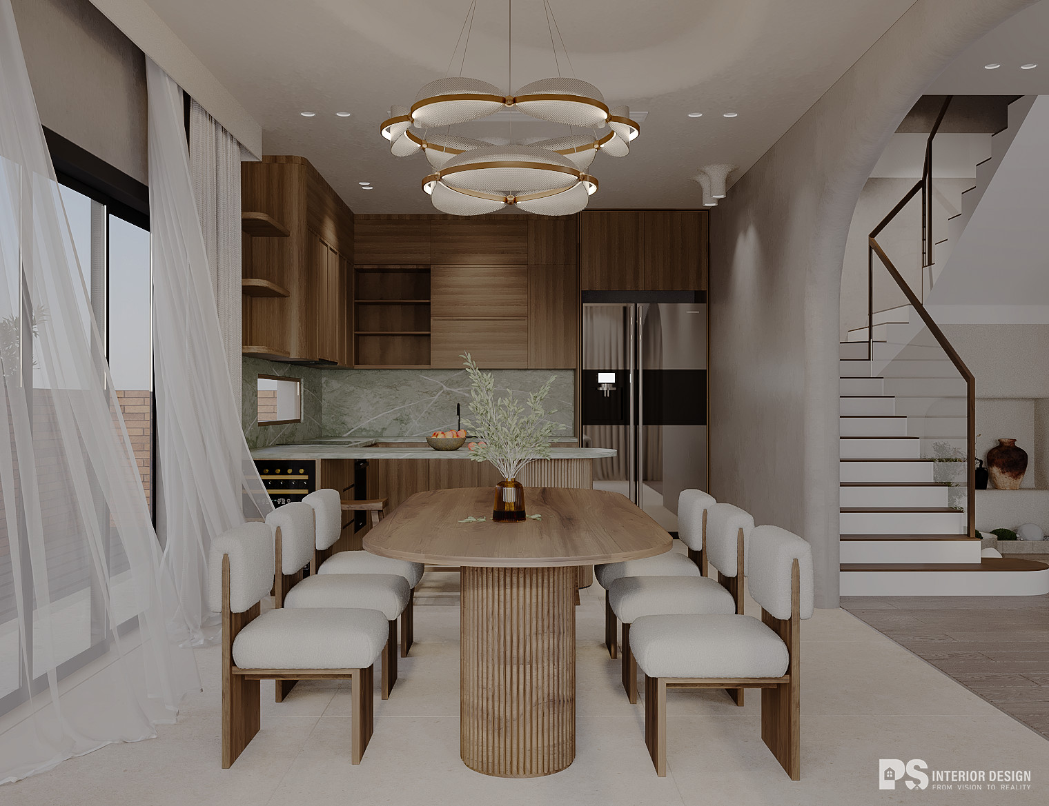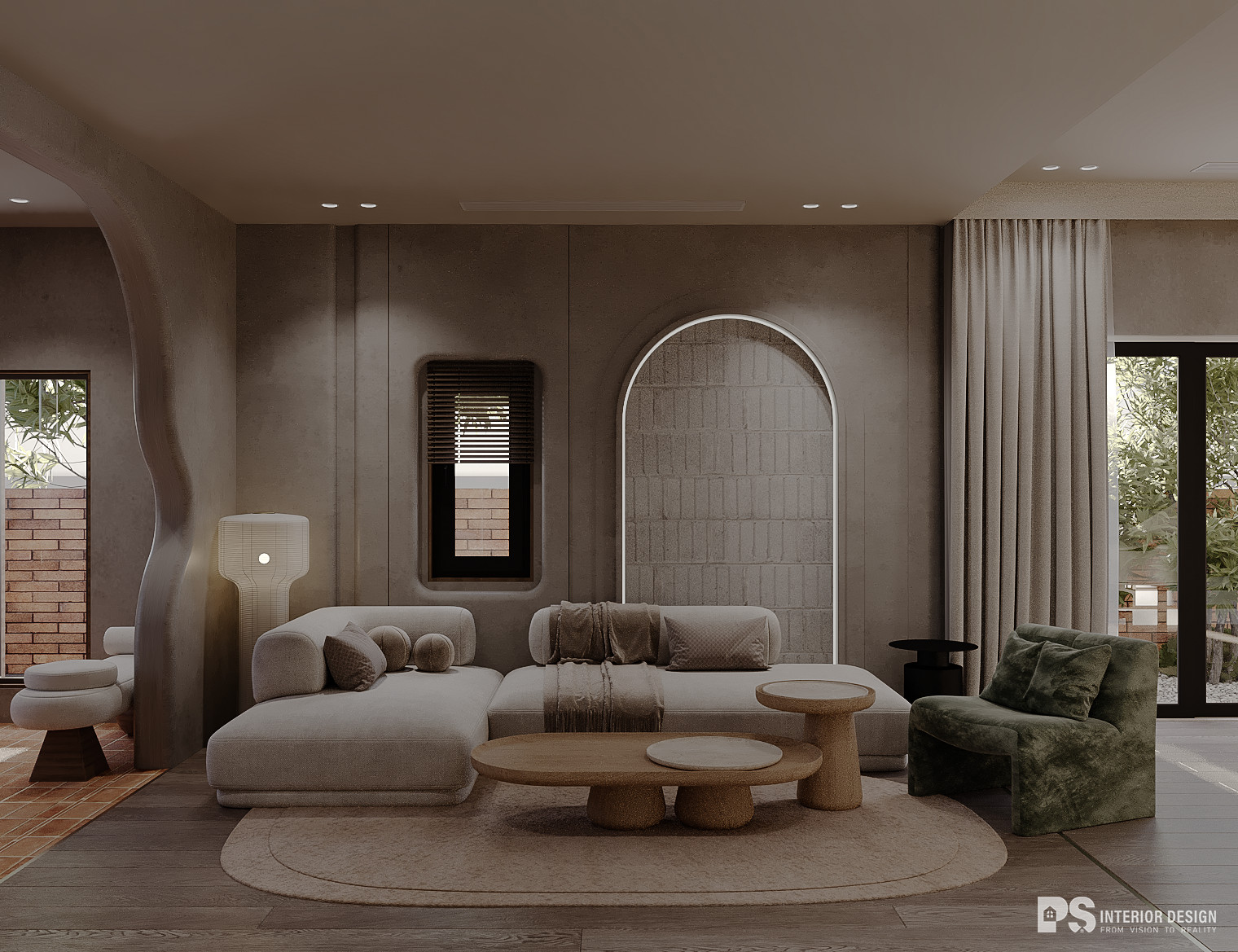 Nhà phố Aqua Riverside City Biên Hoà Đồng Nai có diện tích 978m² với quy mô: Sảnh trước | Phòng khách | Phòng ăn - bếp | 3 Phòng ngủ | Phòng làm việc | Phòng thờ | Phòng xem phim; được PS INTERIOR DESIGN thiết kế thanh lịch và tự nhiên theo phong cách Wabi Sabi. Phong cách nội thất Wabi Sabi không hướng con người ta đến một không gian sống hoàn mỹ, mà giúp họ tìm thấy sự đủ đầy trong tâm hồn hiện hữu trong vẻ đẹp nguyên sơ, bất toàn.