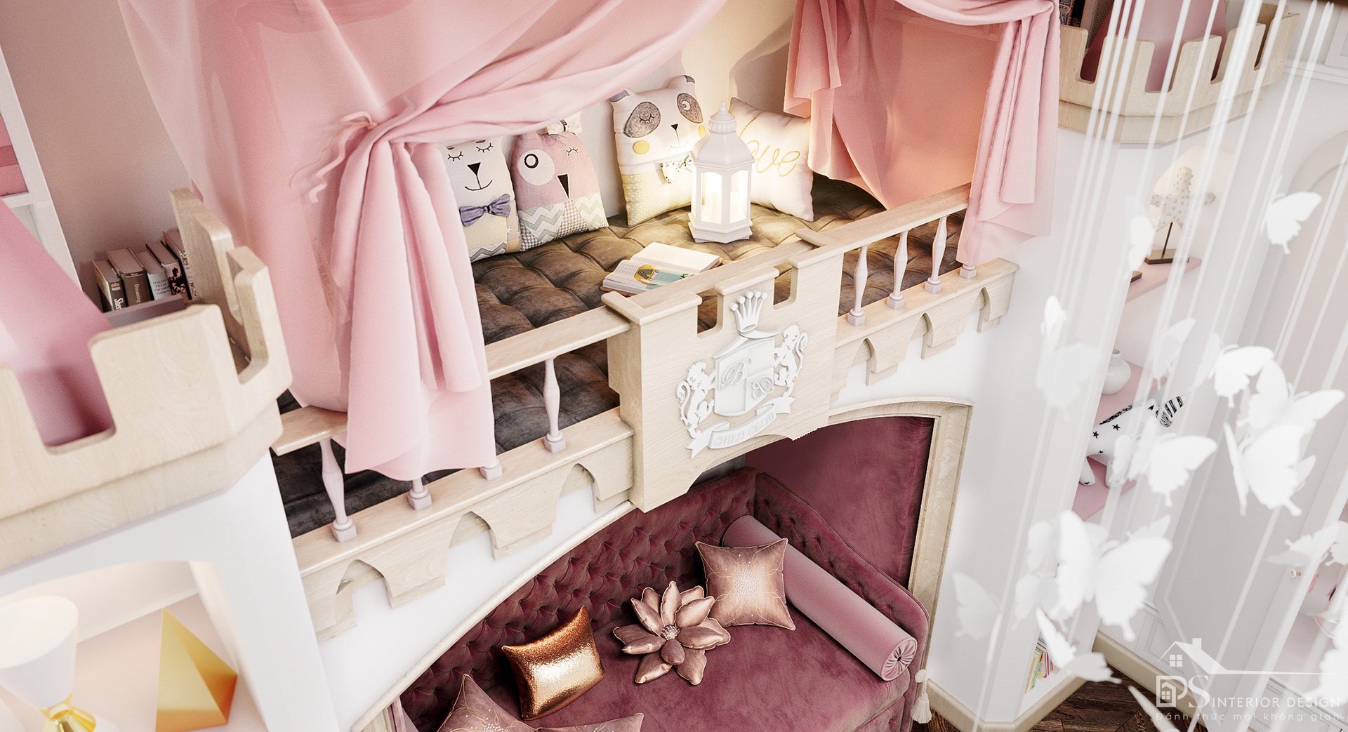 Các bé gái thường thích các tông màu dịu nhẹ, nên PS INTERIOR DESIGN đã chọn màu hồng trên nền trắng của cả căn nhà. Làm bật lên được sự nhẹ nhàng nhưng lại không kém phần cá tính. Giường và ghế sofa được xây dựng theo kiểu lâu đài chắc chắn sẽ làm bé trong nhà có cảm giác như mình là một công chúa nhỏ tại nơi đây