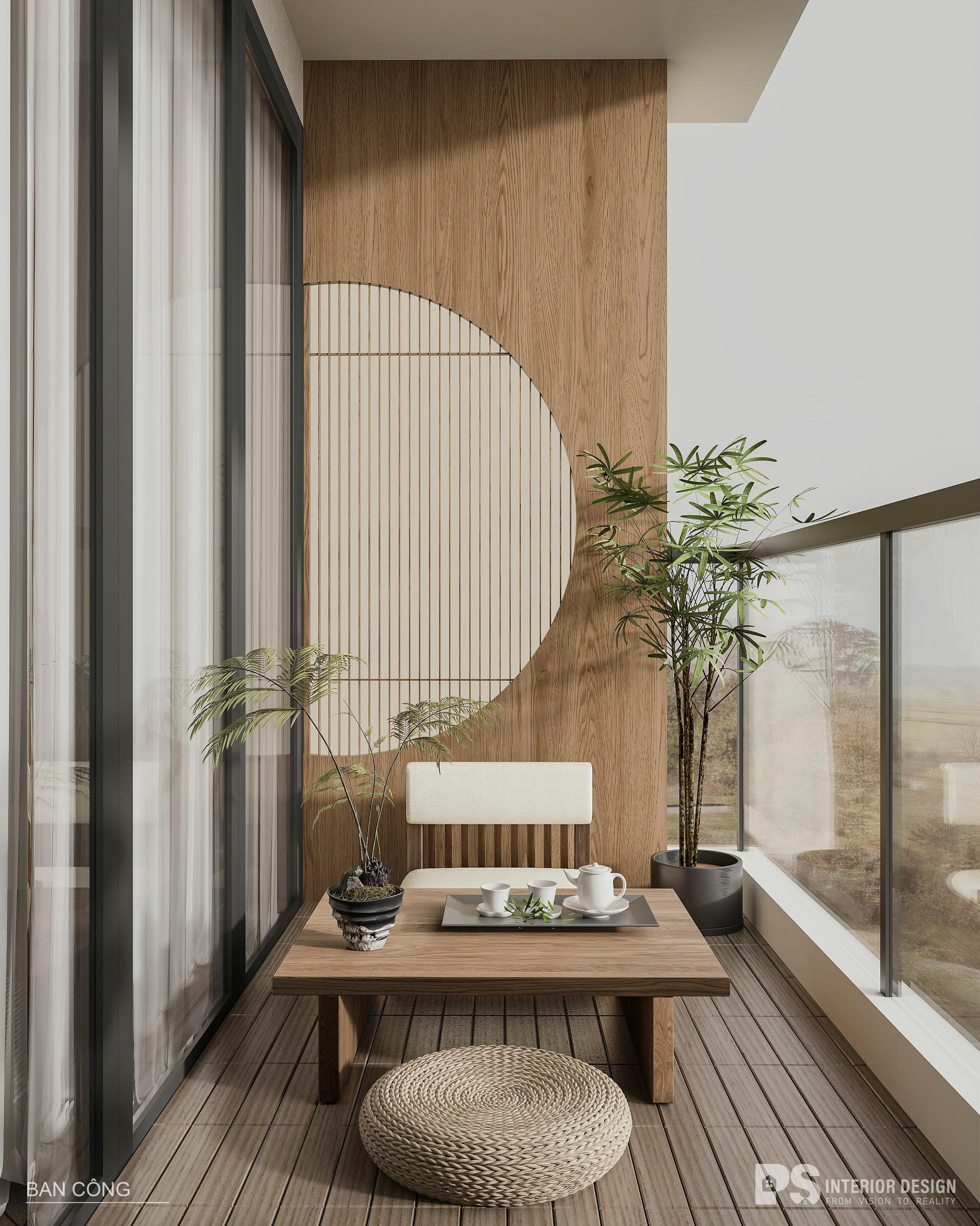Việc bố trí thêm một chiếc ghế nhỏ, kết hợp cùng cây xanh và hệ đèn trang trí nhẹ nhàng sẽ khiến ban công trở nên gần gũi và dễ chịu hơn. Nếu diện tích cho phép, gia chủ có thể đặt thêm bàn trà hoặc một chiếc ghế đọc sách để biến nơi đây thành không gian riêng tư, lý tưởng cho những khoảng thời gian nghỉ ngơi.