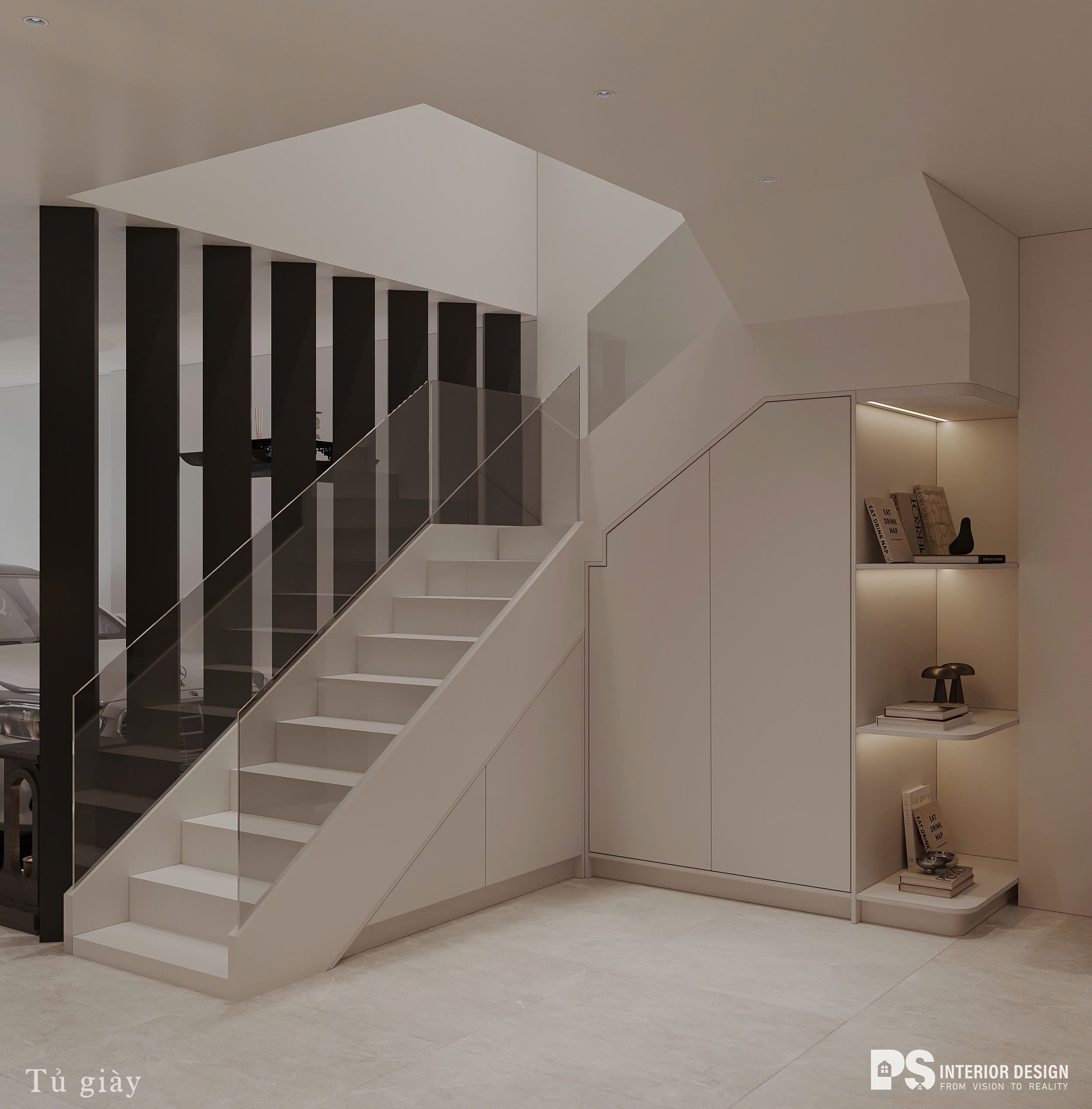 Trong nhiều ngôi nhà, gầm cầu thang thường bị bỏ trống hoặc sử dụng chưa hiệu quả. Tuy nhiên, nếu được thiết kế lại hợp lý, khu vực này hoàn toàn có thể trở thành không gian lưu trữ hoặc góc chức năng tiện ích. Giải pháp phổ biến là thiết kế tủ âm theo kích thước thực tế để tối ưu diện tích, giúp lưu trữ đồ đạc gọn gàng mà vẫn đảm bảo tính thẩm mỹ. Ngoài ra, gia chủ cũng có thể lựa chọn kệ mở để tăng tính linh hoạt và tạo cảm giác nhẹ nhàng hơn cho không gian.