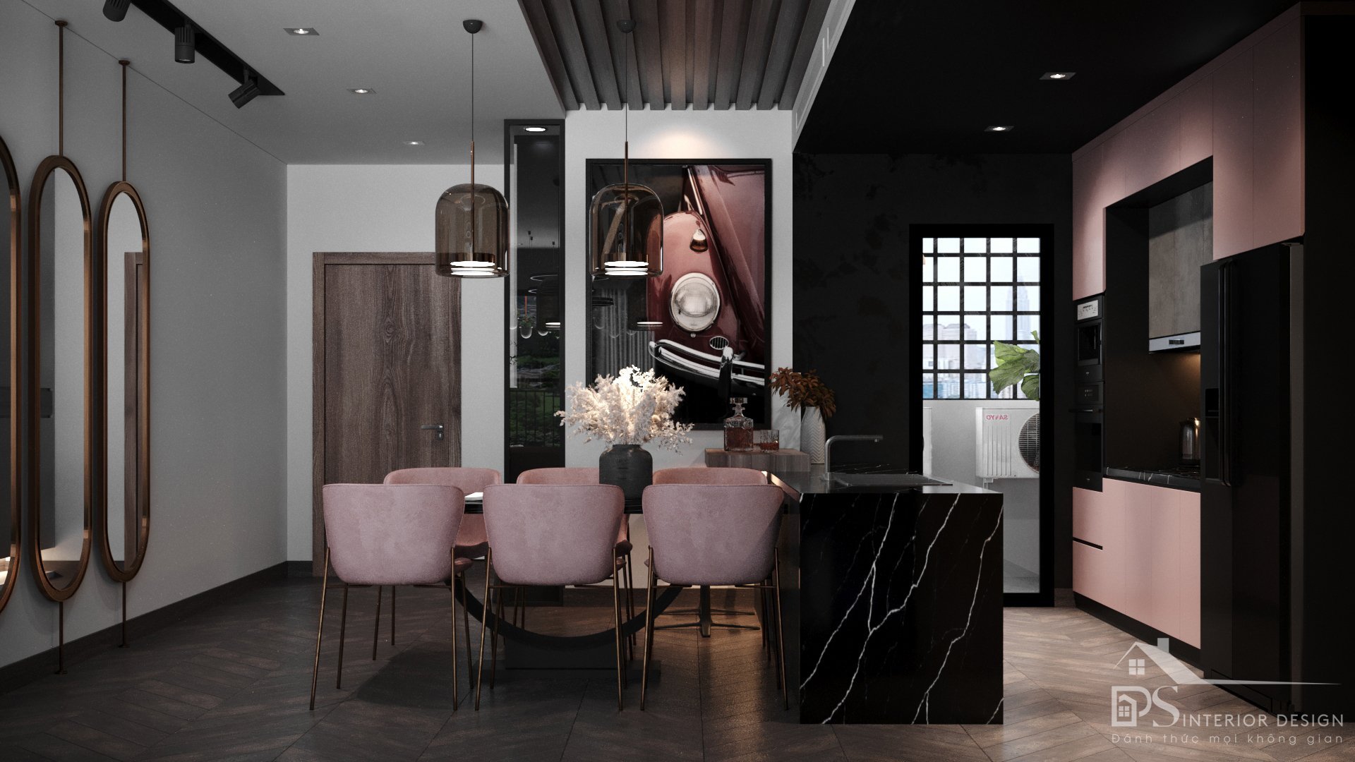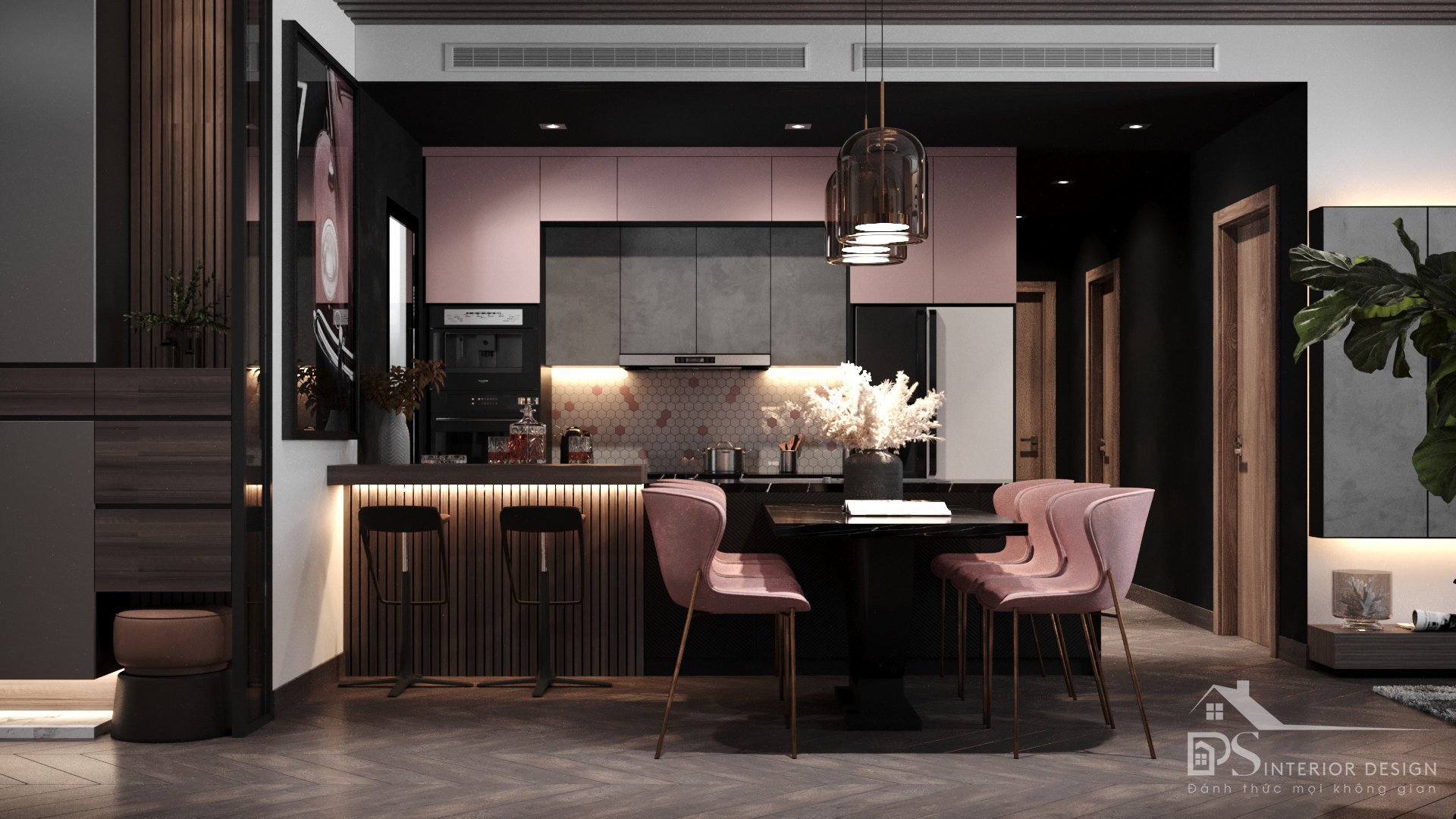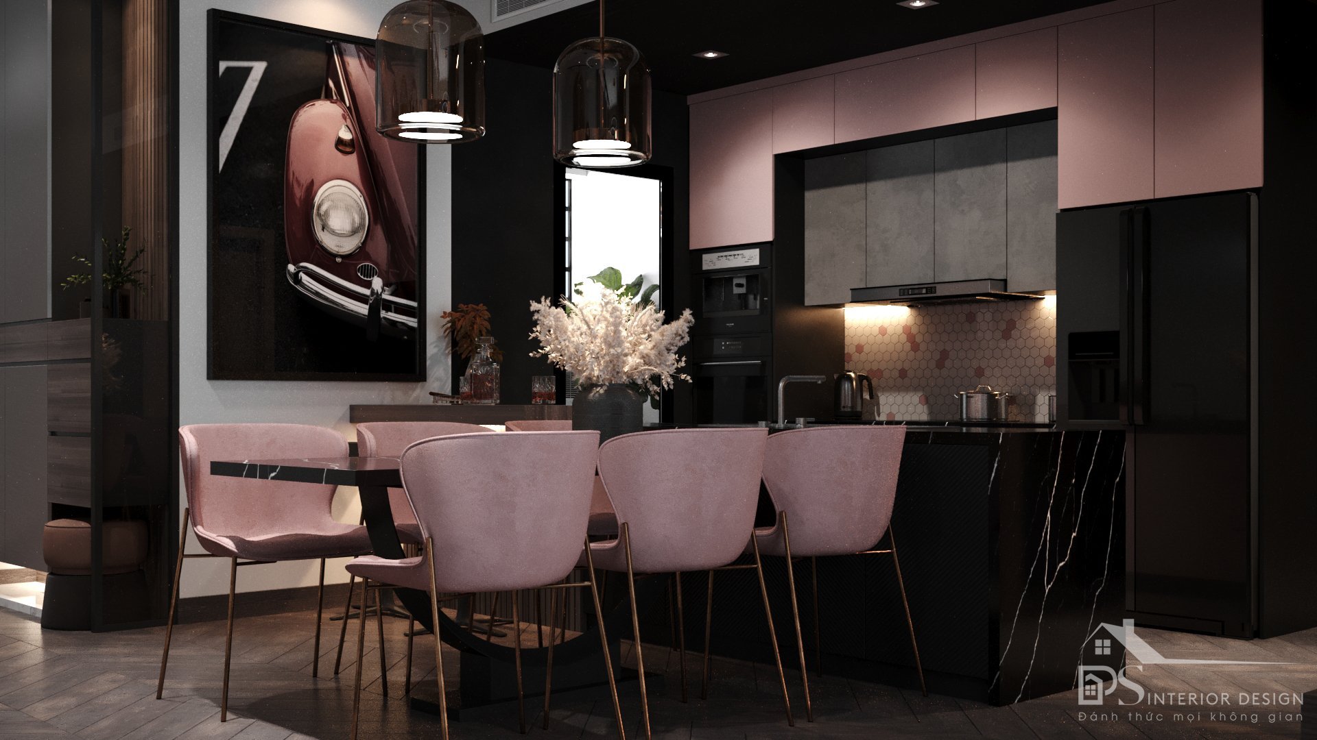 Nội thất phòng bếp được kết hợp hài hòa giữa tông màu đen và hồng, phù hợp với những gia chủ có tính cách nhẹ nhàng nhưng lại thích phá cách. Mặt tủ giả đá tạo nên sự thuận tiện cho việc nấu nướng thao tác cho bà nội trợ