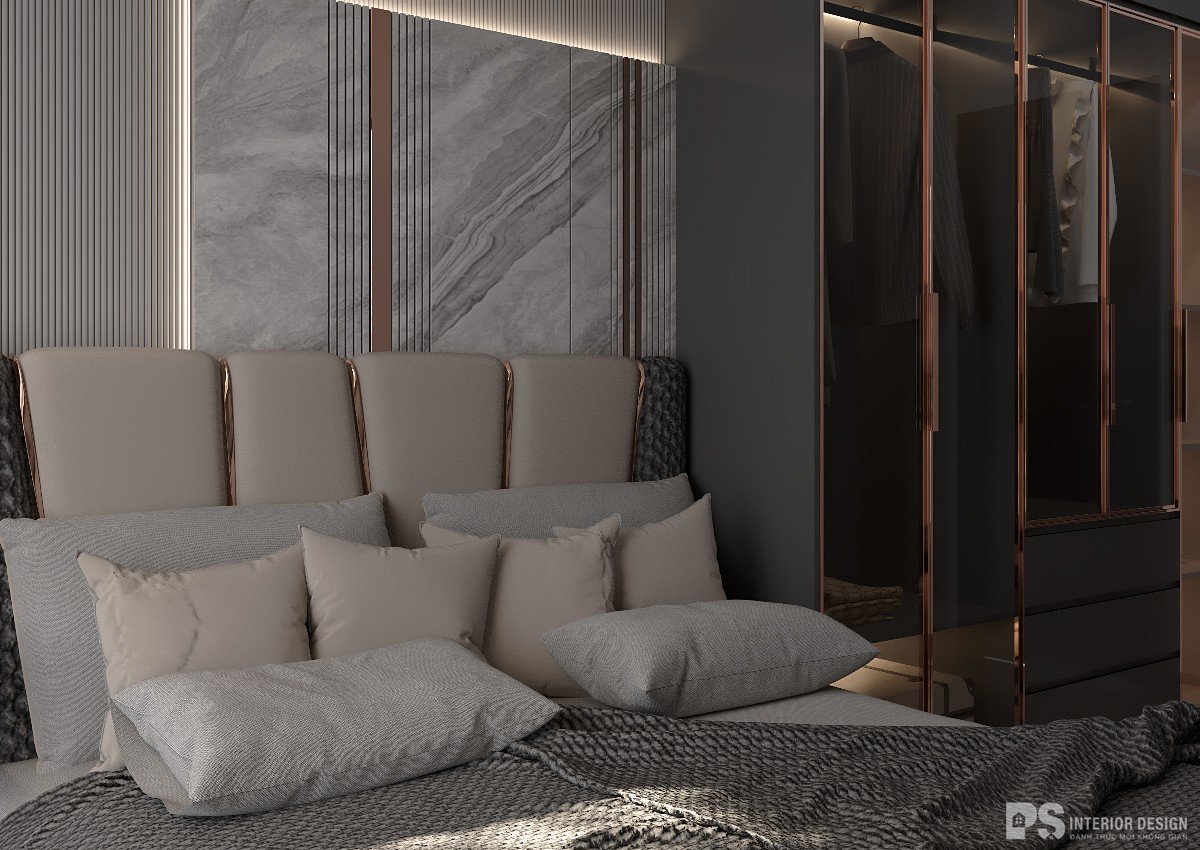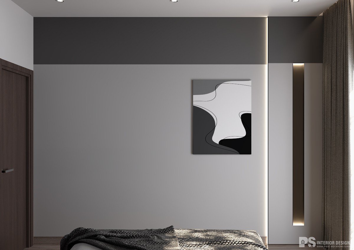 Thiết kế mới lạ với vách ốp đầu giường với những đường kẻ không theo sự sắp đặt nào mang tính tự do, mang đến cho chủ nhà cảm giác thoải mái, phóng khoáng không bị bó buộc. Miếng ốp tường đầu giường sử dụng mặt giả đá nhằm tăng thêm sự sang trọng, kiêu sa cho căn phòng.