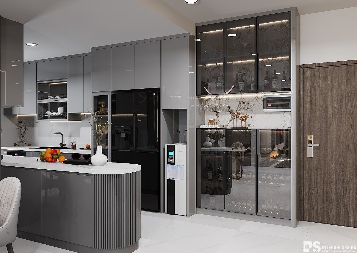 Hầu hết các căn hộ hiện nay luôn thiết kế phòng bếp và phòng khách được thông với nhau, tại đây nhằm ngăn cách tinh tế giữa khách và bếp đã sử dụng bộ bàn ghế ăn bọc da sử dụng màu xám nhằm trung hòa lại màu sắc và tránh sự nhàm chán cho gia chủ.