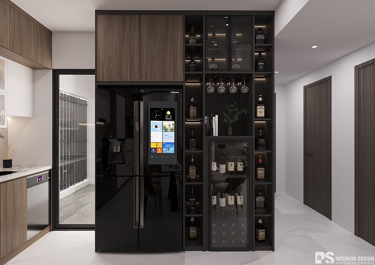 Đi kèm với đó là tủ rượu với màu đen huyền bí làm cho cả gian phòng trở nên sang trọng và hiện đại hơn.