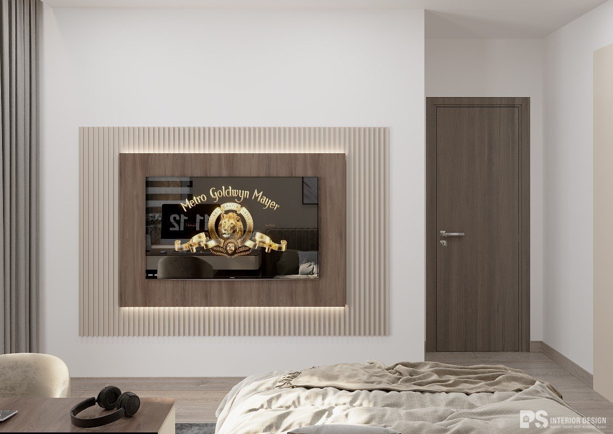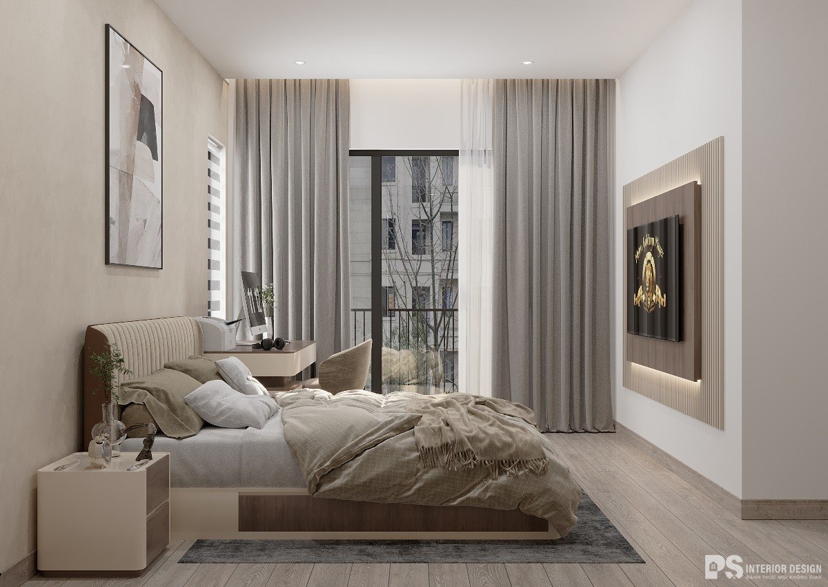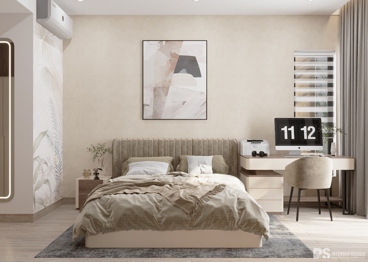 Phòng ngủ được chọn tông màu trung tính giống với phòng khách, miếng ốp đầu giường được thiết kế với các đường cong uốn lượn tạo cảm giác thoải mái cho gia chủ khi nghỉ ngơi tại nơi này.