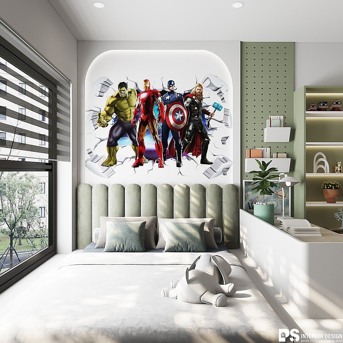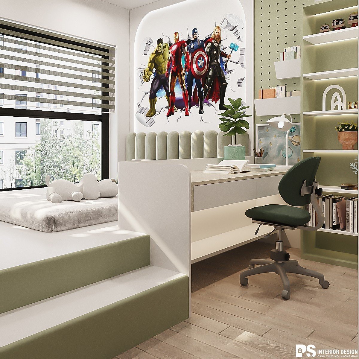 Phòng bé trai được chọn tông màu mạnh mẽ với chủ đề siêu anh hùng tạo nên một không gian phù hợp với sở thích và tính cách của trẻ . Việc lựa chọn kích thước và chiều cao của giường, tủ quần áo, bàn học phù hợp với con trẻ, giúp tránh các tai nạn xảy ra.