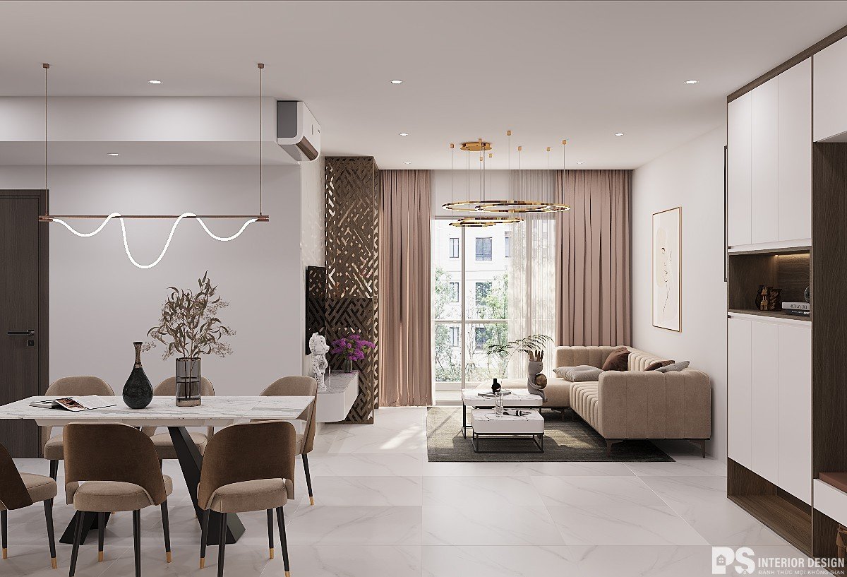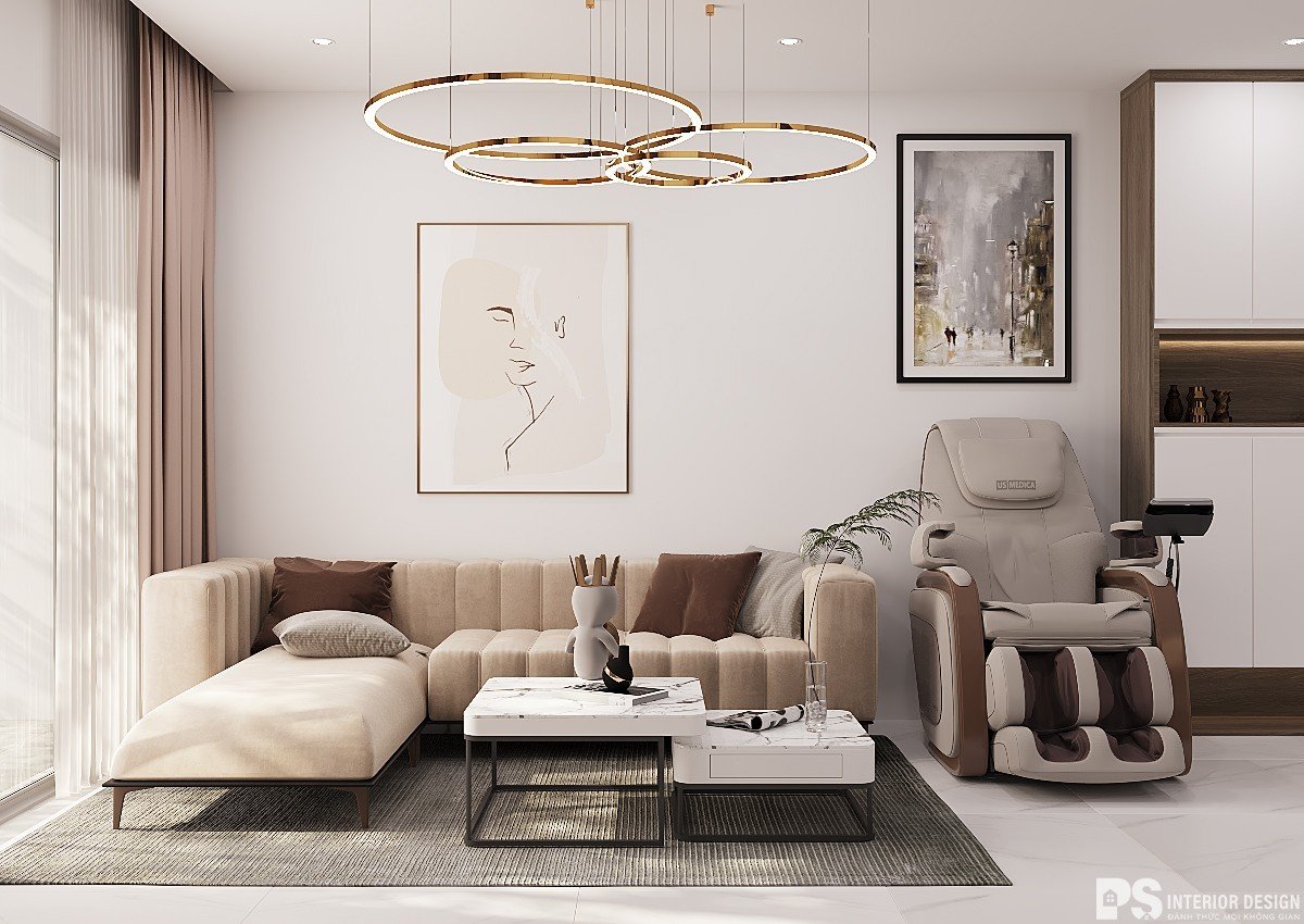Là không gian quan trọng nhất trong nhà nên các kiến KTS của PS luôn chú trọng vào việc thiết kế sao cho kết hợp hài hòa giữa các màu sắc và chất liệu của các vật dụng nội thất. Phòng khách căn hộ Diamond Alnata được chọn màu chủ đạo là be kết hợp với trắng và vàng kem làm tăng tính thẩm mỹ cho cả gian phòng.