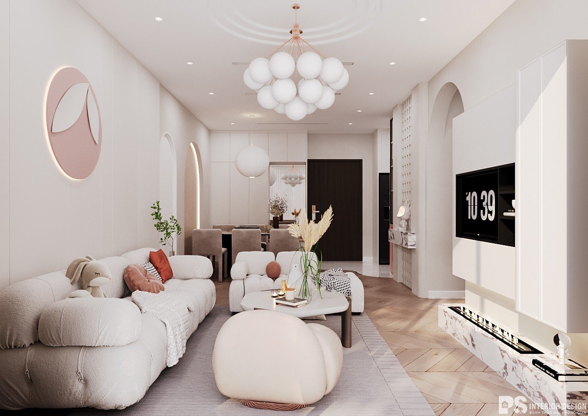 Được chăm chút tỉ mỉ trong từng chi tiết khi kết hợp tone màu hồng và trắng đã làm nên một không gian “dịu nhẹ” nhưng lại không kém phần lãng mạn, sang trọng. Việc bố trí ghế Sofa chữ L đã giúp tiết kiệm được không gian và tối đa công năng sử dụng của phòng khách.