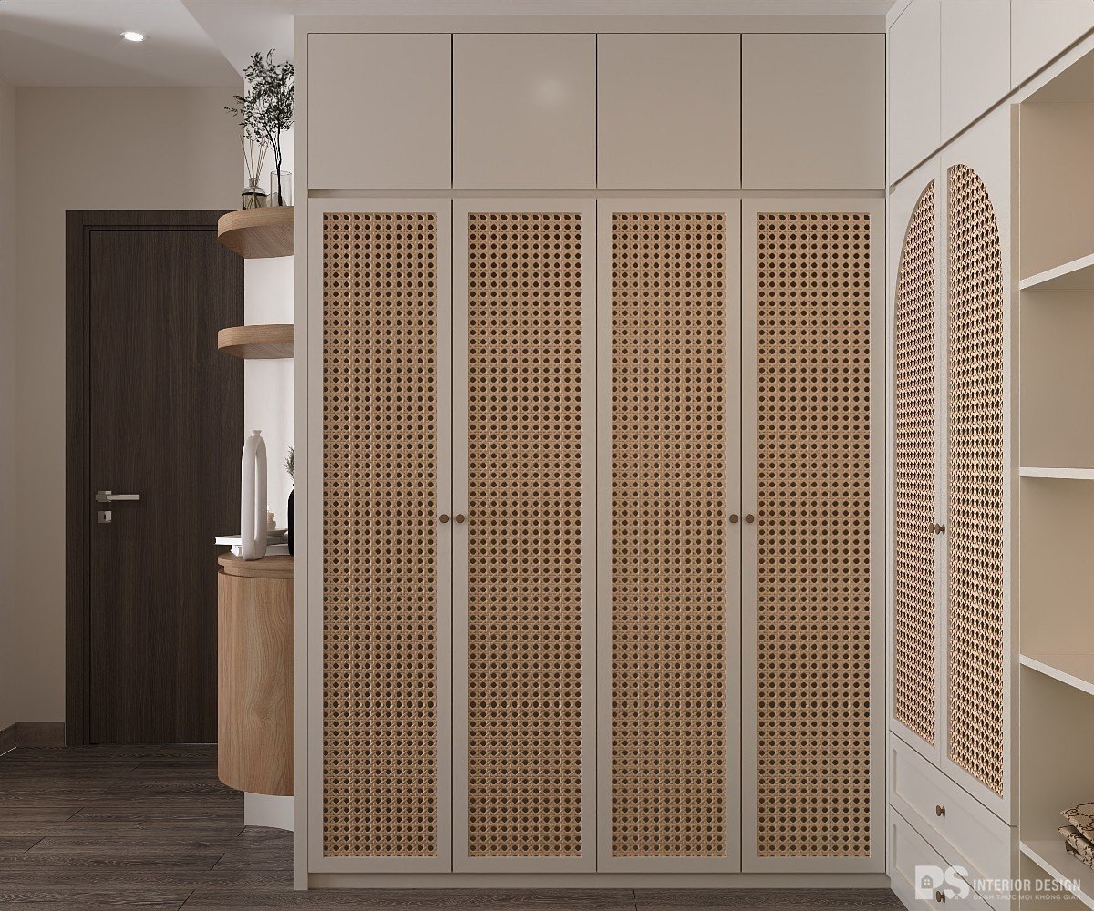 Tủ âm tường được thiết kế riêng biệt bằng mây, giúp tạo hiệu ứng ấm áp và thân thiện với gia chủ. Thiết kế tủ mây hiện tại đang được rất nhiều khách hàng yêu thích và chọn cho không gian riêng của mình tại PS Interior Design.