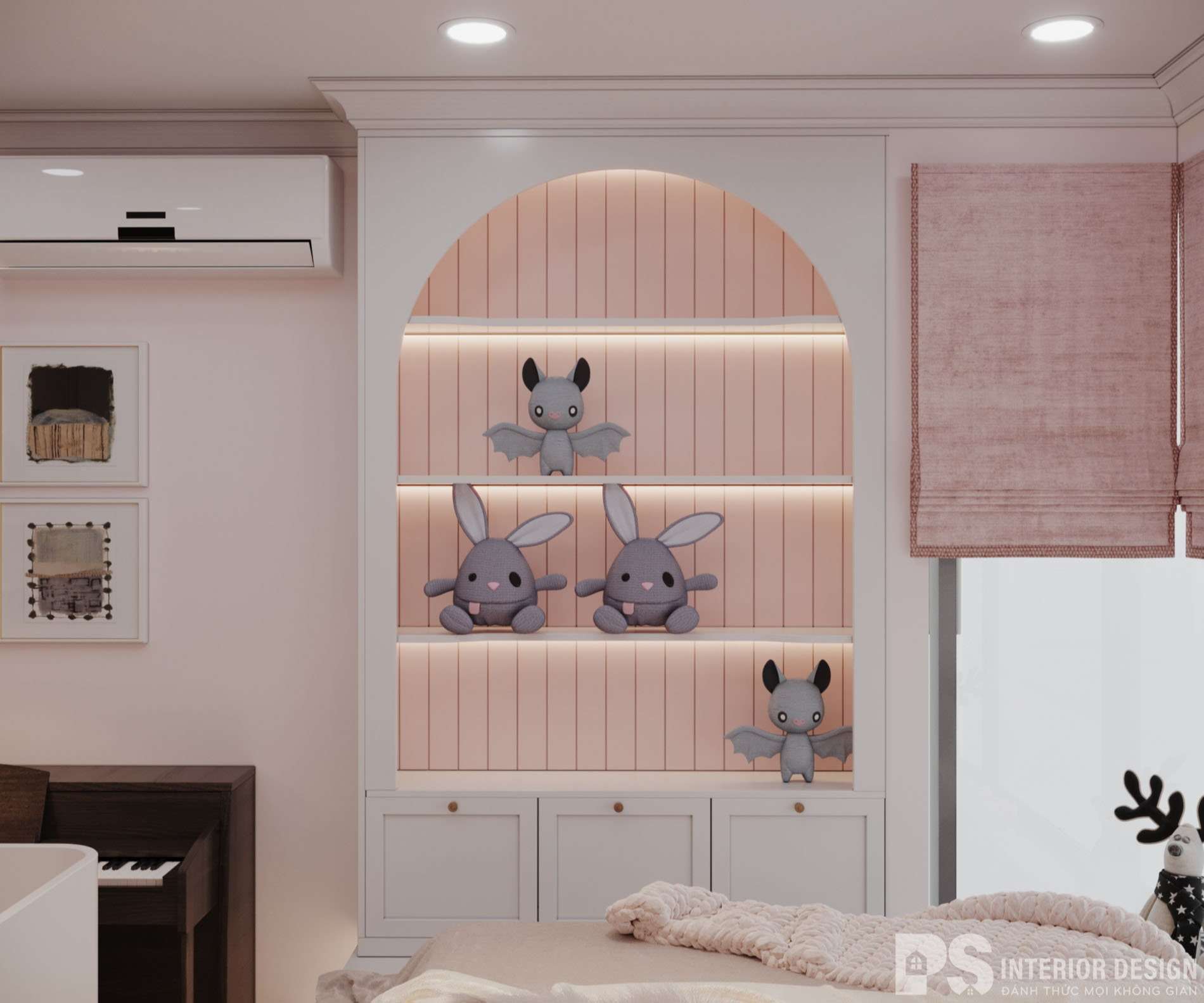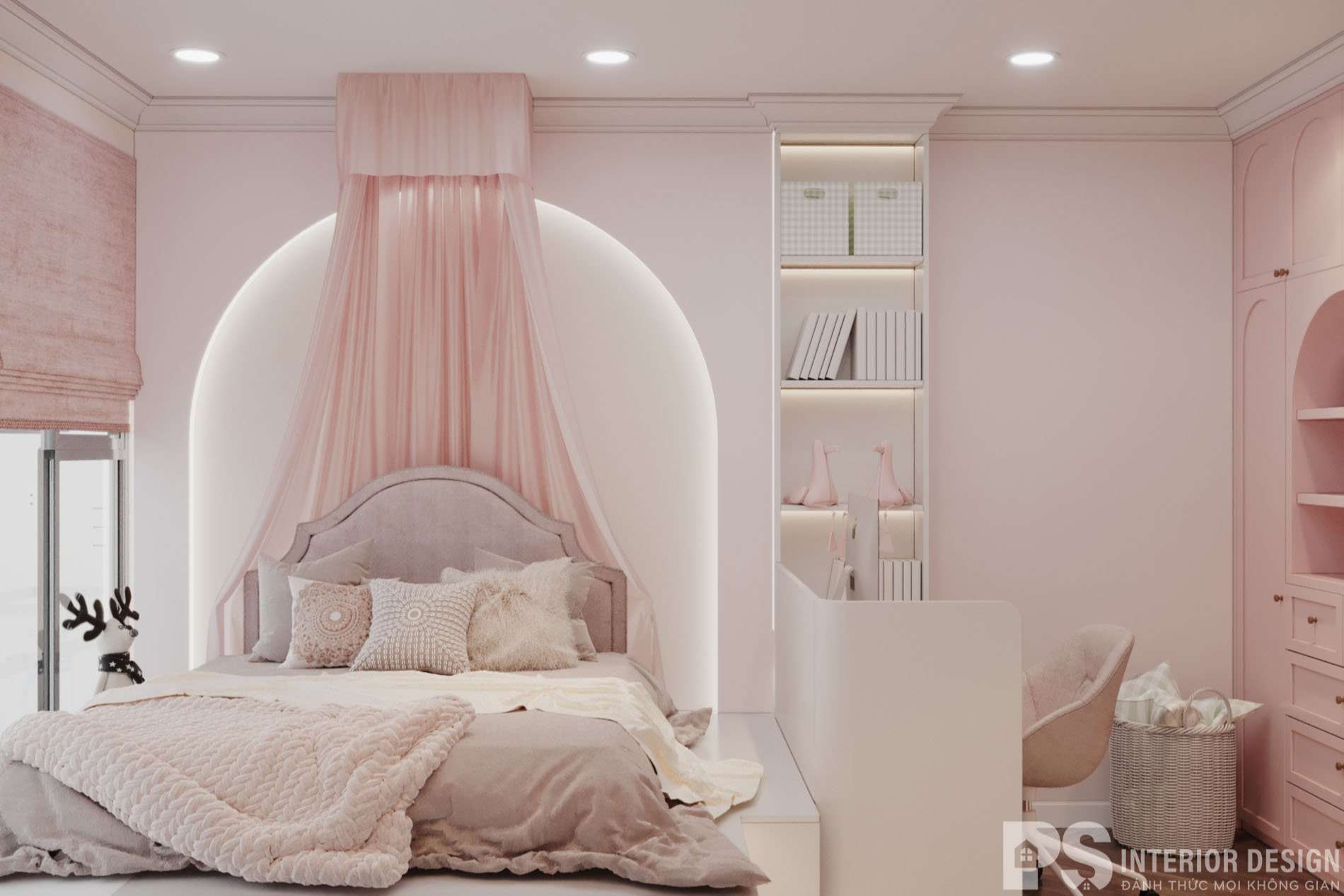 Thiết kế nội thất phòng ngủ dành cho bé tràn ngập nét tươi sáng của màu sắc hồng pastel. Phòng ngủ của con được bố trí và thiết kế nội thất đơn giản, chủ yếu chú trọng vào công năng sử dụng của các đồ nội thất sao cho con được nghỉ ngơi thư giãn tiện lợi và thoải mái nhất.