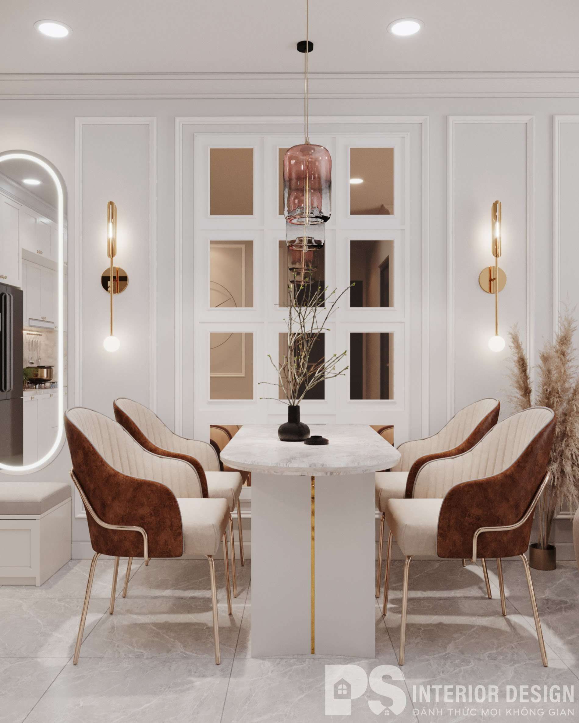 Không gian bàn ăn, thiết kế bộ bàn ghế hiện đại gam màu trầm ấm cùng với sự kết hợp của các đồ trang trí như, đèn trần, đặc biệt là miếng ốp tạo nên một không gian sa hoa đẳng cấp.