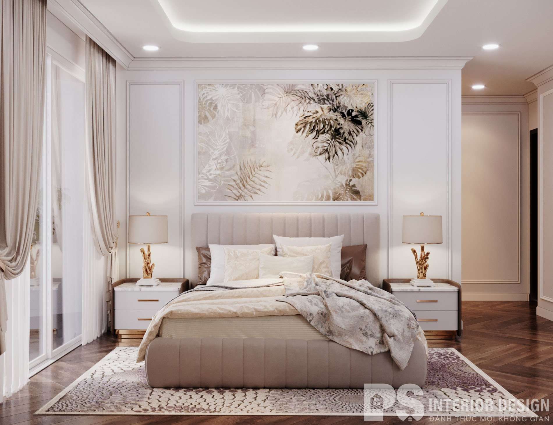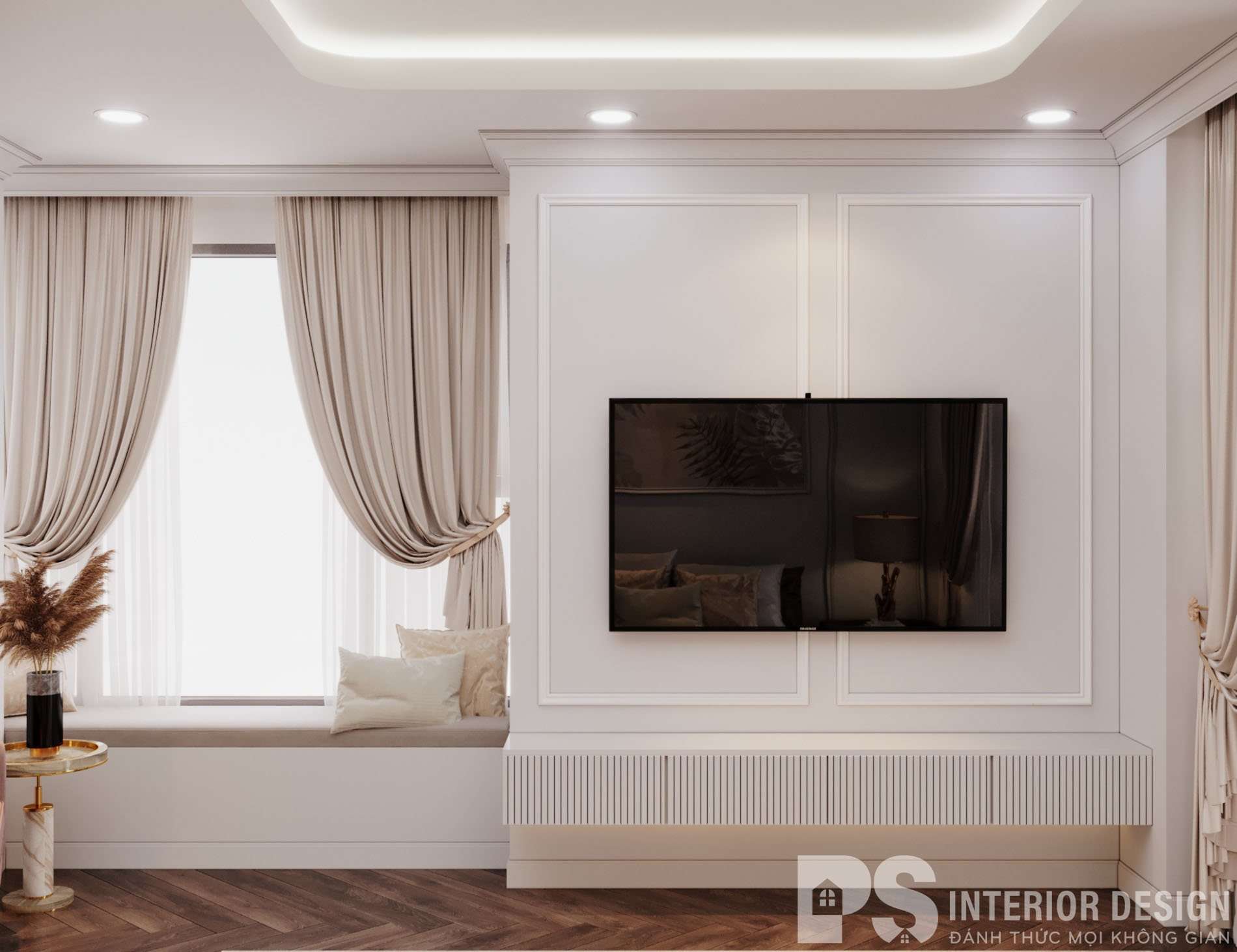 Đối diện với giường ngủ là tivi được thiết kế treo tường đem đến một sự tiện nghi mỗi khi gia chủ nghỉ ngơi.