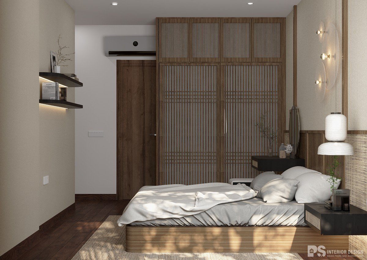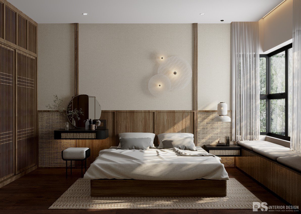 Phòng ngủ có lối thiết kế tối giản cùng với các chất liệu tự nhiên tạo cảm giác gần gũi và thân thiệt với môi trường giúp cho gia chủ cảm giác nhẹ nhàng và bình yên khi về căn phòng ngủ của mình.
