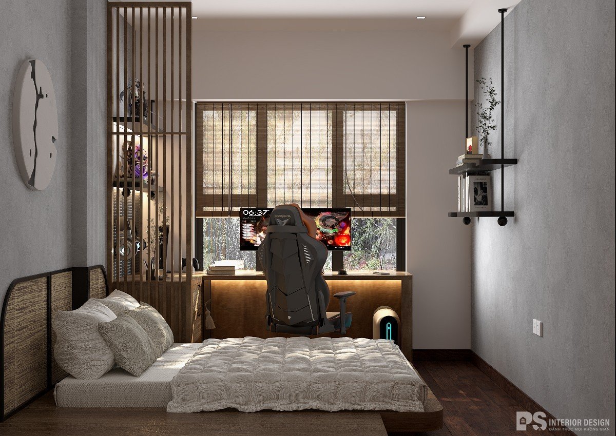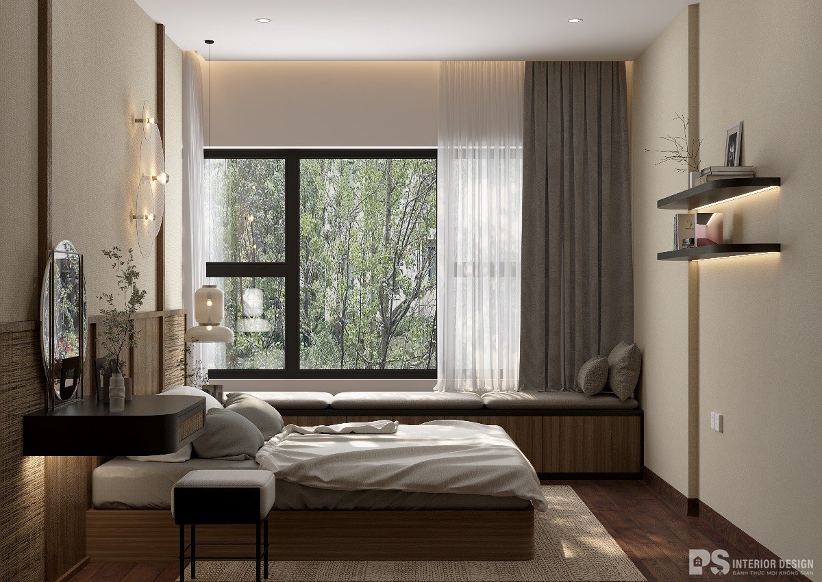 Phòng ngủ phụ với diện tích không quá lớn nên PS đã lựa chọn lối thiết kế tối giản cùng với nội thất thông minh và tiết kiệm diện tích đã kiến tạo ra một không gian vừa đủ, ngoài ra căn phòng còn có đầy đủ công năng mang đến một căn phòng ngủ tiện nghi và dễ chịu.