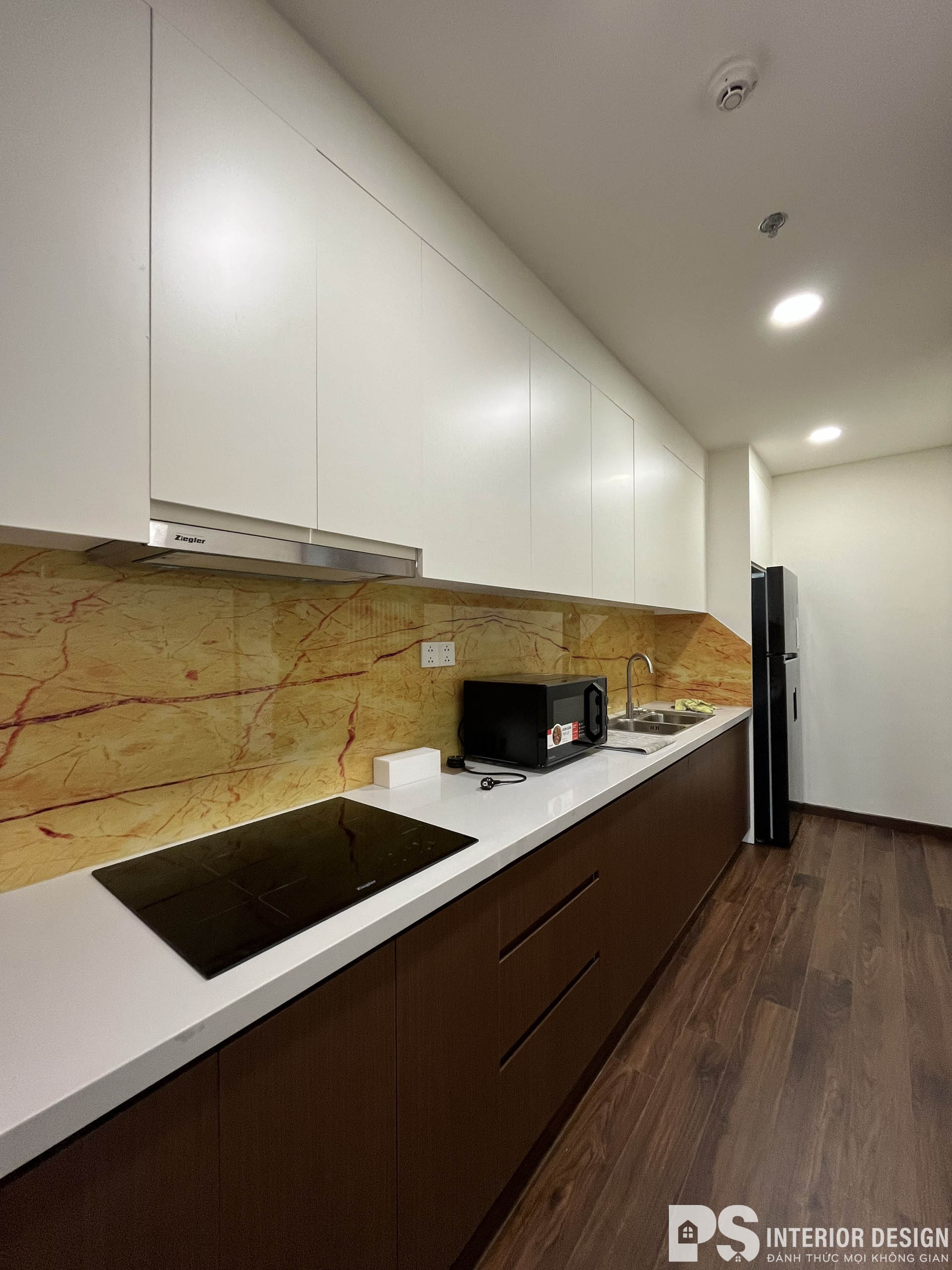 “Ẩn mình” sau một cánh cửa đã tạo ra cho không gian phòng bếp sự riêng tư, mang đến sự thoải mái cho bà nội trợ. Bên cạnh đó việc bố trí mặt giả đá Marble đã giúp cho bề mặt trở nên bóng loáng dễ dàng lau chùi cũng như dọn dẹp vệ sinh khi nấu nướng tại đây.