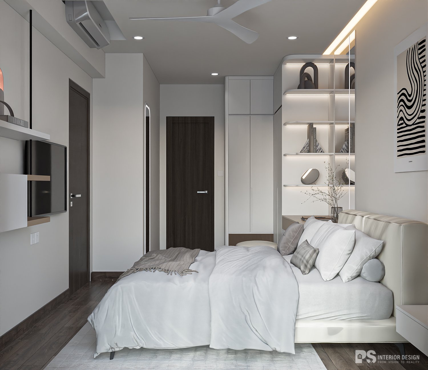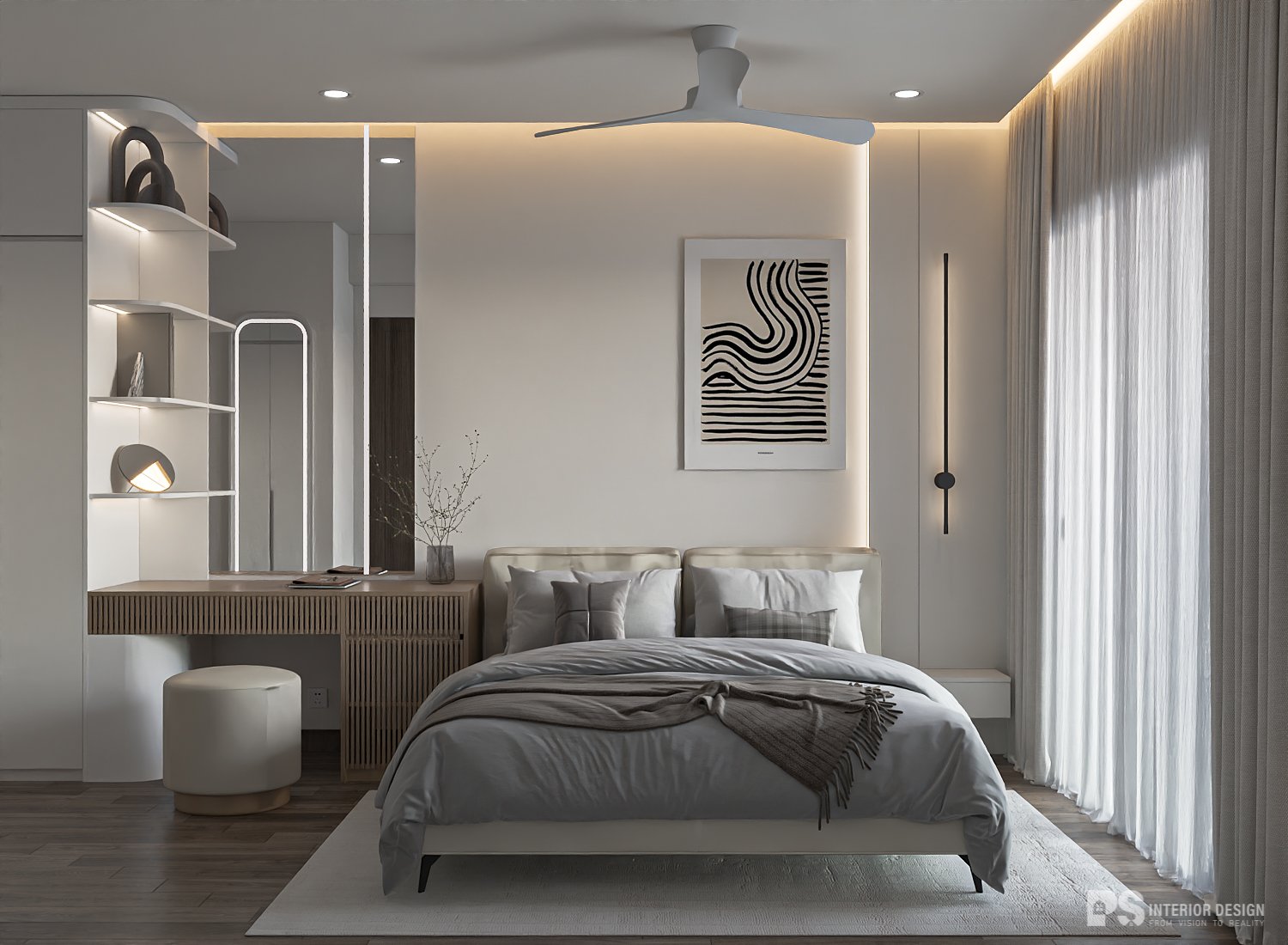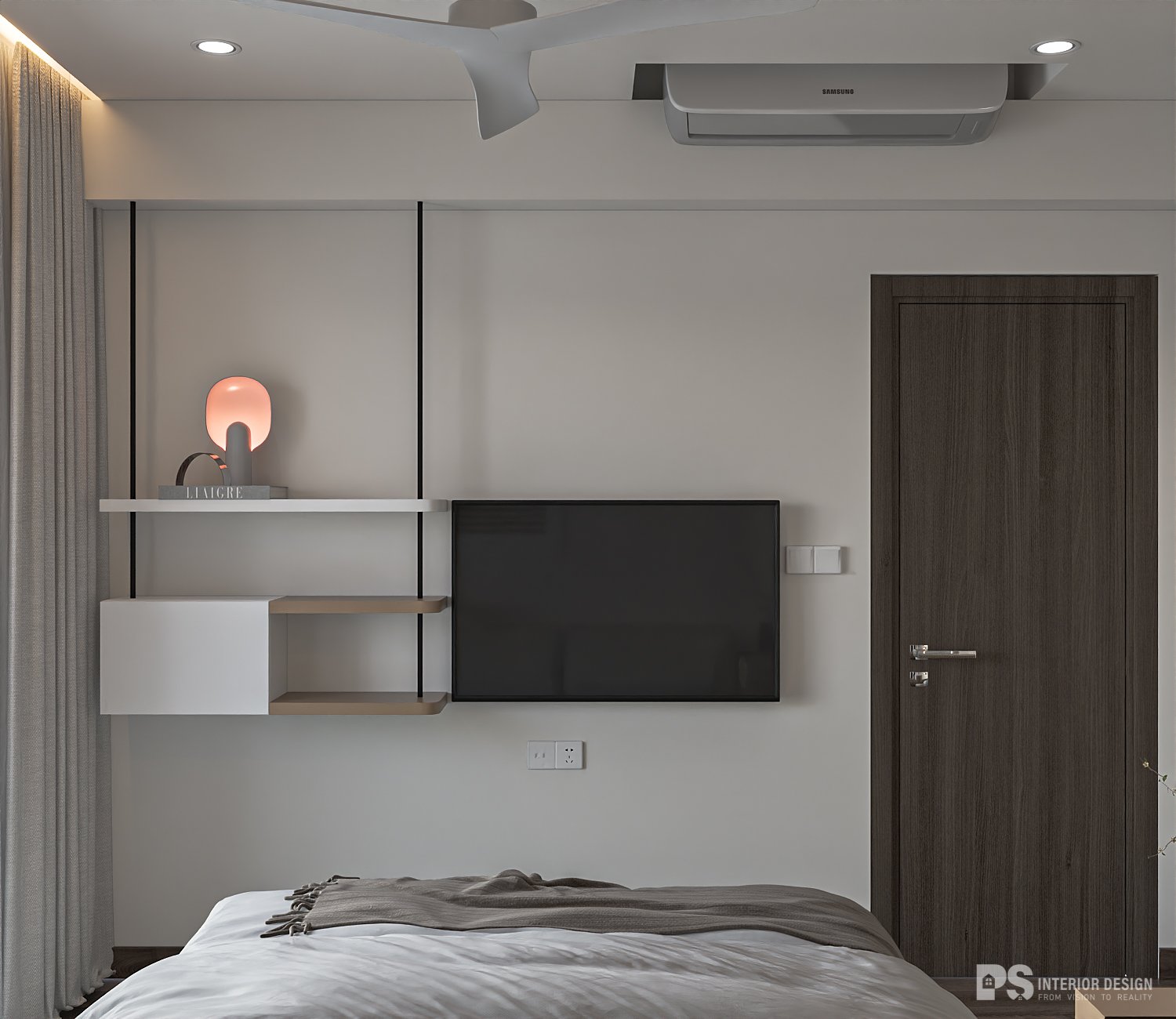 Phòng ngủ được thiết kế theo phong cách hiện đại với tông màu xám trắng tạo cảm giác thanh lịch và yên bình. Nội thất bố trí tổng thể đơn giản nhưng tinh tế, gồm hệ kệ tivi và tủ kín gọn gàng, màu sắc hài hòa với toàn bộ không gian. Trên tường đầu giường, một bức tranh nghệ thuật trừu tượng thêm vào điểm nhấn tinh tế và hiện đại, hoàn thiện vẻ đẹp tổng thể của căn phòng.
