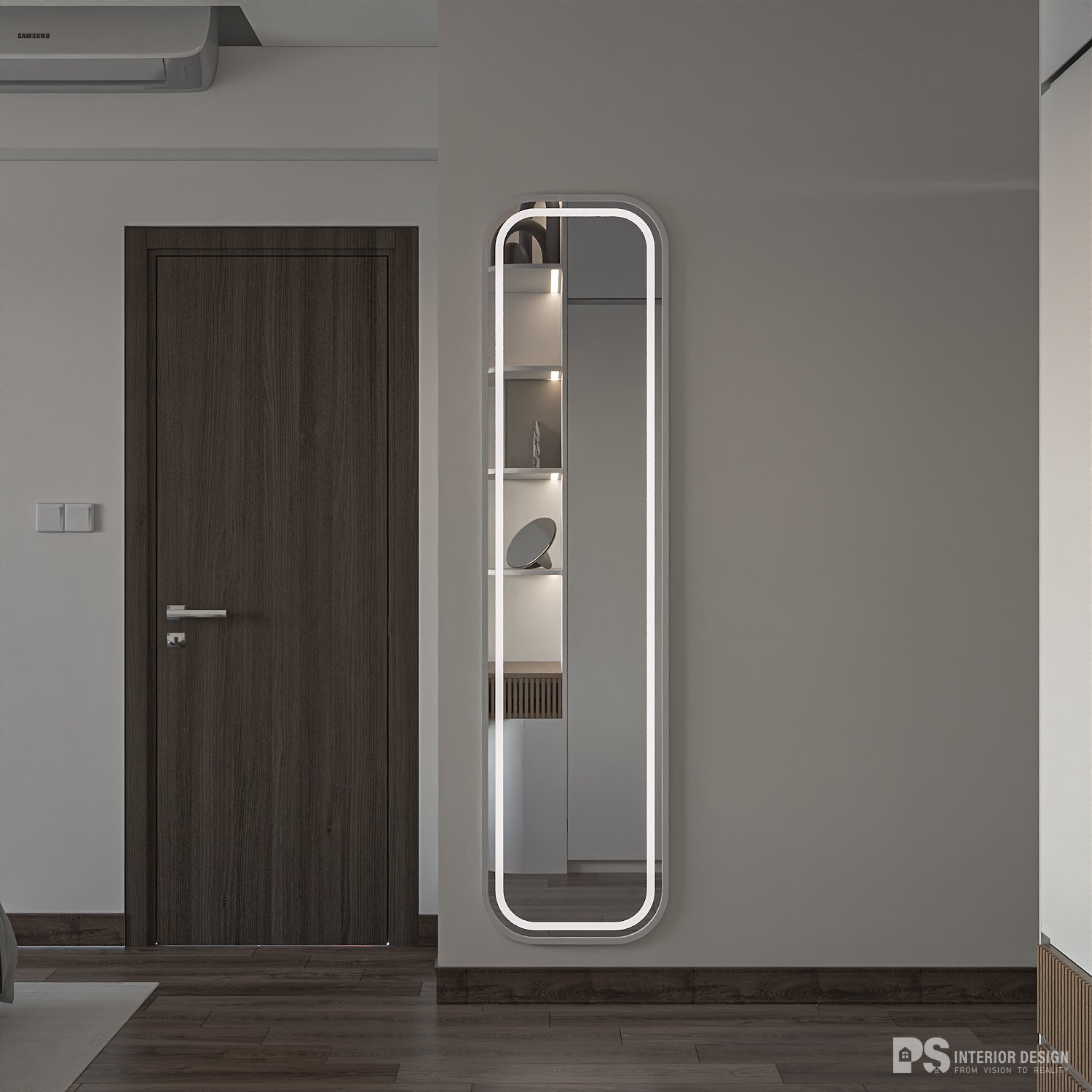 Cửa sổ rộng lớn chiếm một phần lớn bức tường, cho phép ánh sáng tự nhiên tràn vào phòng, làm nổi bật các chi tiết nội thất. Một chiếc gương soi dài được áp sát tường, không chỉ phục vụ nhu cầu sử dụng hàng ngày mà còn giúp không gian như được mở rộng hơn.