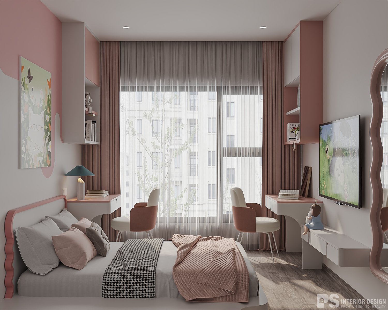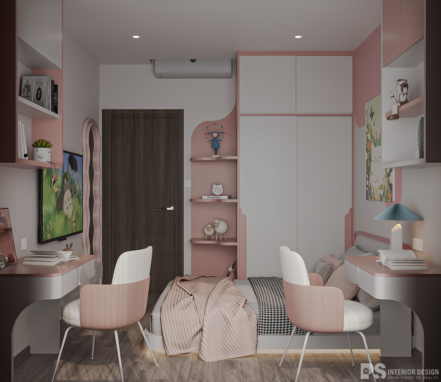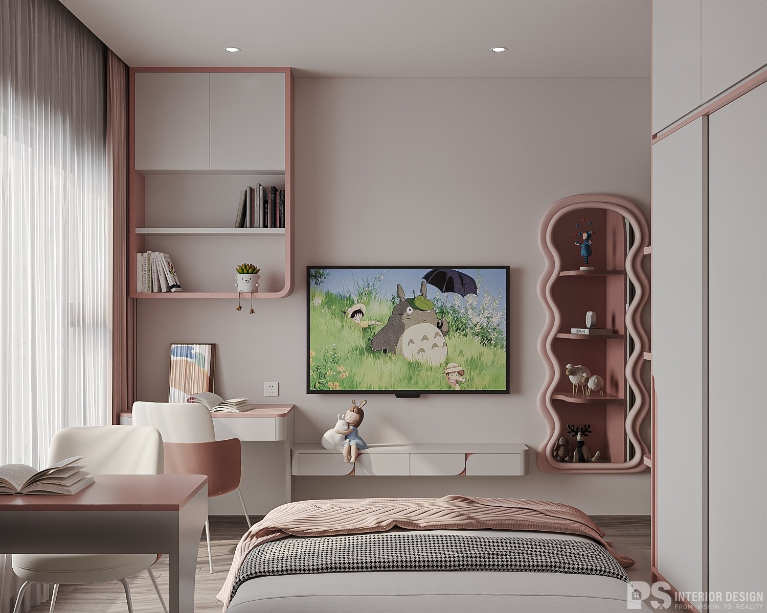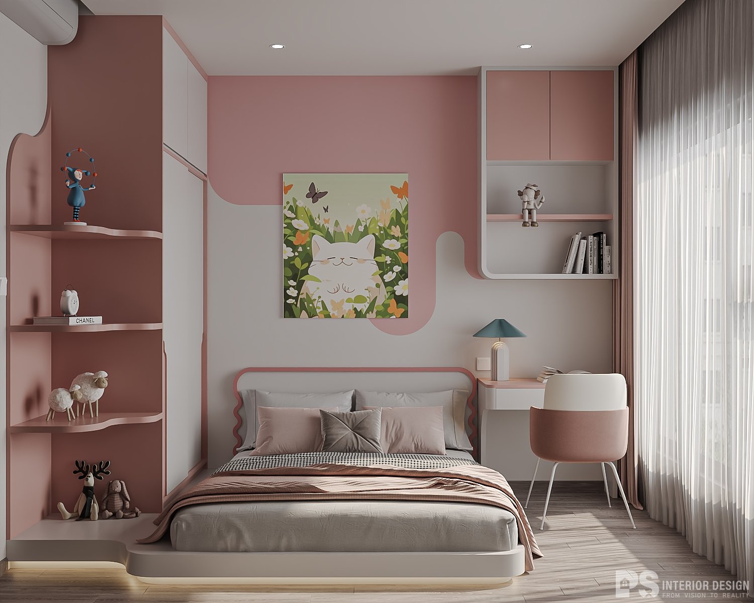 Phòng ngủ bé gái được thiết kế với tông màu hồng chủ đạo, mang lại cảm giác ấm áp và dễ thương. Nội thất được bố trí tổng thể đơn giản nhưng đầy duyên dáng với các đường cong mềm mại, tạo nên không gian thân thiện và an toàn cho trẻ nhỏ. Một bàn học tinh gọn và tiện lợi được bố trí hợp lý, giúp bé có không gian học tập thoải mái và tập trung. Trên tường đầu giường, một bức tranh hoạt hình đáng yêu với những nhân vật ngộ nghĩnh tạo điểm nhấn vui tươi và sinh động, hoàn thiện vẻ đẹp hồn nhiên, năng động của căn phòng.