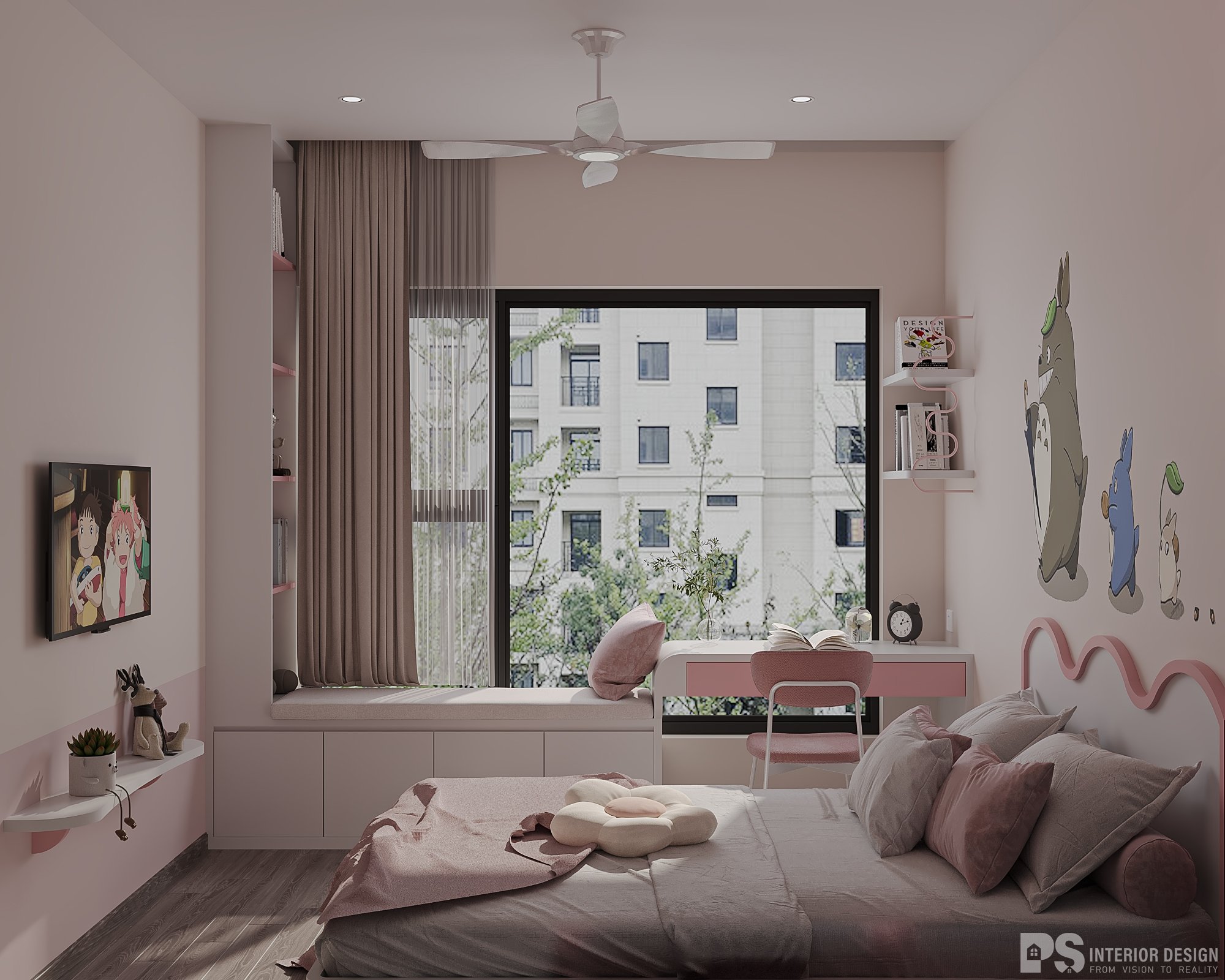 Phòng ngủ bé được thiết kế đồng bộ tone màu với tổng thế căn hộ. Cửa sổ lớn cho không gian thoáng rộng và bàn học kế giường tiện dụng để bé có thể ngủ sau khi học tập.