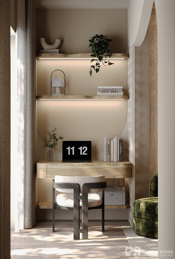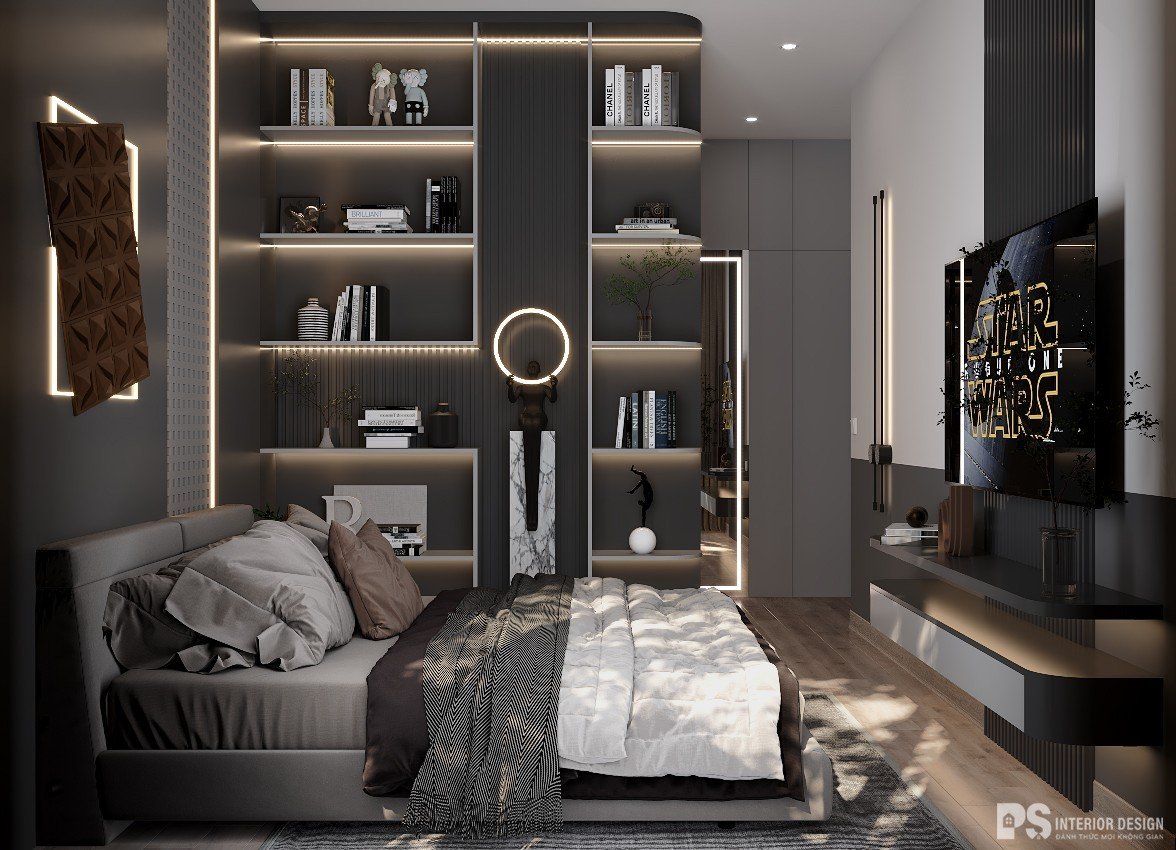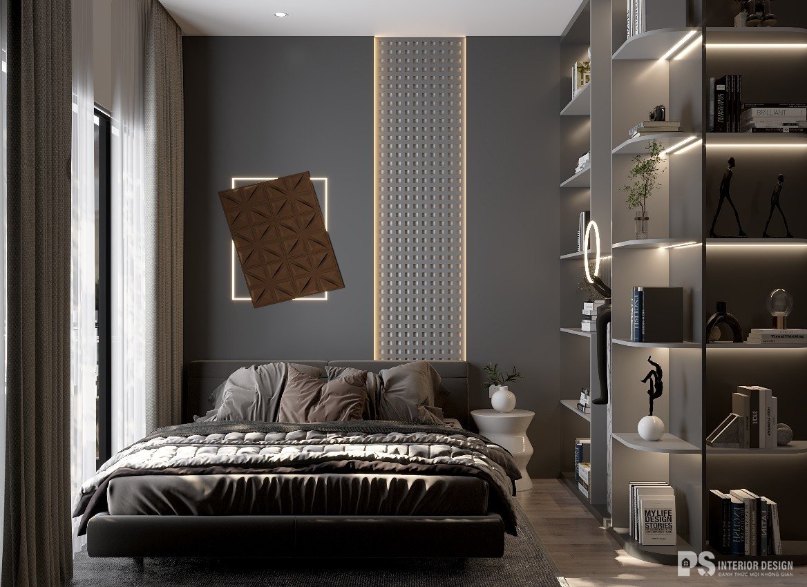Phòng ngủ thiết kế theo phong cách Wabi Sabi mang lại không gian yên tĩnh và thư thái, hoàn hảo cho việc nghỉ ngơi. Sử dụng các tông màu trung tính như xám, nâu và be, căn phòng toát lên vẻ ấm cúng và tĩnh lặng. Các vật liệu tự nhiên như gỗ, vải lanh và đá được lựa chọn kỹ lưỡng, từ giường ngủ, bàn trang trí đến các kệ sách, tất cả đều thể hiện sự mộc mạc và gần gũi.