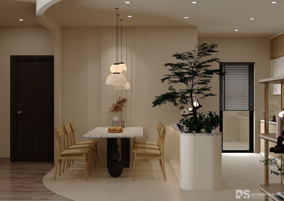 Khu vực phòng ăn được bố trí liền kề với phòng khách, tạo cảm giác liên thông và mở rộng không gian. Bộ bàn ghế ăn bằng gỗ với thiết kế tối giản nhưng tinh tế. Đèn trần hình tròn làm từ mây tre đan tạo điểm nhấn mềm mại và ấm cúng cho không gian ăn uống.