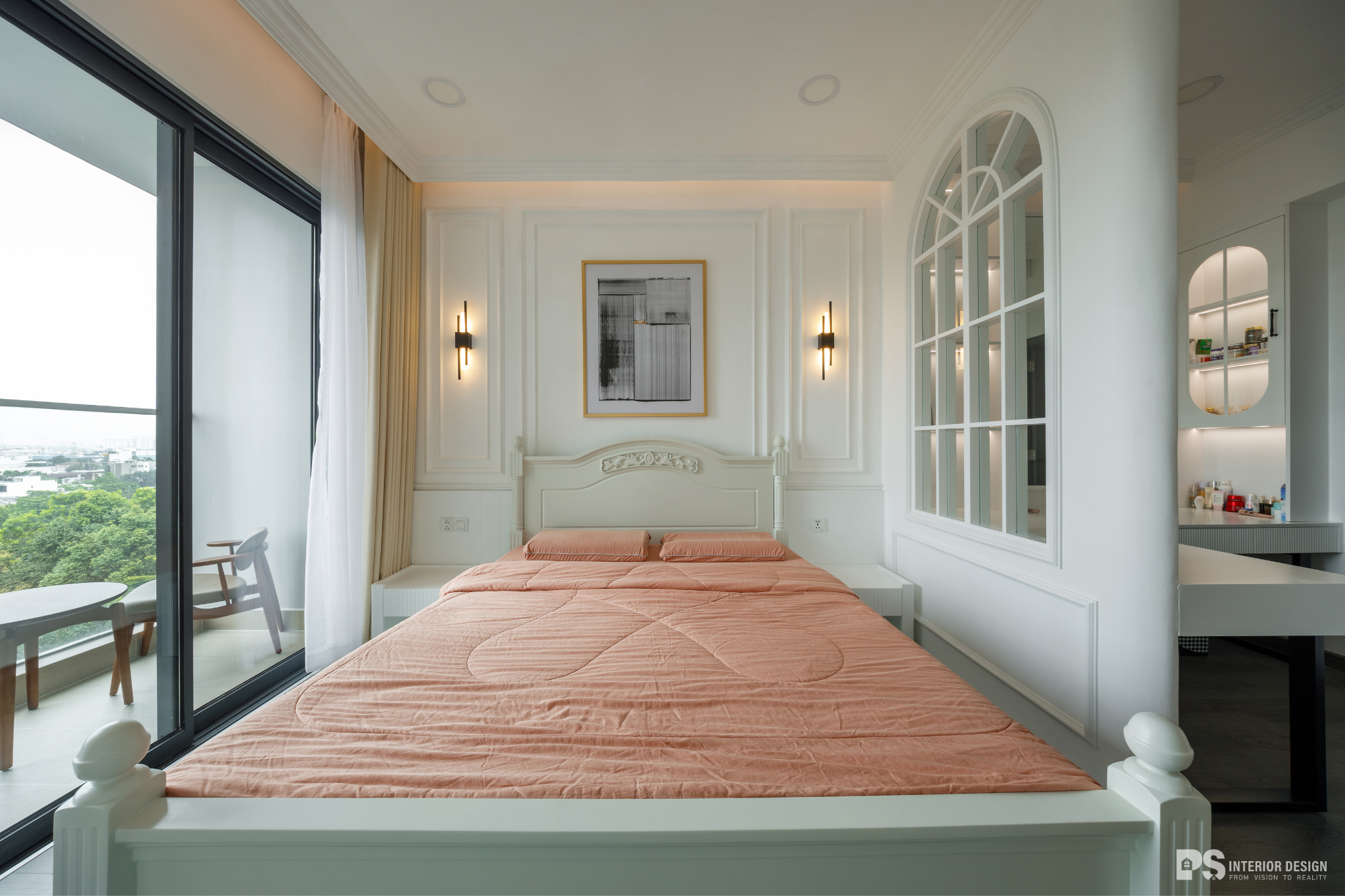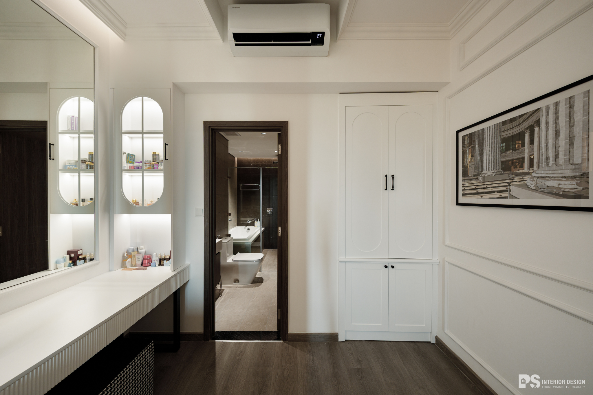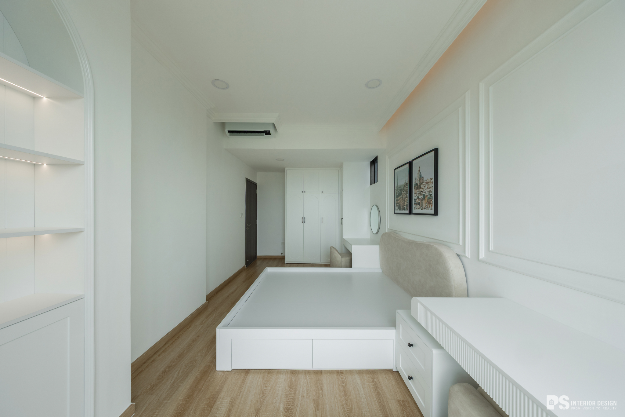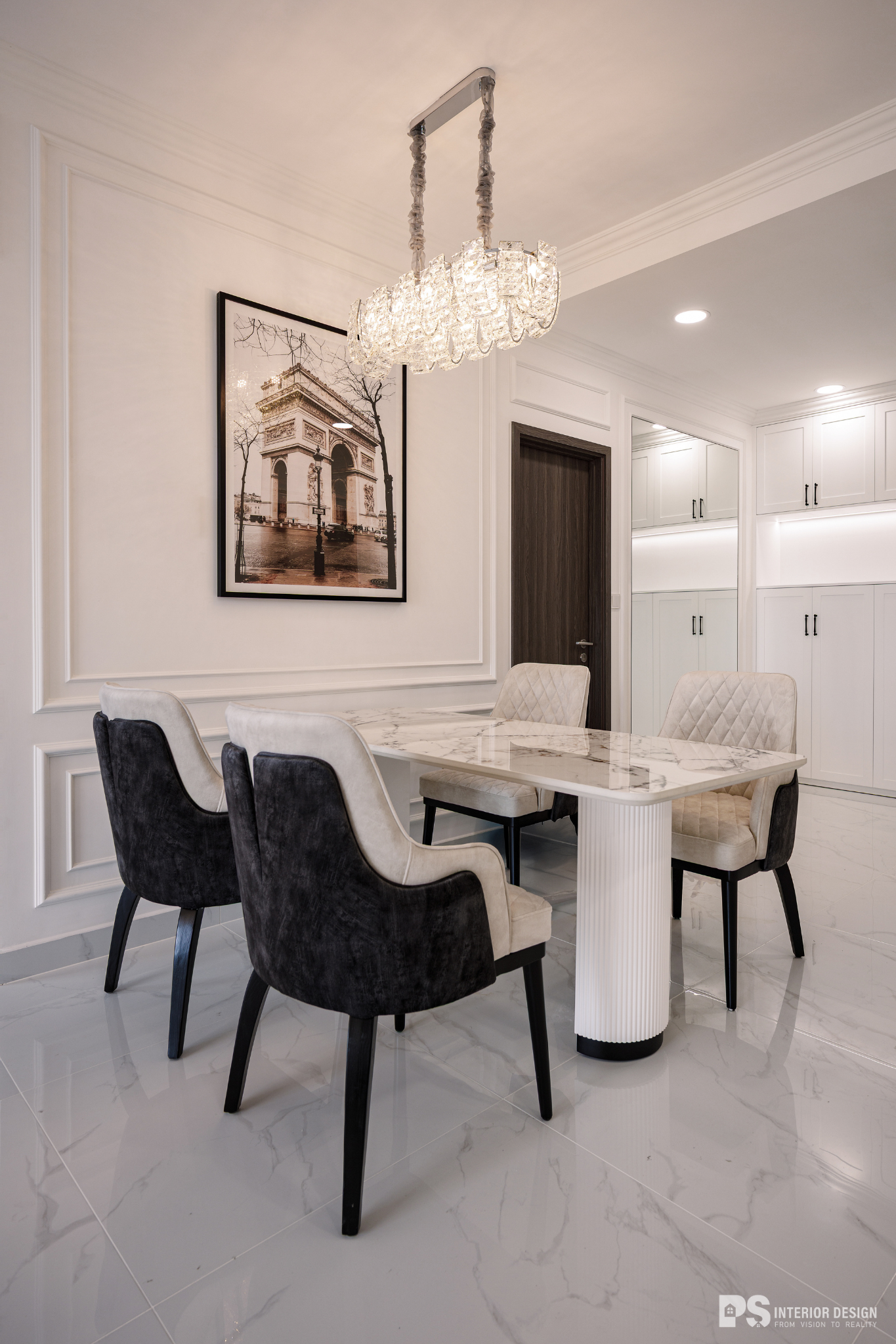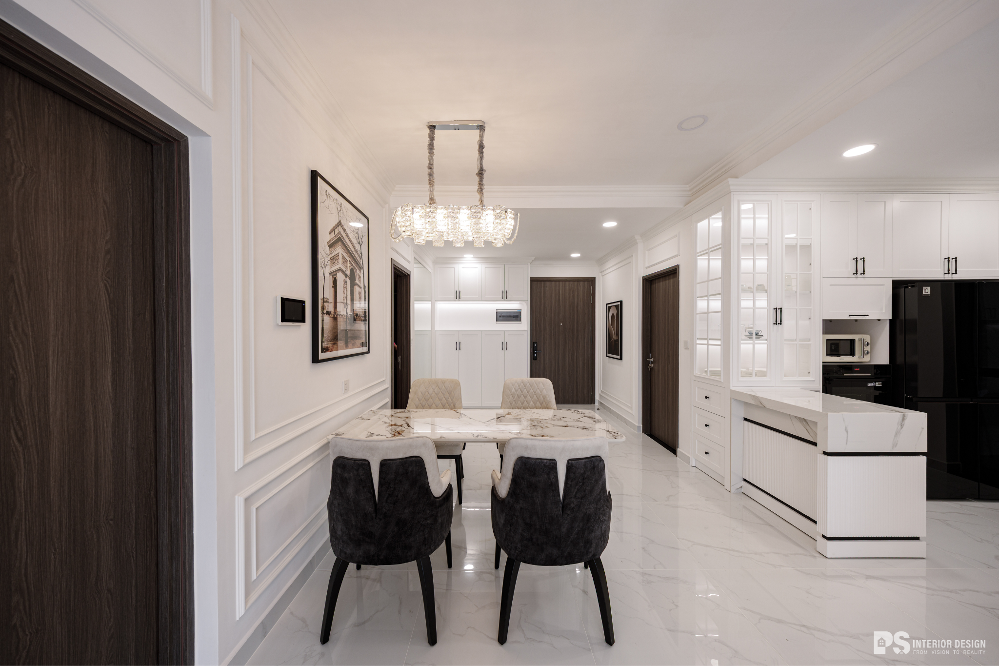 Ngôi nhà thật sự là nơi không chỉ để ở, mà còn là nơi chúng ta chạm vào sự bình yên bằng đôi mắt, lắng nghe sự tinh tế qua từng chuyển động rất khẽ của không gian. PS Interior Design hoàn thiện không gian nội thất cho căn hộ mang phong cách Tân Cổ Điển, lựa chọn tone trắng chủ đạo để tạo cảm giác rộng rãi và sang trọng.