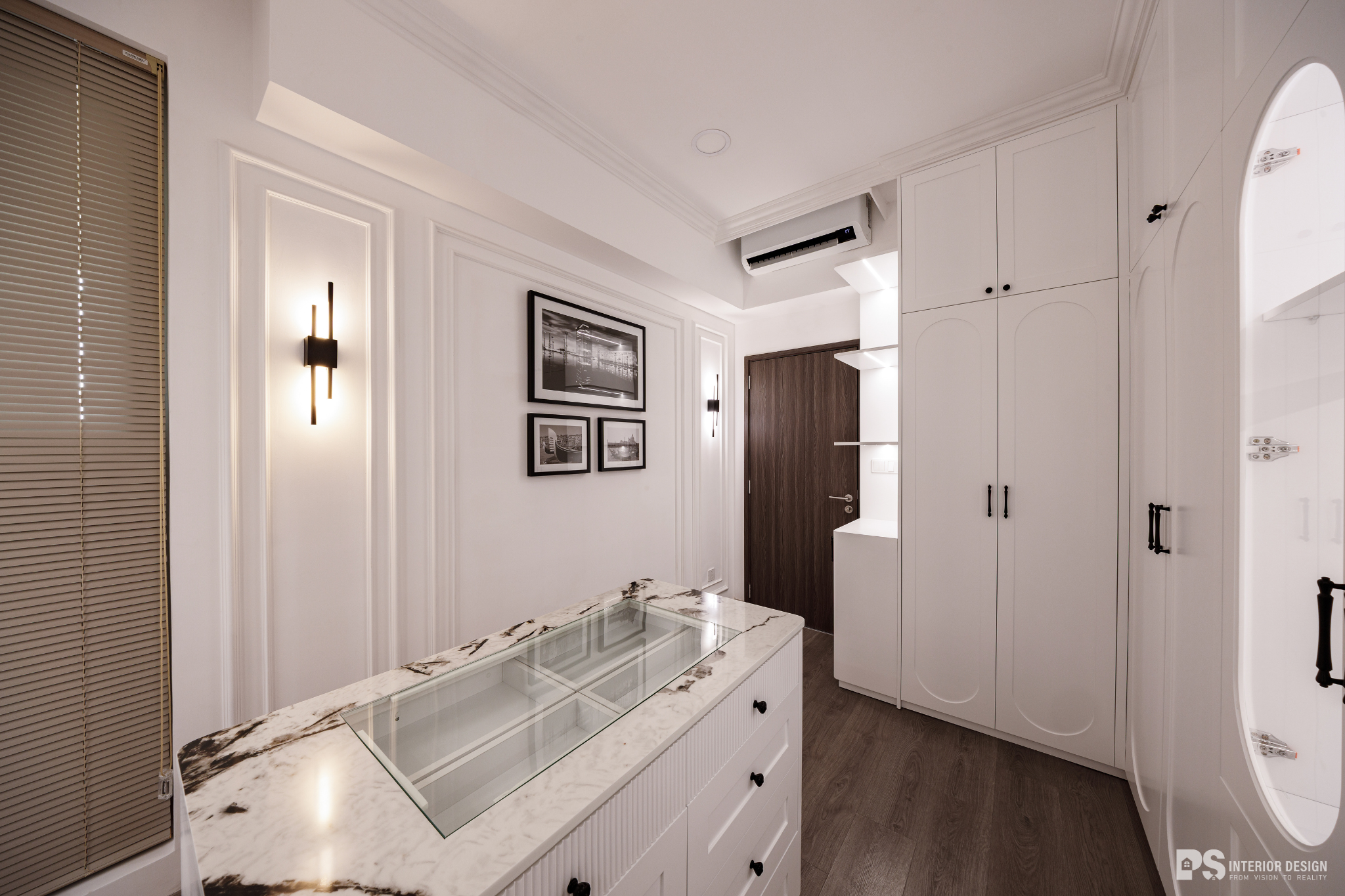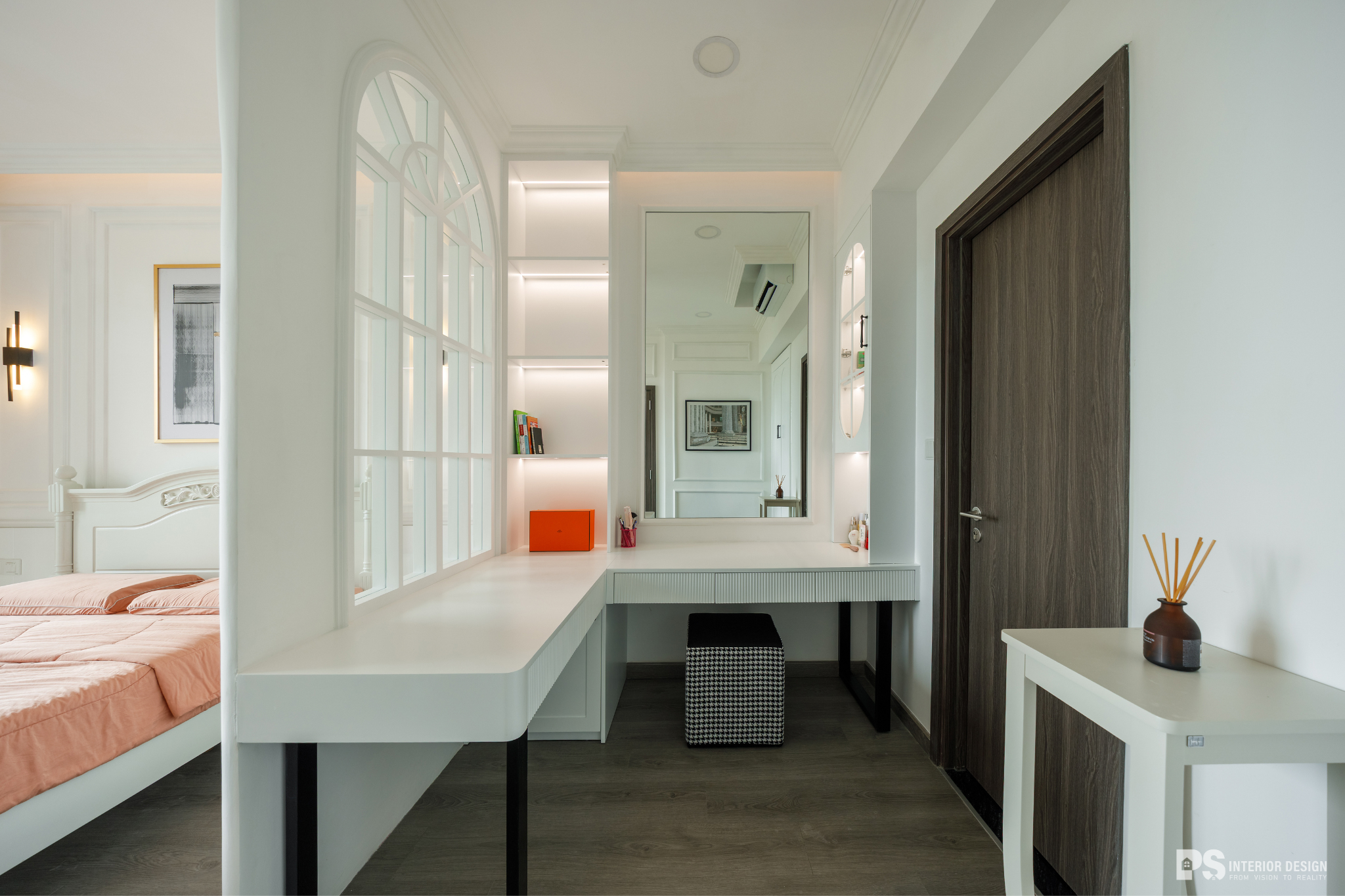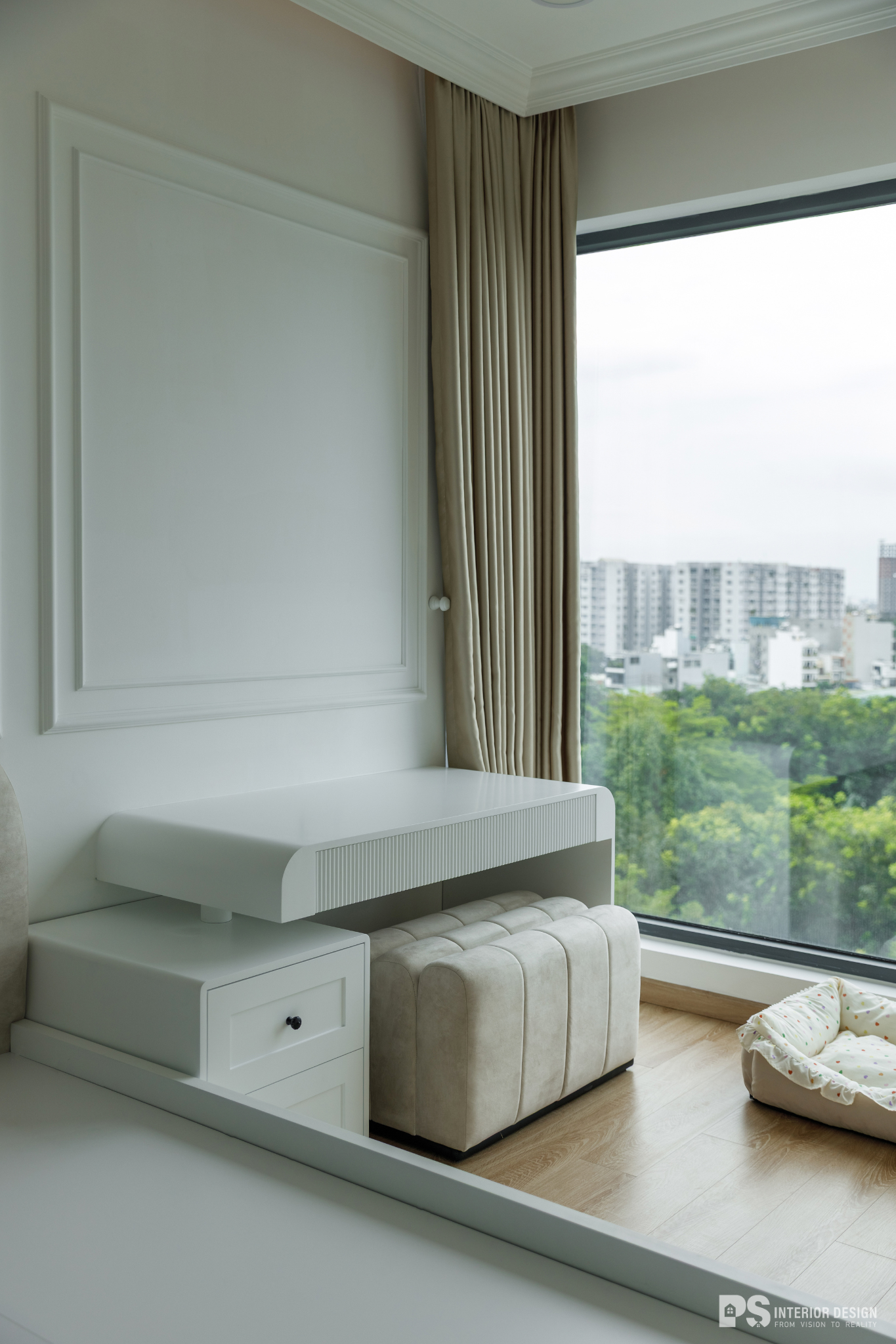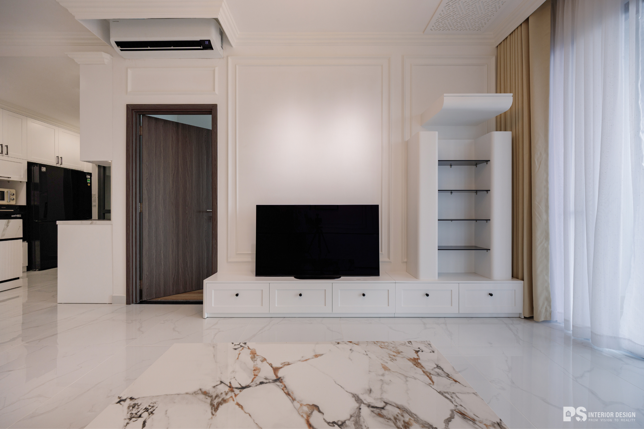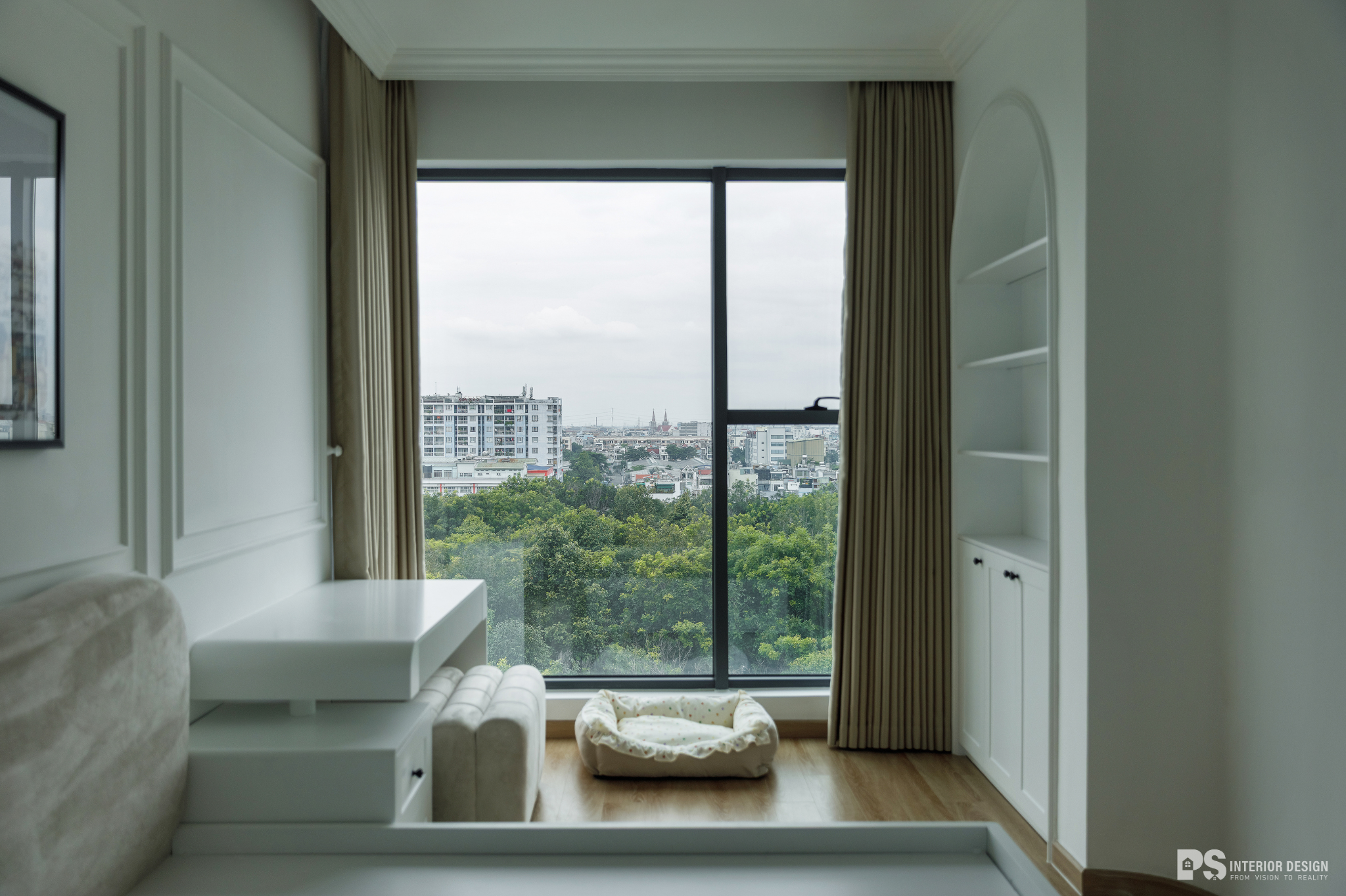 Ngôi nhà thật sự là nơi không chỉ để ở, mà còn là nơi chúng ta chạm vào sự bình yên bằng đôi mắt, lắng nghe sự tinh tế qua từng chuyển động rất khẽ của không gian. PS Interior Design hoàn thiện không gian nội thất cho căn hộ mang phong cách Tân Cổ Điển, lựa chọn tone trắng chủ đạo để tạo cảm giác rộng rãi và sang trọng.