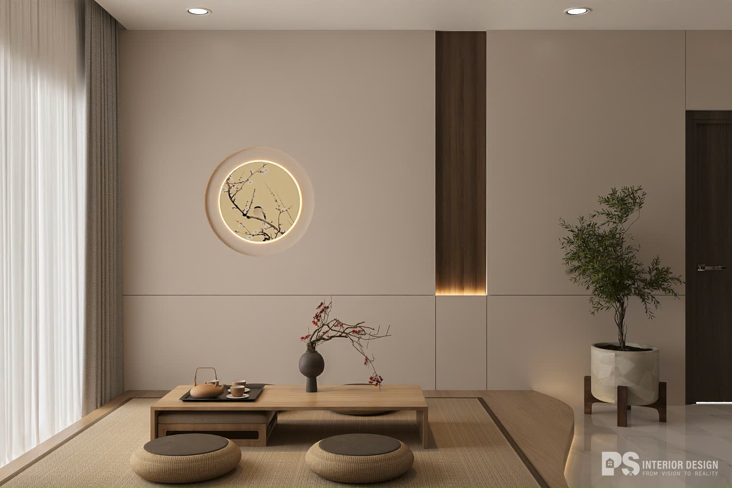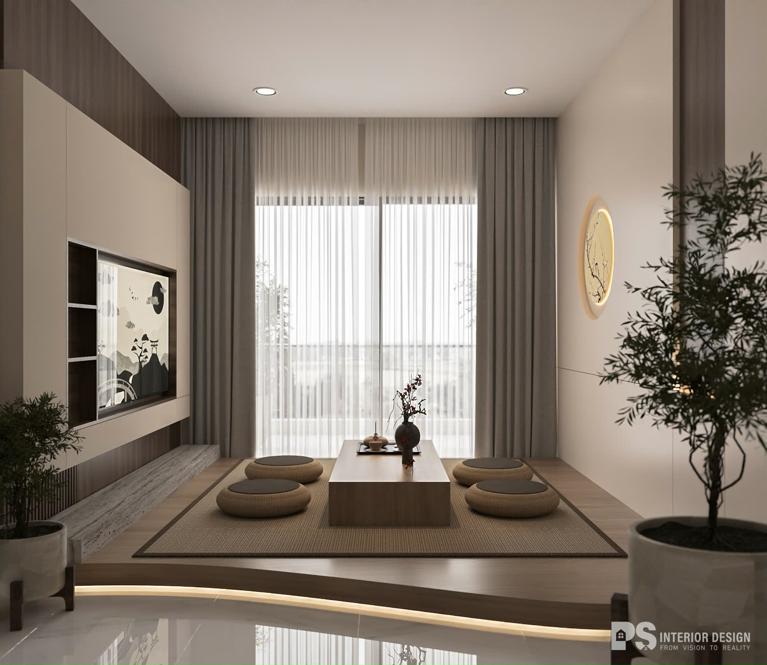 ❀ Tại phòng khách, thiết kế không gian mang hơi thở văn hóa trà đạo 🍵, tạo nên dấu ấn đặc trưng cho Gia Chủ. Sofa thông thường được thay thế bằng đệm ngồi bệt, cùng thiết kế giường phản (cảm hứng từ tatami): mang tầng ý nghĩa sâu sắc, sự kết nối với mặt đất hướng con người về cội nguồn, gắn bó với tự nhiên.