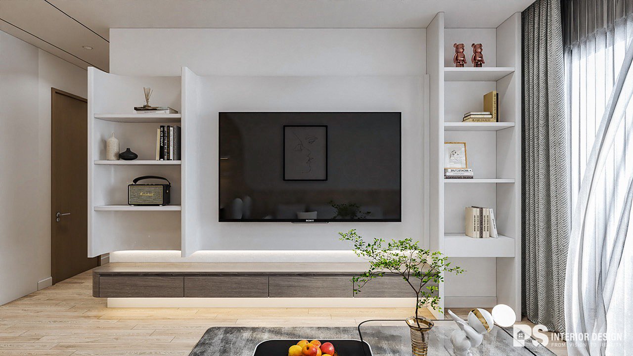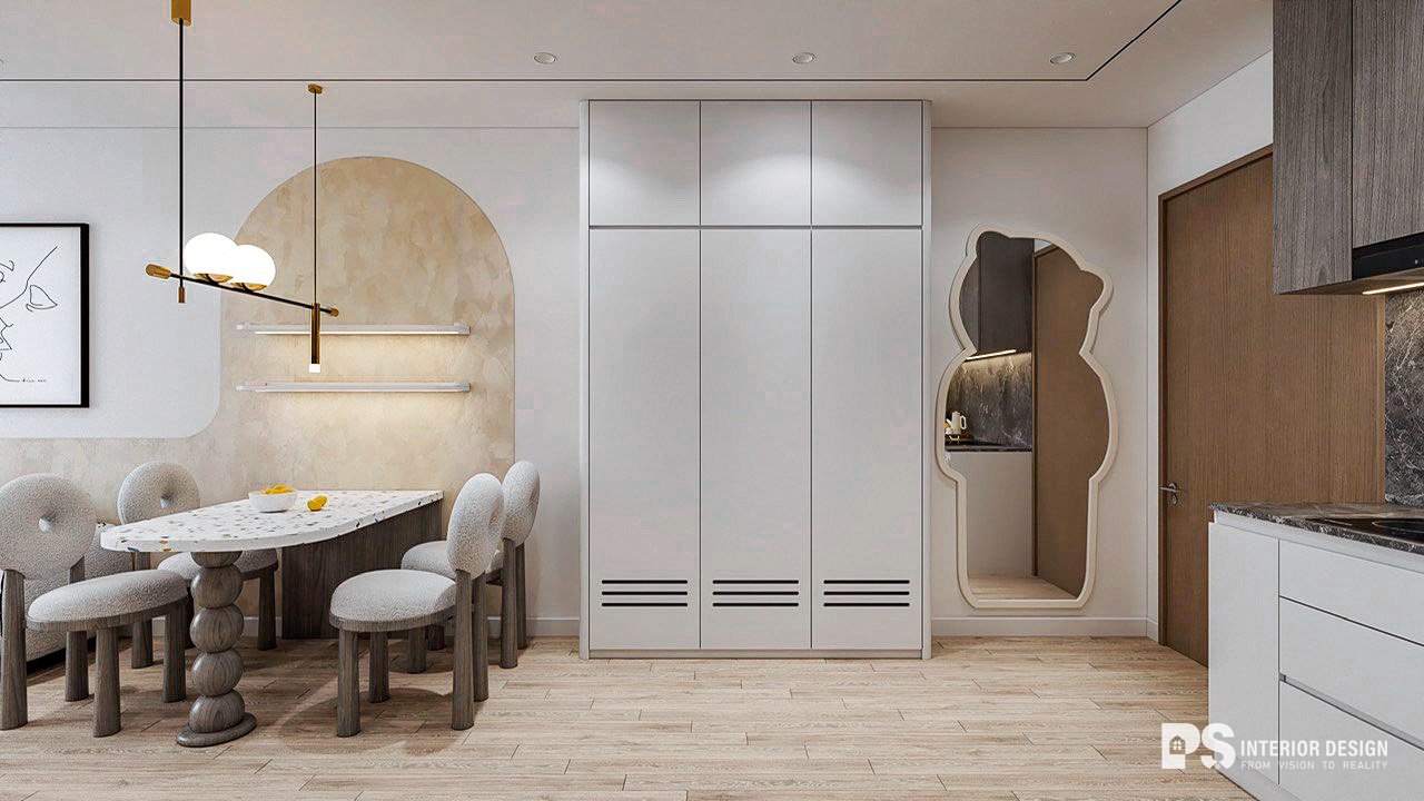 Điểm nhấn cho căn hộ là vẻ đẹp Wabi Sabi với các chi tiết nội thất trẻ trung, độc đáo. Công năng và tiện ích cũng được PS chú trọng bằng việc bố trí kệ tủ đầy đủ tại nhiều khu vực khác nhau.