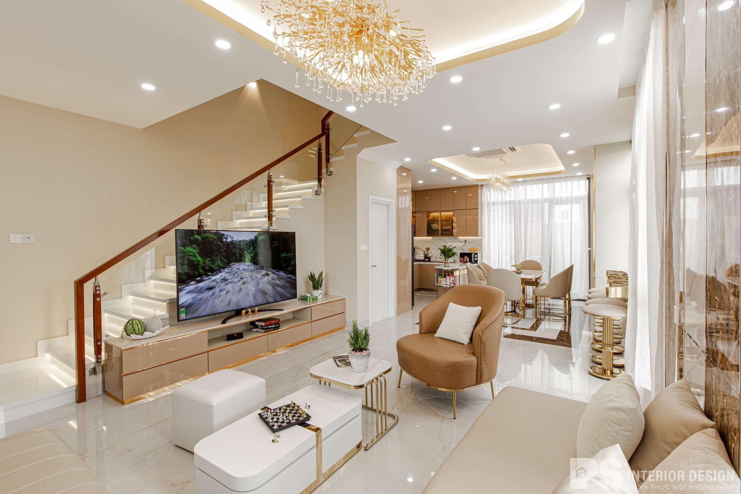 Gam màu trung tính và chất kính chủ đạo tạo nên không gian nhà phố Lavila Nam Sài Gòn tinh tế, thoáng đãng. Màu nâu và be kết hợp mang đến tính hài hòa, dễ chịu, bởi sự đồng điệu về sắc độ. Kính là chất liệu chạy xuyên suốt tổng thể, vừa giúp không gian sáng thoáng, vừa mang lại nét quyền quý, cao sang. Vách ốp sau sofa - PVC giả đá kết hợp ron inox mạ đồng là điểm nhấn đặc sắc cho phòng khách. Ngoài ra, đèn chùm pha lê tinh xảo là trung tâm điểm nhìn tôn vinh sự trang trọng, ấn tượng cho không gian.