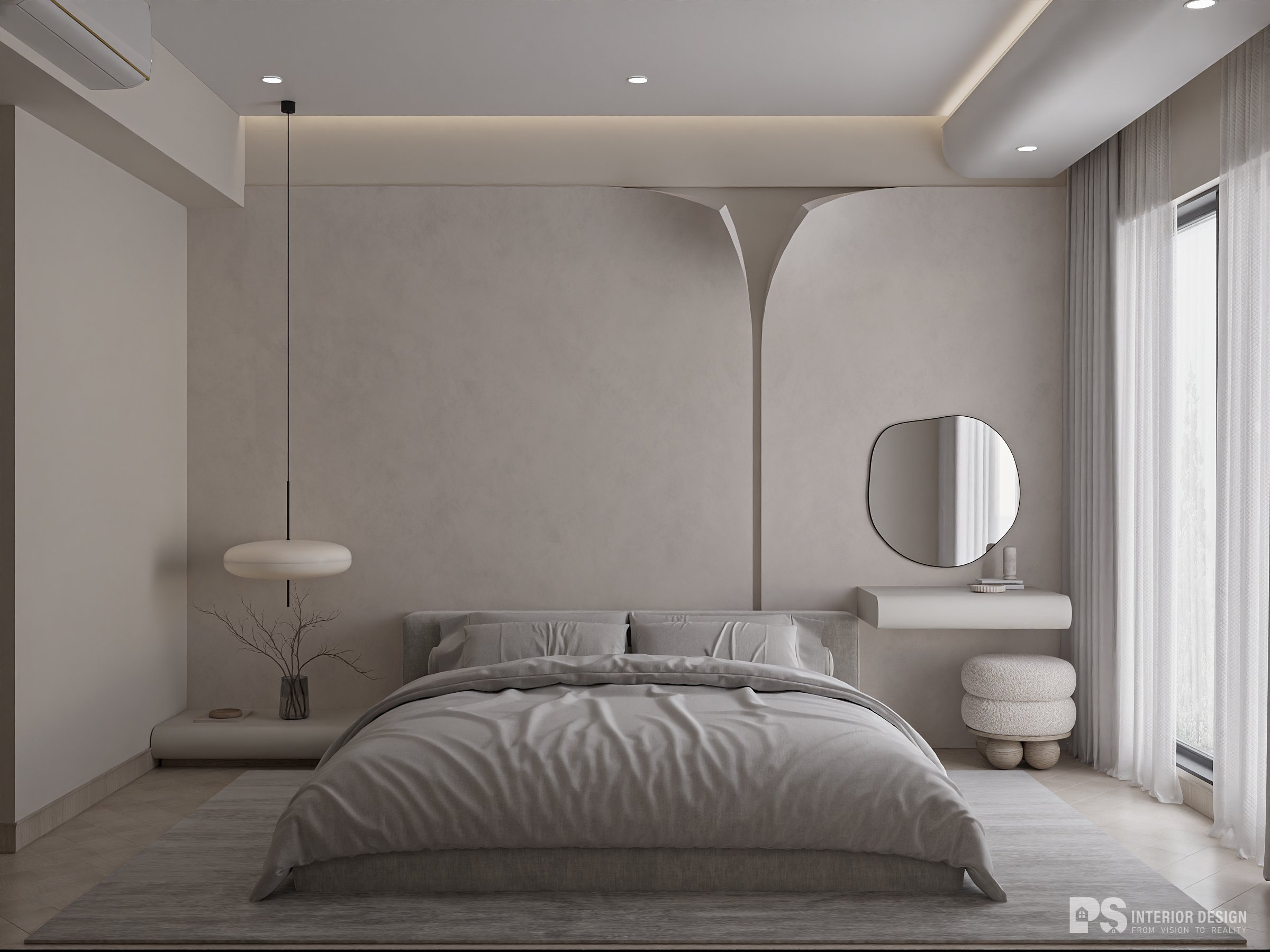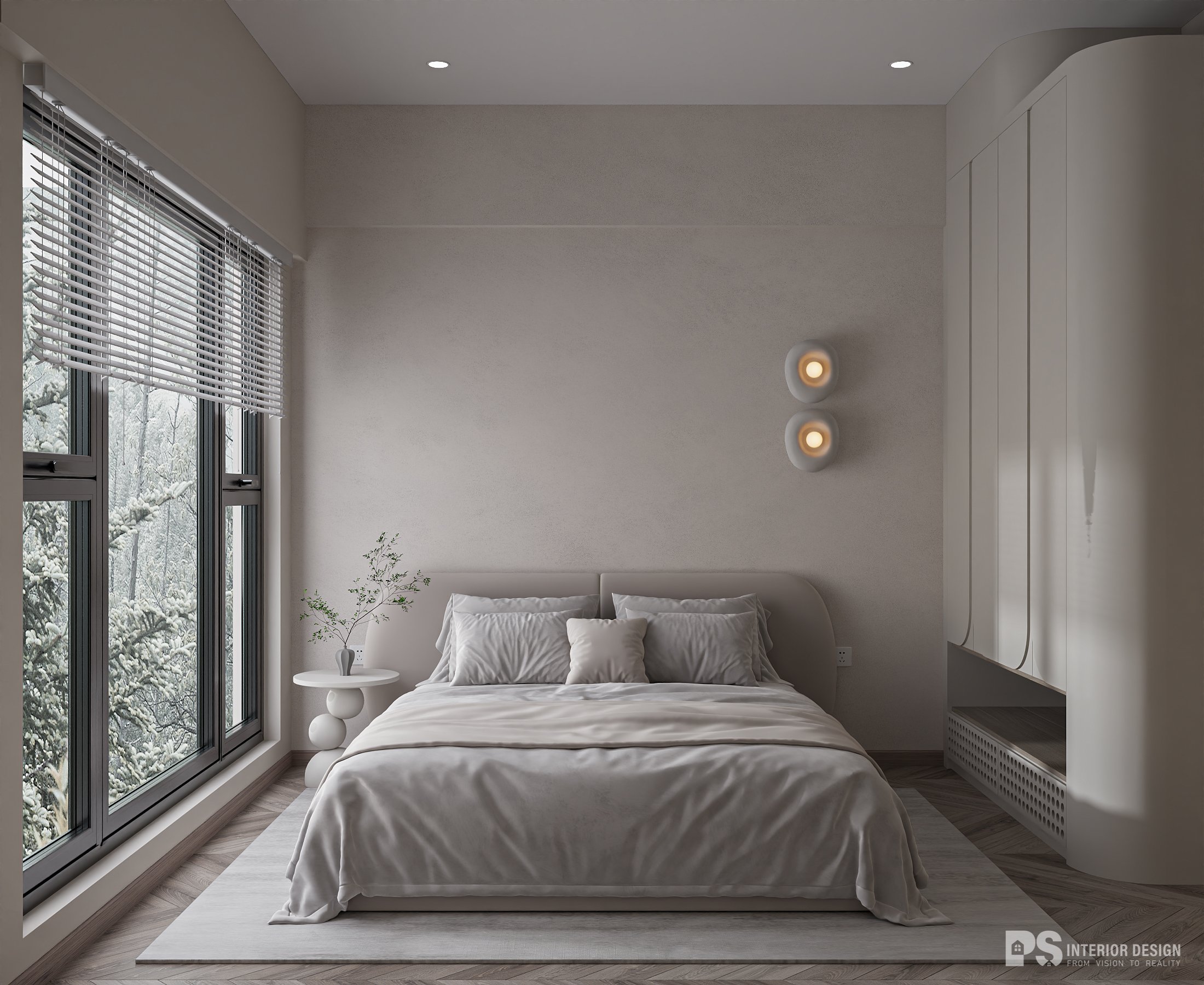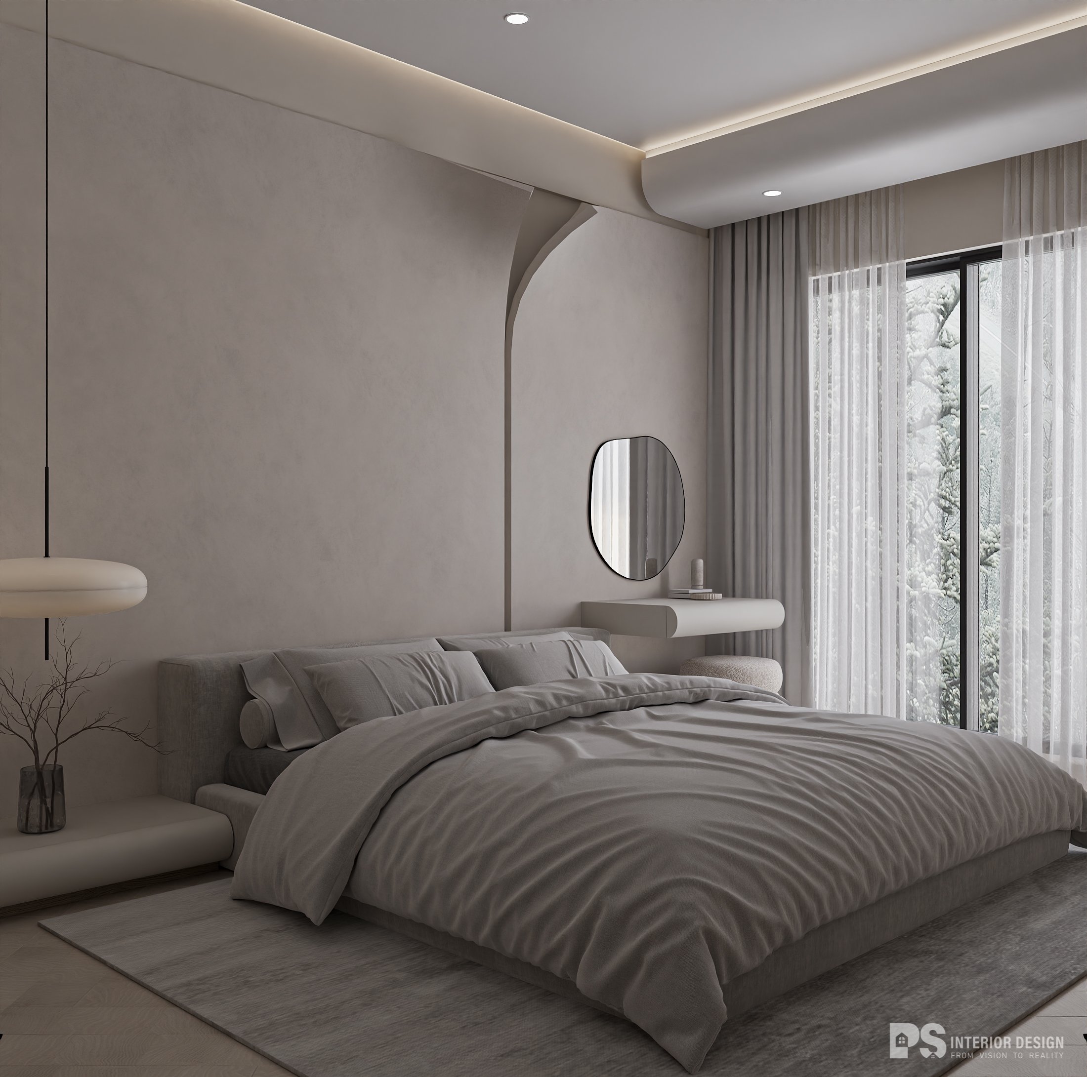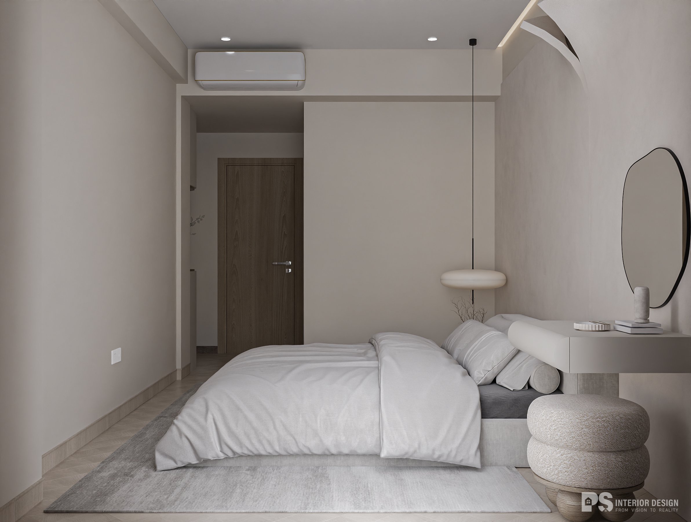 Trong phòng ngủ phong cách Minimalism, không gian được tạo ra với sự tĩnh lặng và thanh bình. Những gam màu trung tính tạo nên một bức tranh yên bình, giúp tâm hồn thả lỏng và thư giãn sau những ngày làm việc căng thẳng. Mỗi chi tiết trong không gian đều được chọn lọc cẩn thận, từ giường ngủ đến những đồ trang trí, tạo nên một không gian gọn gàng và tinh tế.