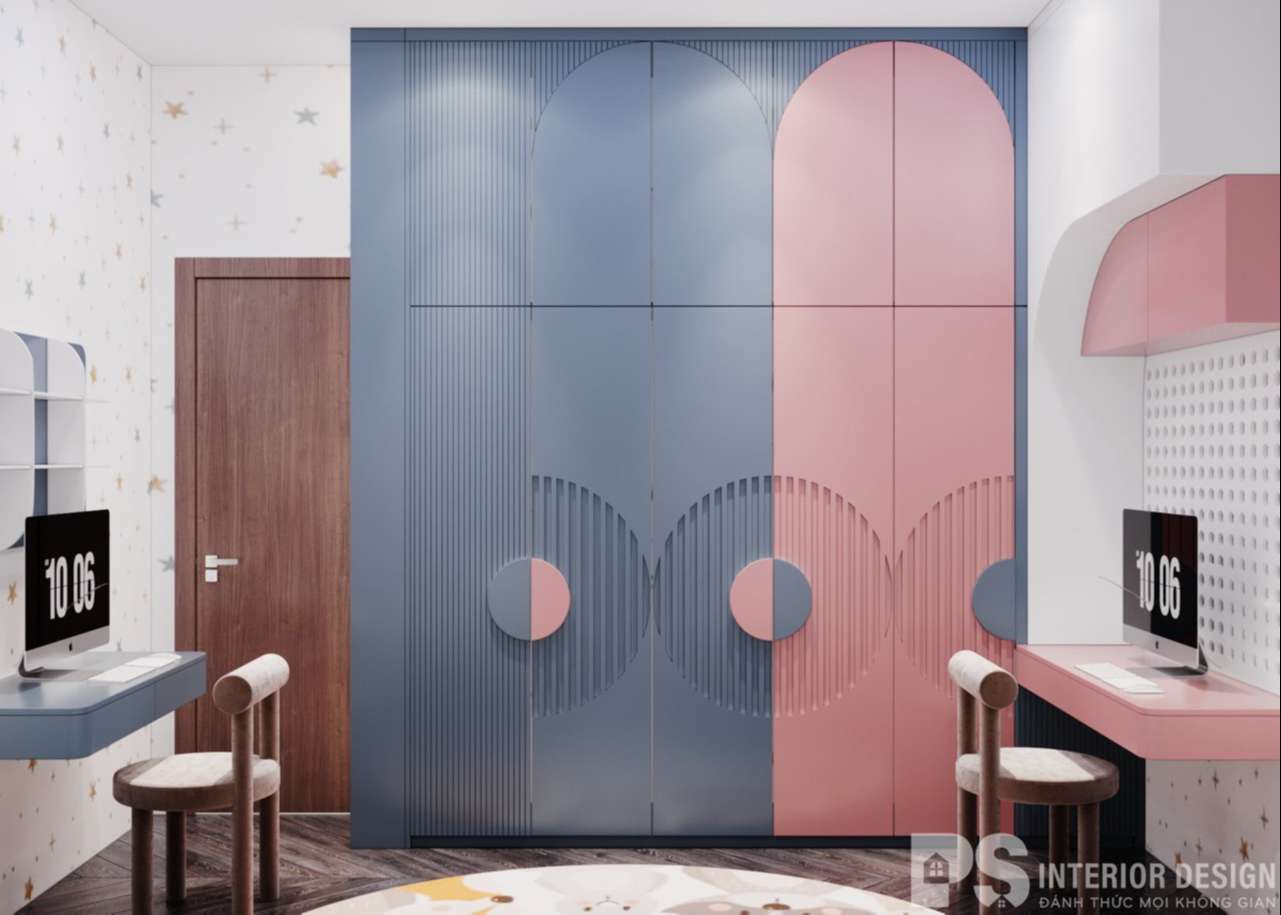 Phòng ngủ cho bé có tone màu tươi mát, đáng yêu được thiết kế thông minh với lối bố trí song song cả hai giường, bàn học và tủ quần áo nhưng vẫn đảm bảo giữ được diện tích, không gian sinh hoạt vui chơi cho bé.