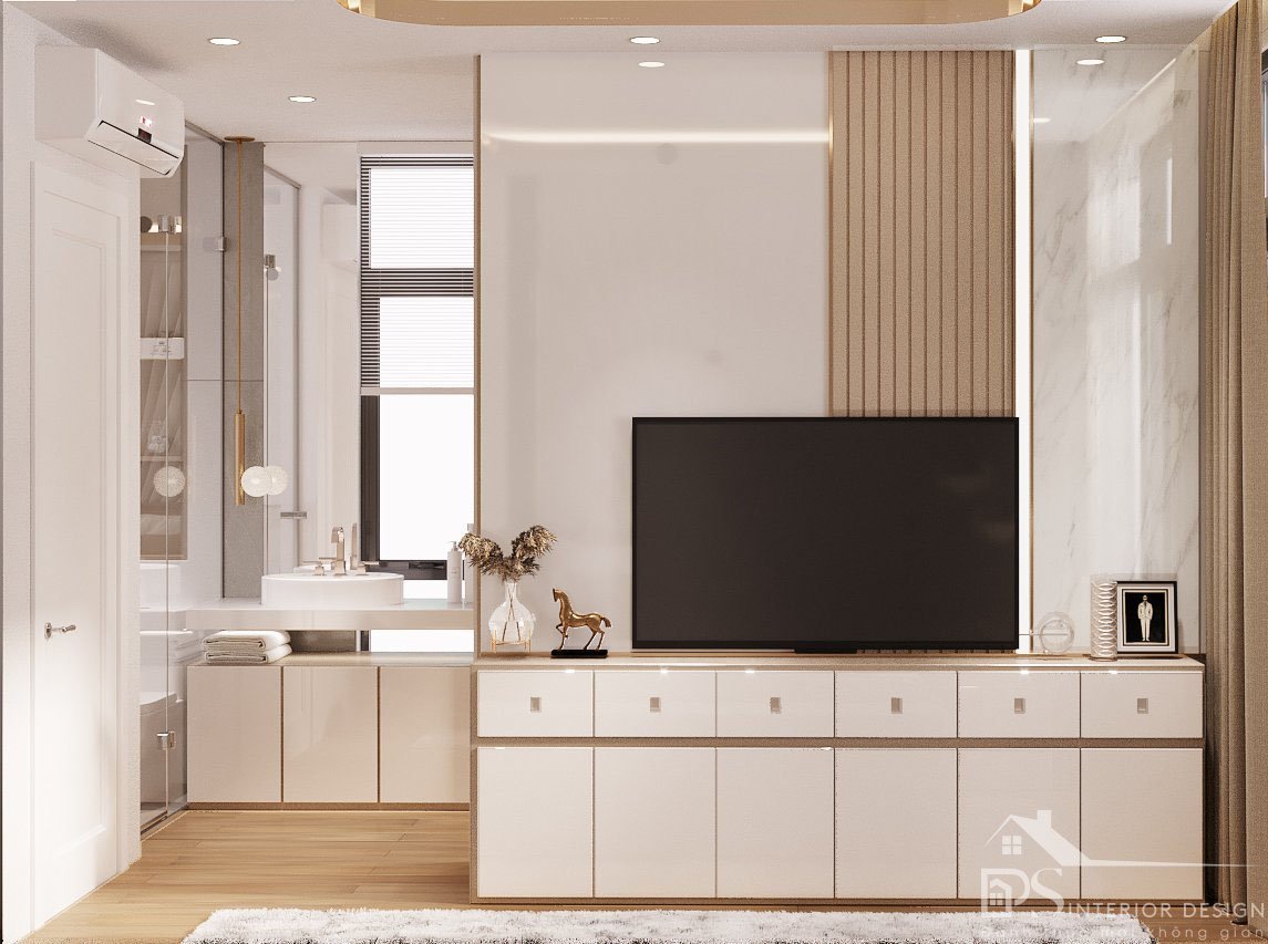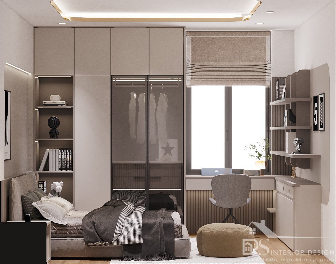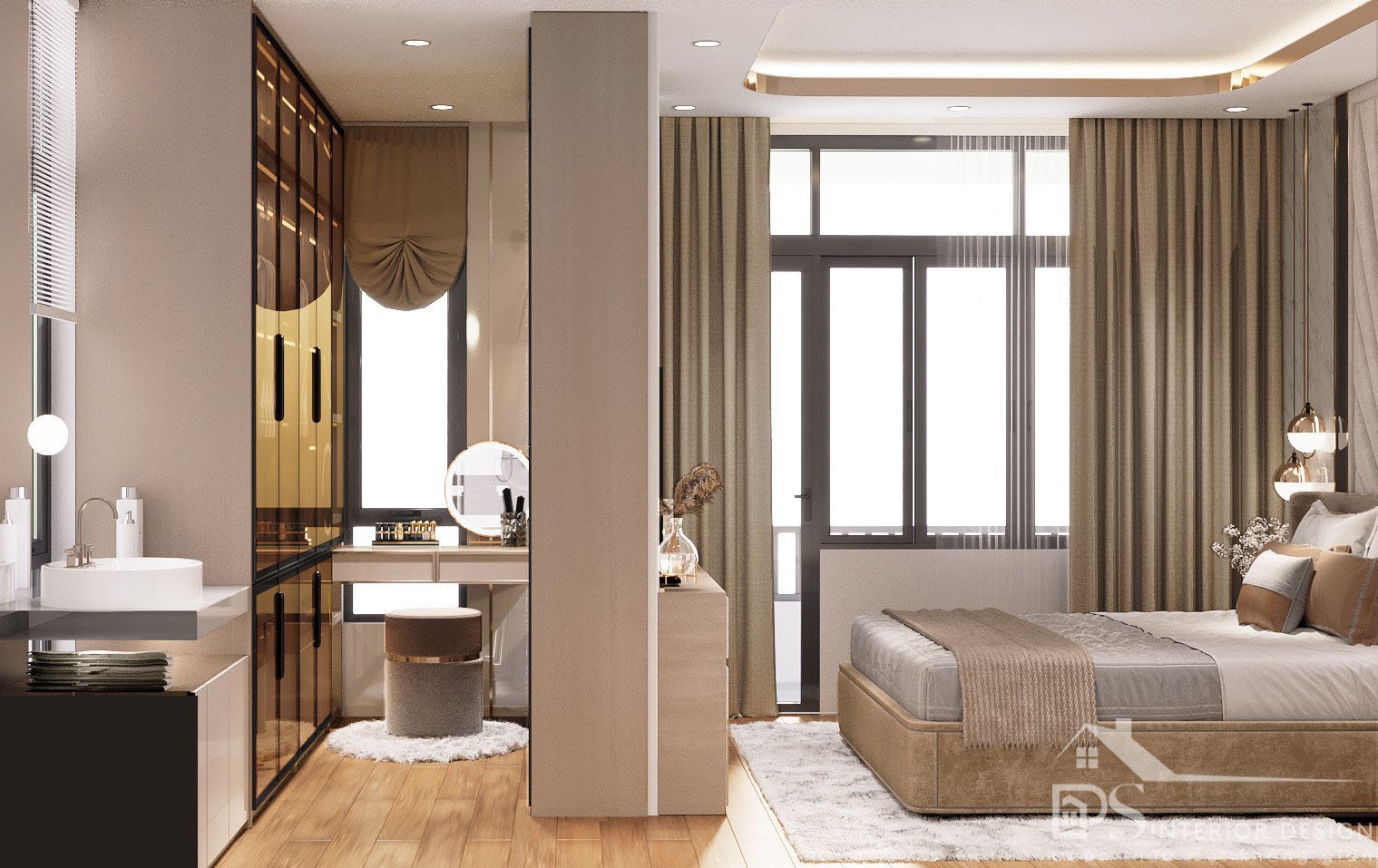 Phòng ngủ master có diện tích rộng rãi và được bố trí độc đáo hai trong một với không gian phòng ngủ và phòng thay đồ, tone màu sắc trung tính trẻ trung được đồng bộ toàn bộ căn phòng giúp căn phòng vừa sang trọng, tinh tế vừa đầy đủ tiện nghi và đồng thời giúp gia chủ có thể dễ dàng sinh hoạt nghĩ ngơi, thư giản trong chính căn phòng của mình.