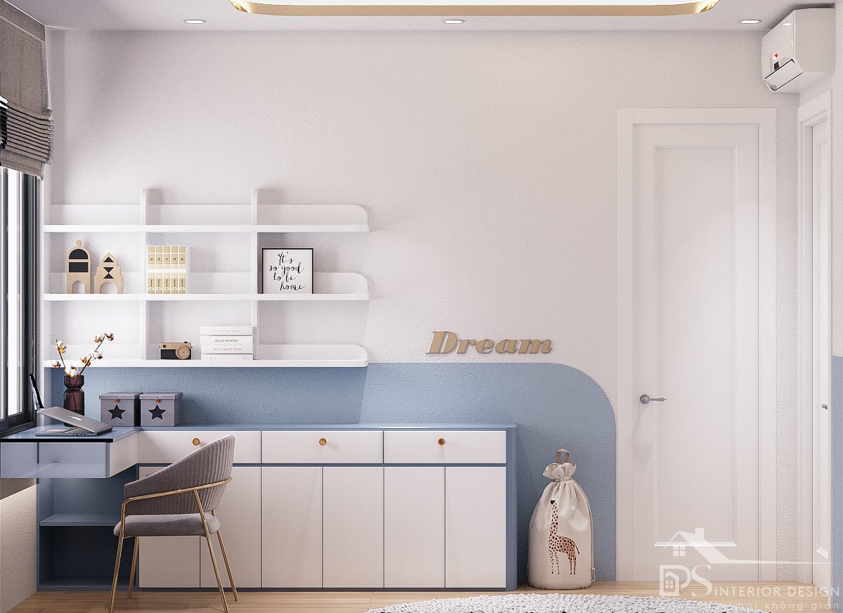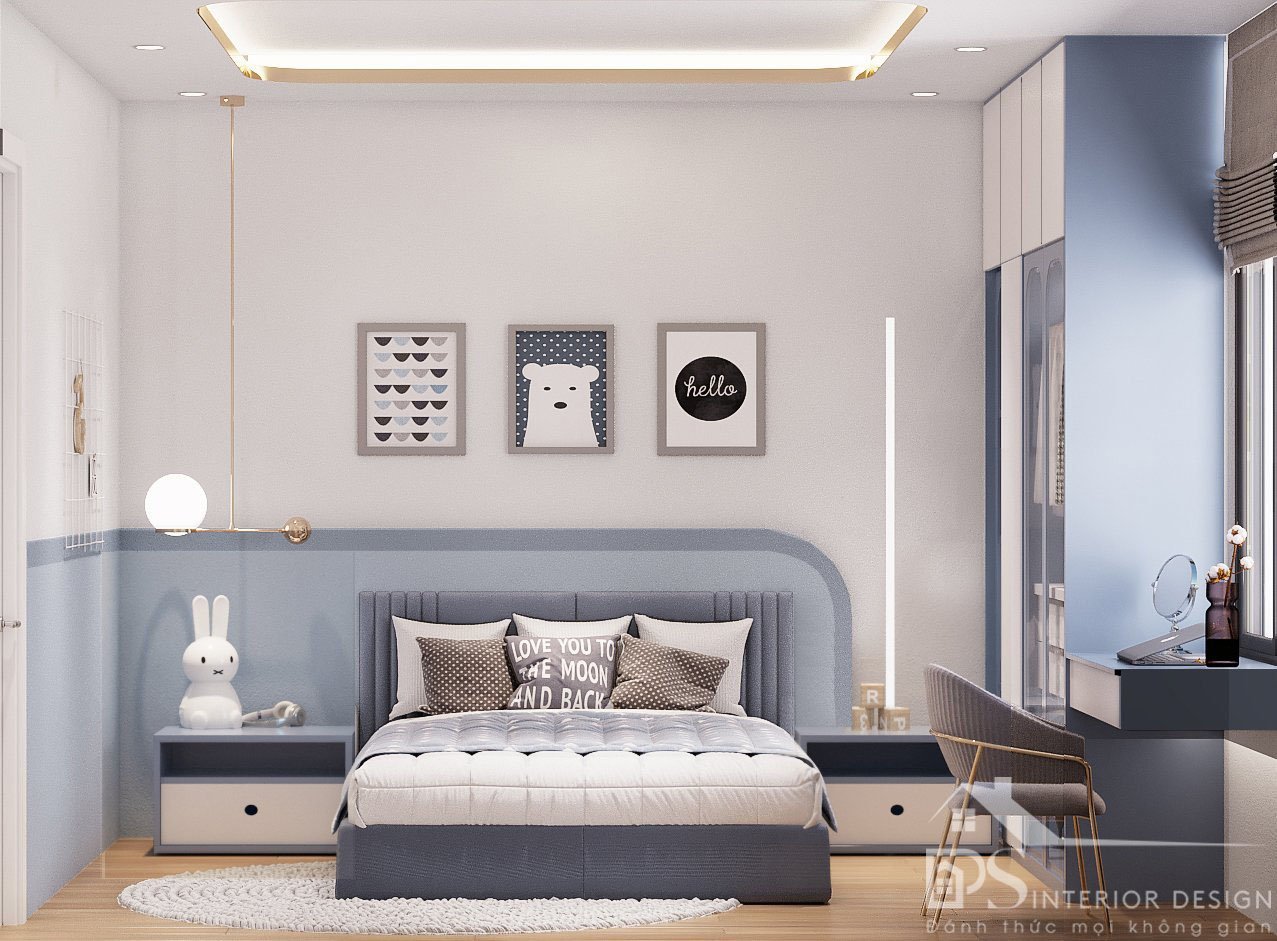Với tone màu sắc xanh cá tính, tươi mát, căn phòng được trang trí vô cùng đáng yêu và được bố trí thông minh tối ưu diện tích giúp bé có thể tự do sáng tạo, vui chơi trong căn phòng của mình.