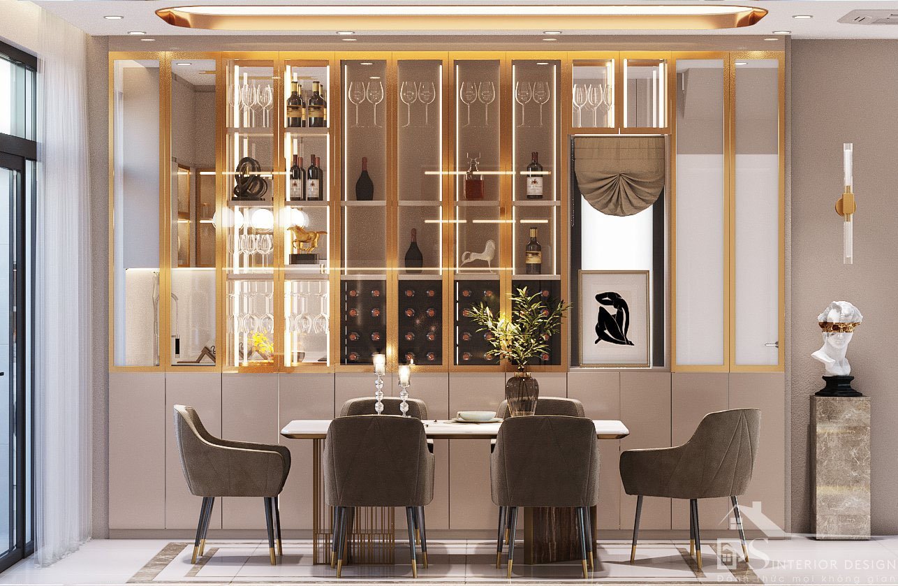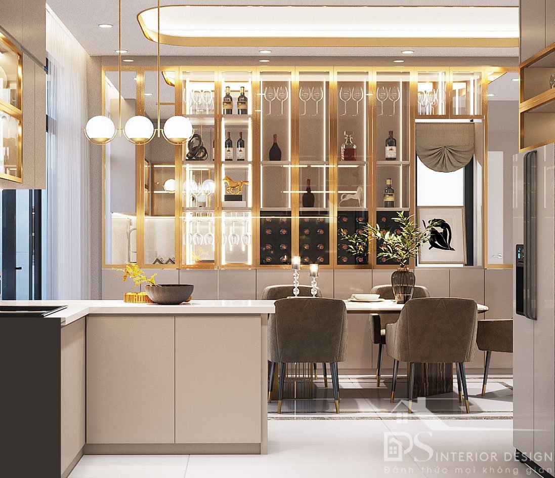 Phòng bếp được thiết kế thông thoáng với không gian mở kết nối với các khu vực bên ngoài, căn phòng được PS thiết kế với đầy đủ các nội thất và tập trung vào công năng giúp việc nấu ăn và sinh hoạt có thể thuận tiện hơn bao giờ hết. Đặc biệt căn phòng vô cùng nổi bật với tủ rượu có tone màu chủ đạo là màu vàng đồng kết hợp với hệ thống đèn led và cánh kính giúp không gian phòng bếp sang trọng thêm bội phần.