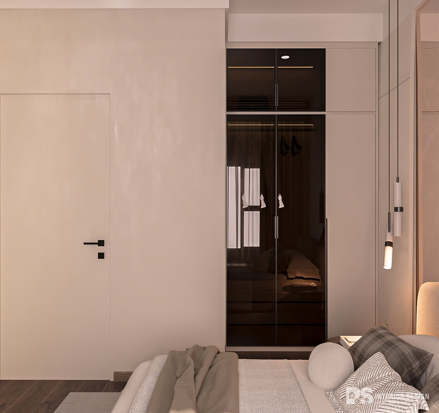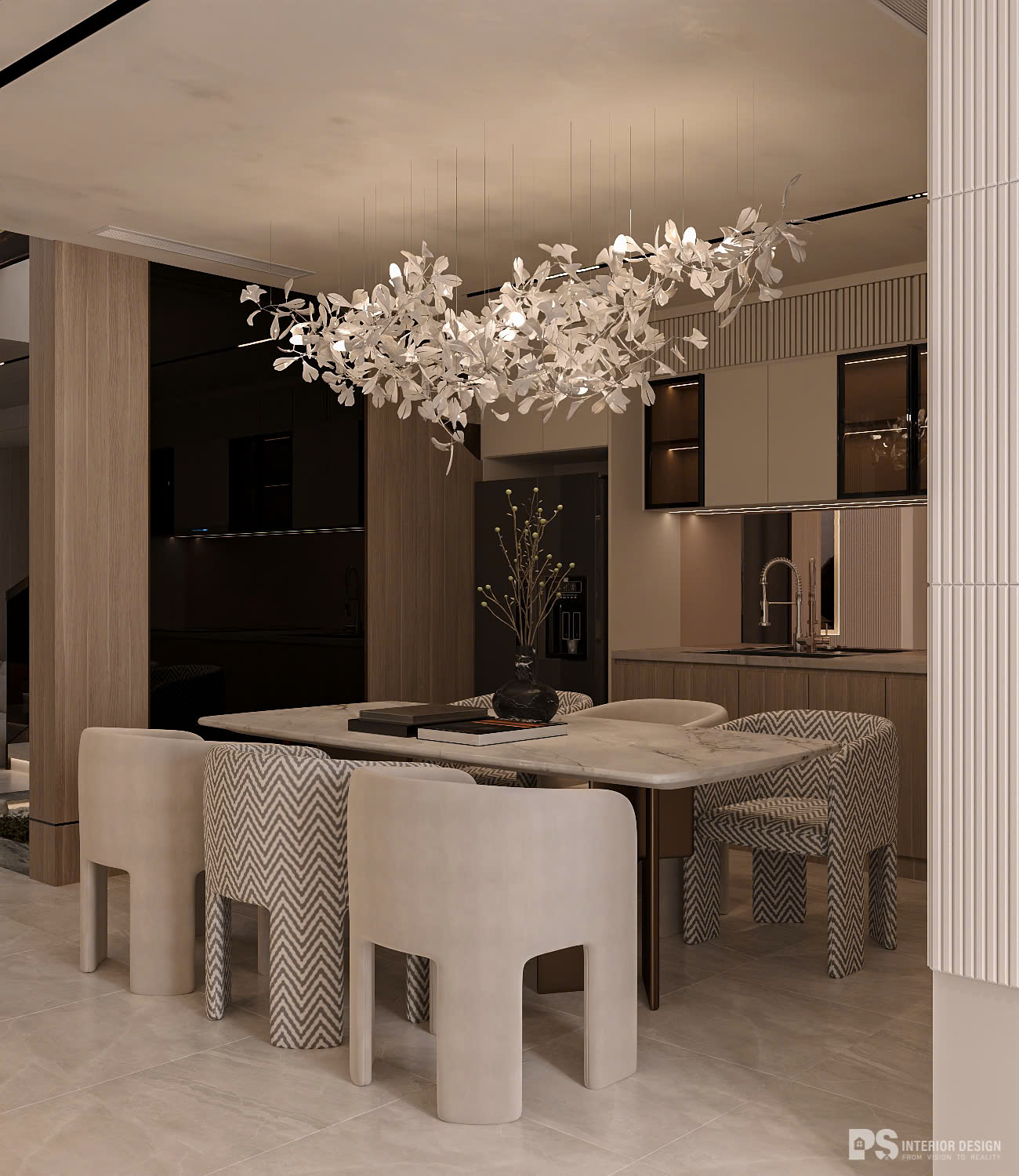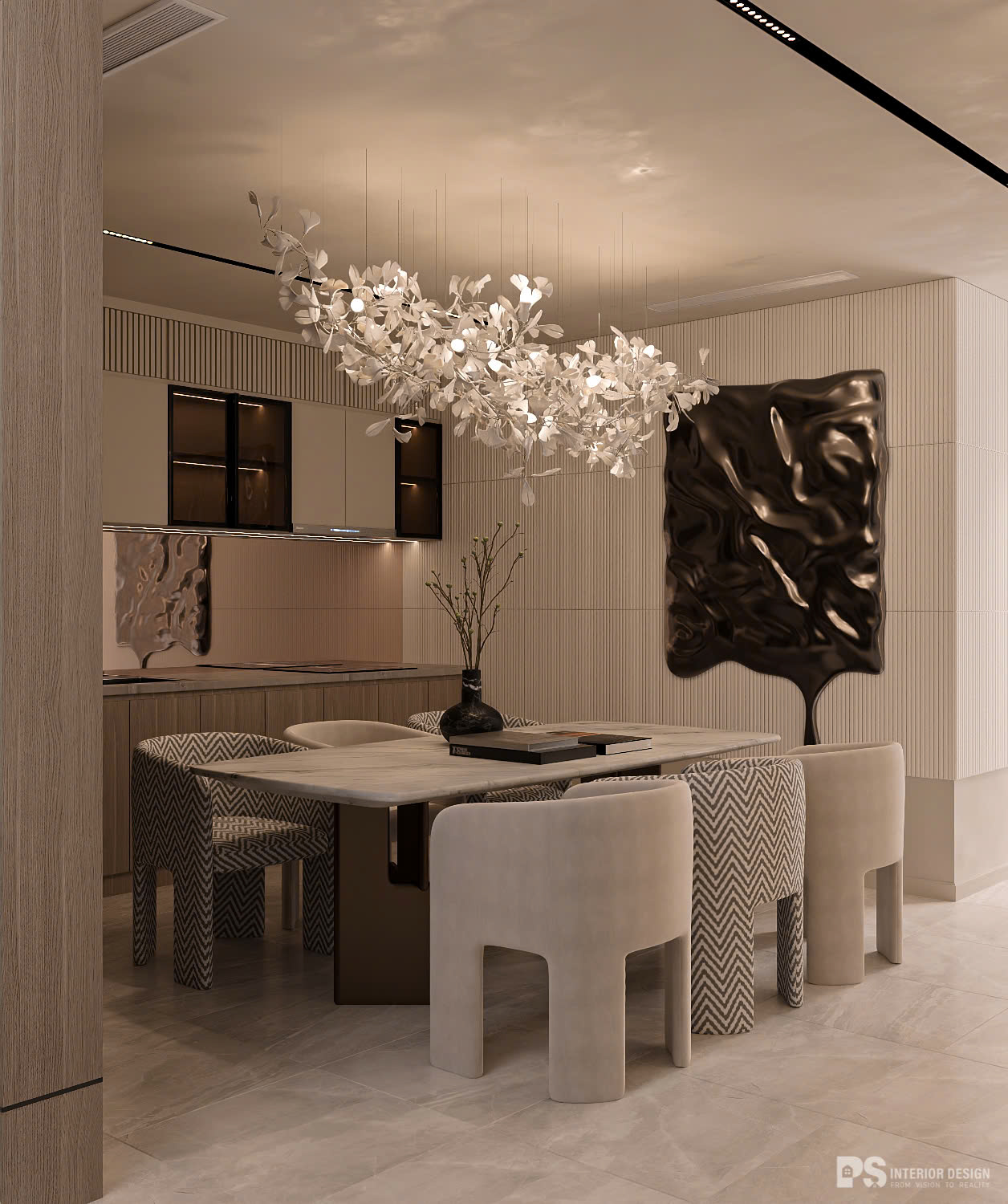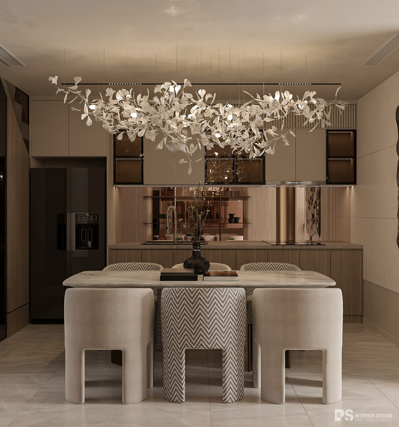 Chất Wabi Sabi nhấn các đường cong và tone màu be ấm làm mềm mại tổng thể rất tình. Tuy vậy, trọng tâm không gian vẫn là tính thời thượng và vẻ đẹp Sang Trọng - Hiện Đại.