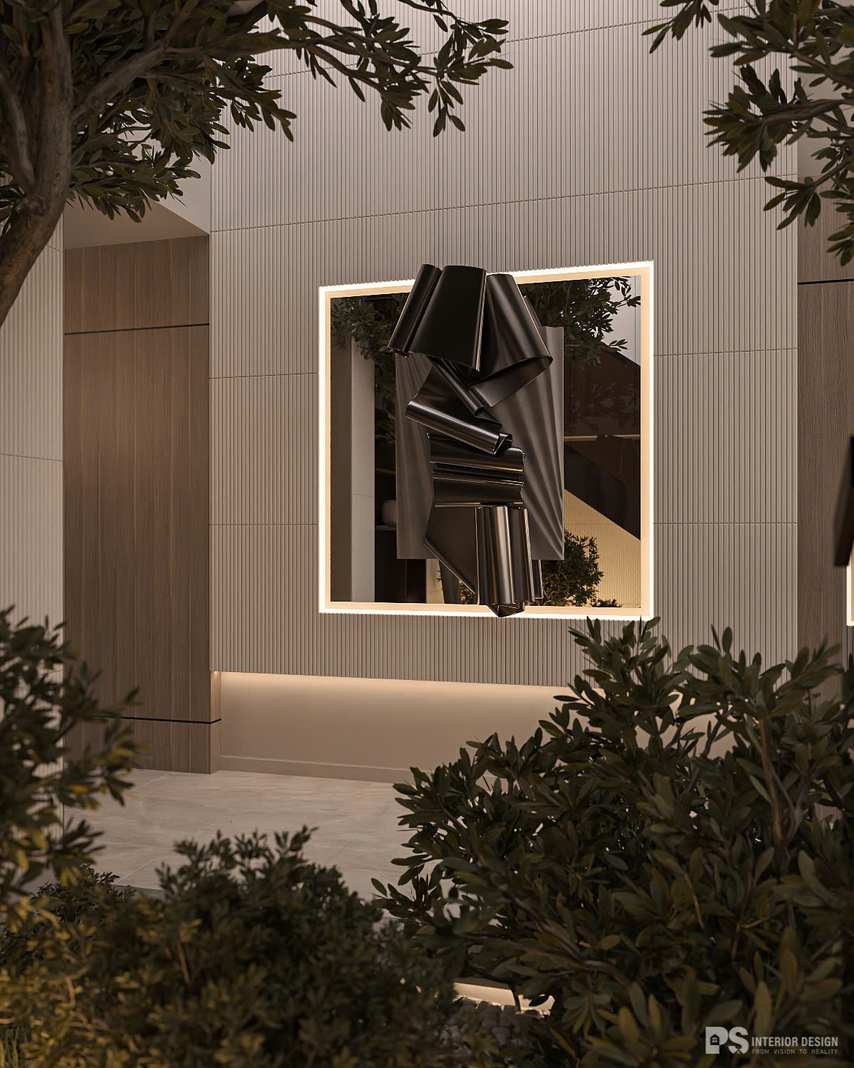 Vật liệu bóng như: kim loại mạ đồng, kính và những đường thẳng khúc chiết là nền tảng sắc sảo của tổng thể. Đồng thời, PS giảm thiểu sự phức tạp bằng cách chỉ sử dụng hai vật liệu và bảng màu thống nhất.