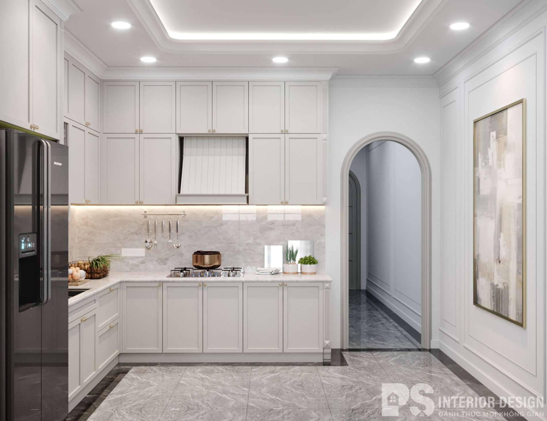 Khu bếp chữ L với tone màu trắng tinh khôi pha trộn một chút xám của đá nhân tạo mang đến cảm giác sang trọng đẳng cấp, ngoài ra căn bếp cũng được thiết kế tối ưu công năng giúp việc nấu ăn sinh hoạt chung trở nên tuyệt vời hơn bao giờ hết.