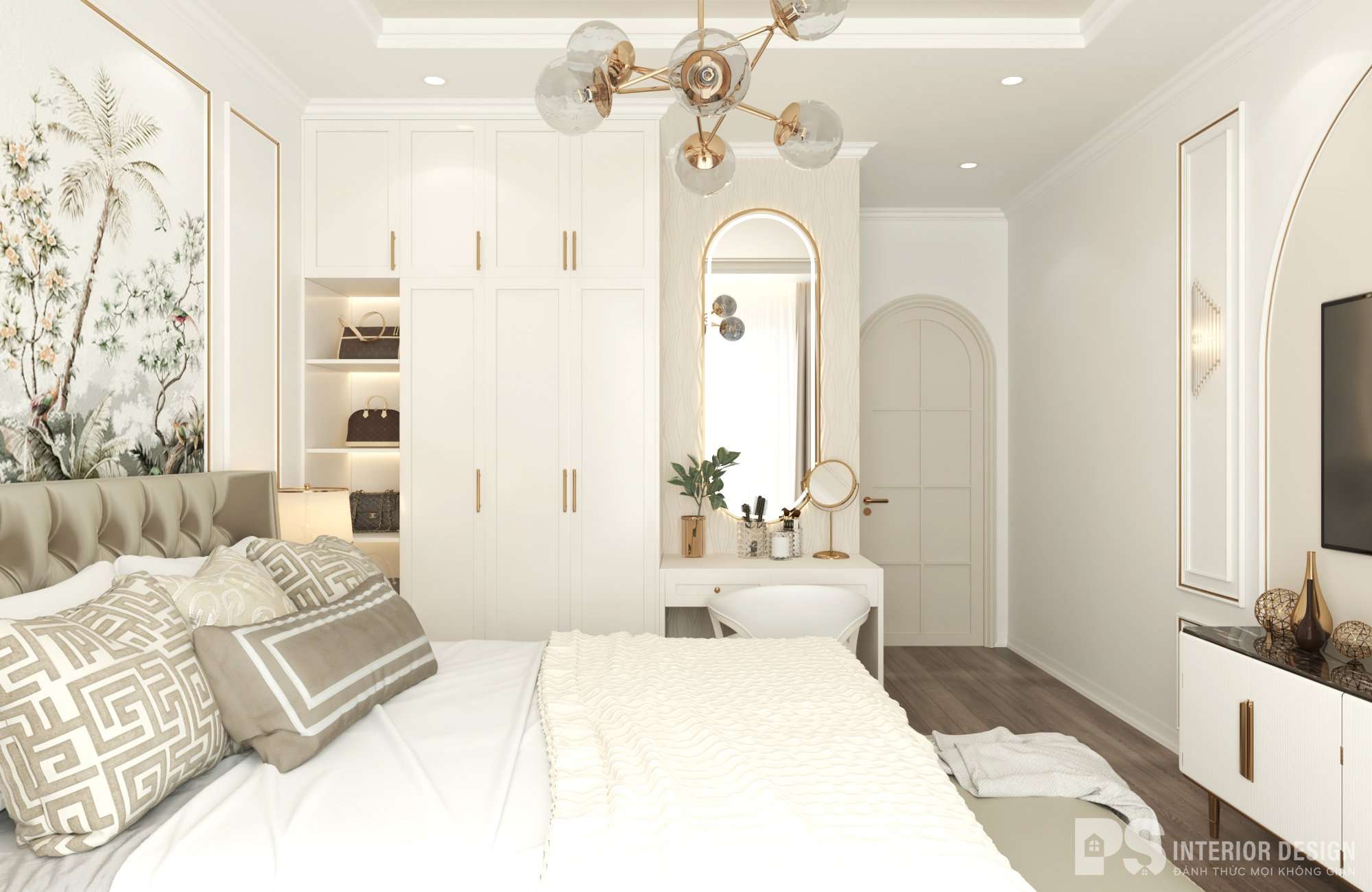 Phòng ngủ master có gam màu trung tính nhẹ nhàng trang nhã, cùng với đó căn phòng được trang trí các phụ kiện độc đáo như đèn chùm, tranh vẽ nghệ thuật thiên nhiên tạo sự gần gũi và kết nối với bên ngoài mang đến một màu sắc tươi mới trẻ trung cho căn phòng ngủ.