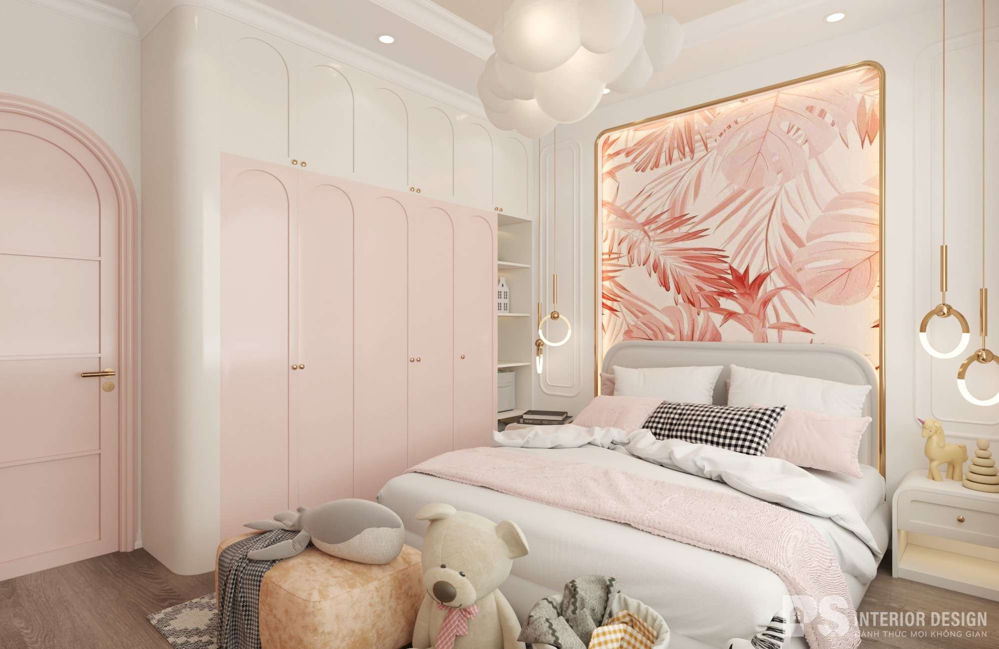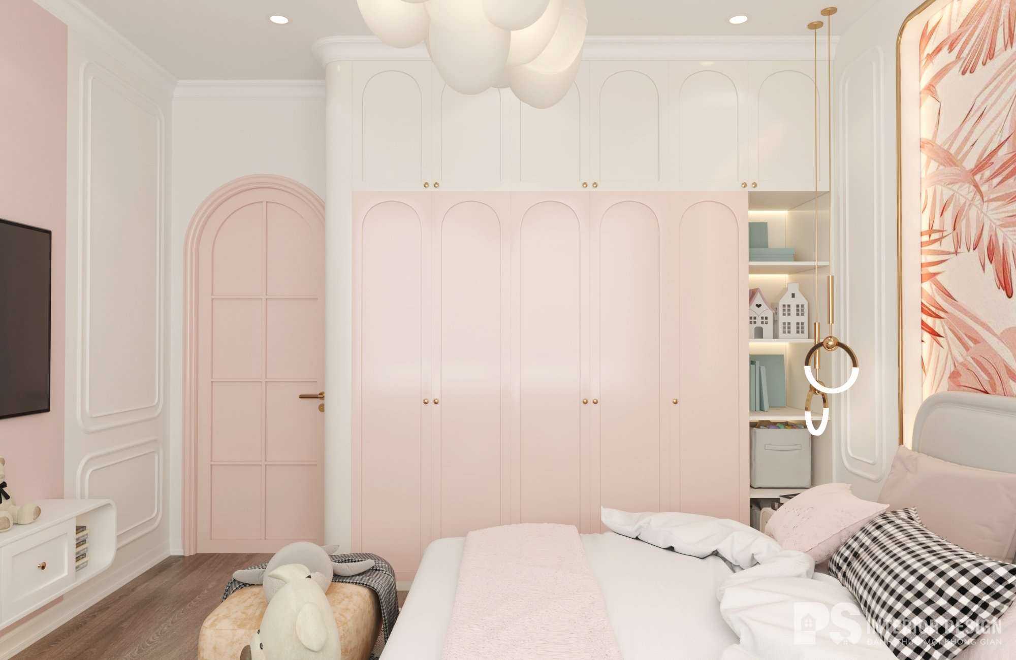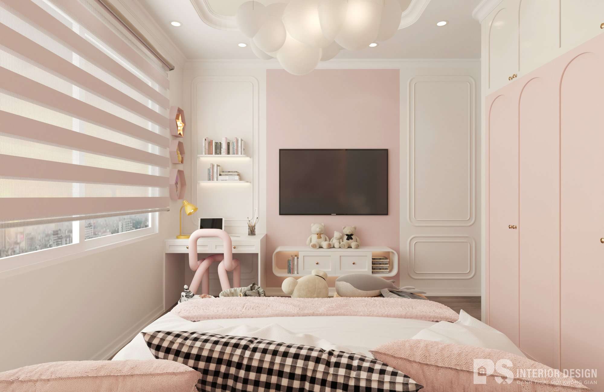 Với tone màu trắng hồng chủ đạo vô cùng ngọt ngào tinh khiết căn phòng còn được bố trí thông mình với tủ quần áo kịch trần, bàn học, kệ tivi,... và các phụ kiện vô cùng đáng yêu, xinh xắn giúp căn phòng vừa có diện tích sinh hoạt thoải mái vừa đẹp mắt thu hút mọi ánh nhìn.