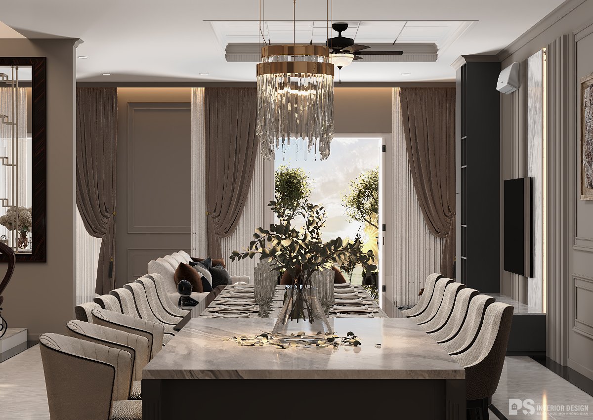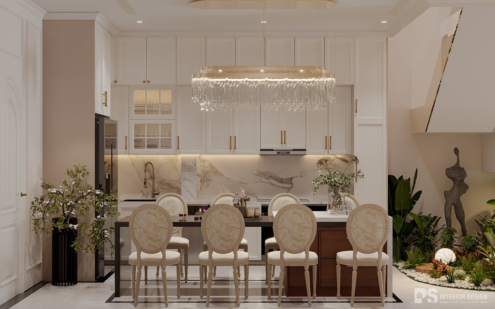 Đèn chùm và hoa văn ghế là những điểm nhấn biểu thị tinh thần cổ điển, sang trọng (bàn ăn, bếp Neoclassical)