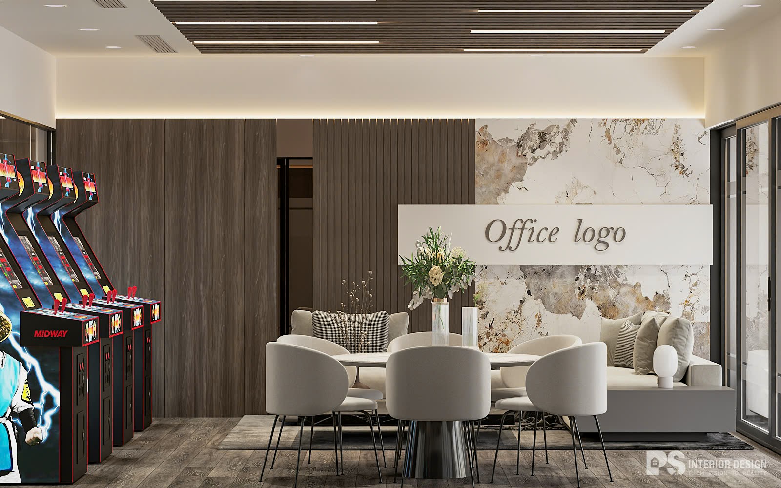 Thiết kế với sắc độ trung tính thanh lịch, nhấn gỗ ấm cúng tạo nên sự kết nối uyển chuyển và cân bằng tuyệt vời giúp Gia Chủ vừa tối ưu hóa hiệu suất làm việc, vừa tận hưởng cuộc sống trọn vẹn. Mỗi không gian đều được chú trọng công năng lẫn thẩm mỹ, đảm bảo mang lại trải nghiệm vượt trội. Chẳng hạn như: Khu làm việc được bố trí để vừa mang lại sự tập trung, vừa thuận tiện cho sự trao đổi kết nối. Phòng sinh hoạt chung có máy chơi game giúp mọi người thư giãn sau giờ làm việc