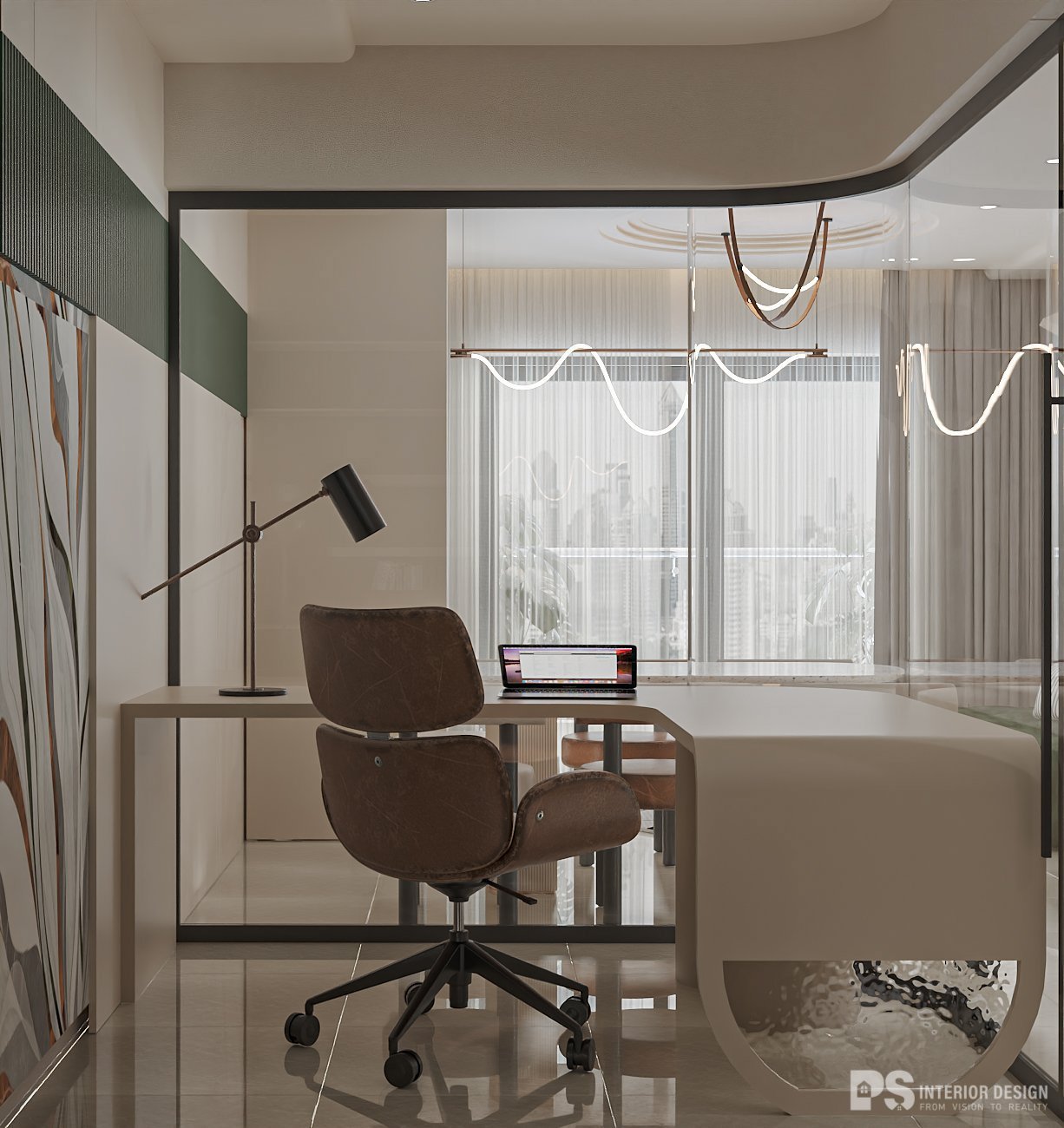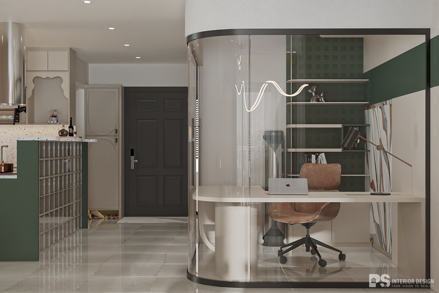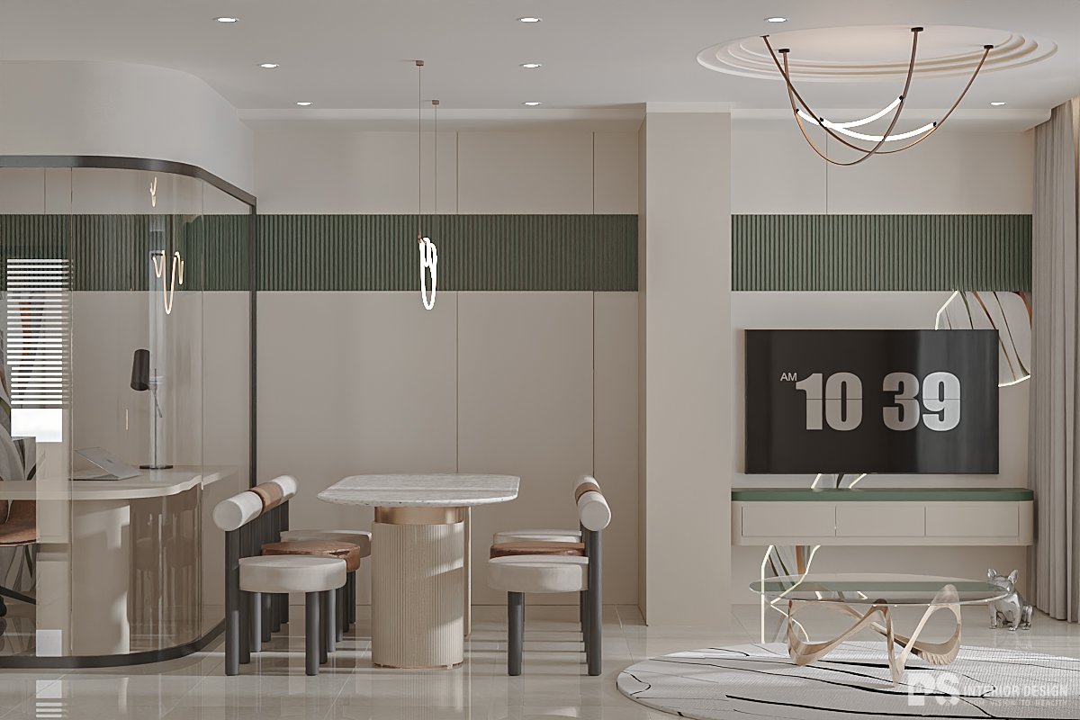 Thiết kế hiện đại là phong cách thiết kế nội thất đặc trưng bởi bảng màu đơn sắc, đường nét gọn gàng, tối giản, vật liệu và ánh sáng tự nhiên. Phong cách này nhấn mạnh vào chức năng và các hình thức đơn giản, rõ ràng. Căn hộ The Flemington được 𝐏𝐒 𝐈𝐍𝐓𝐄𝐑𝐈𝐎𝐑 𝐃𝐄𝐒𝐈𝐆𝐍 thổi luồng sinh khí mới với vẻ đẹp sống động và an nhiên cho không gian. Sắc xanh là điểm chạm kết nối gần gũi thiên nhiên. Thiết kế phòng làm việc độc đáo, nội thất được tinh chỉnh gọn gàng, tối giản mang lại cảm giác dễ chịu và đảm bảo tiện năng tối ưu cho gia chủ.