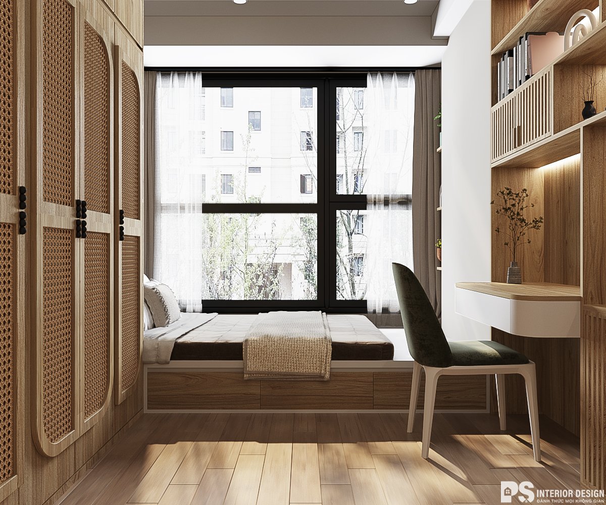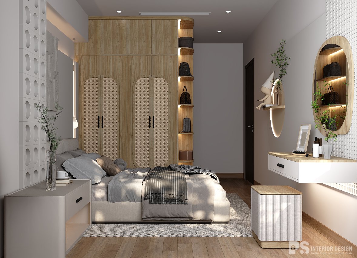 Ánh sáng tự nhiên được tận dụng tối đa qua các cửa sổ lớn, giúp căn phòng luôn sáng sủa và thoáng đãng. Các đèn treo được bố trí hợp lý, tạo ánh sáng nhẹ nhàng, ấm cúng vào buổi tối. Chậu cây nhỏ đặt bên cửa sổ mang lại hơi thở thiên nhiên, tăng thêm sự sinh động và tươi mới cho không gian. Tủ quần áo bằng gỗ với dáng hình đầy sáng tạo, không chỉ tiện dụng mà còn góp phần tạo nên vẻ đẹp tự nhiên và thẩm mỹ cho căn phòng. Tất cả các yếu tố này kết hợp hài hòa, tạo nên một phòng ngủ Wabi Sabi đúng nghĩa: đơn giản, tinh tế và tràn đầy cảm hứng từ thiên nhiên.