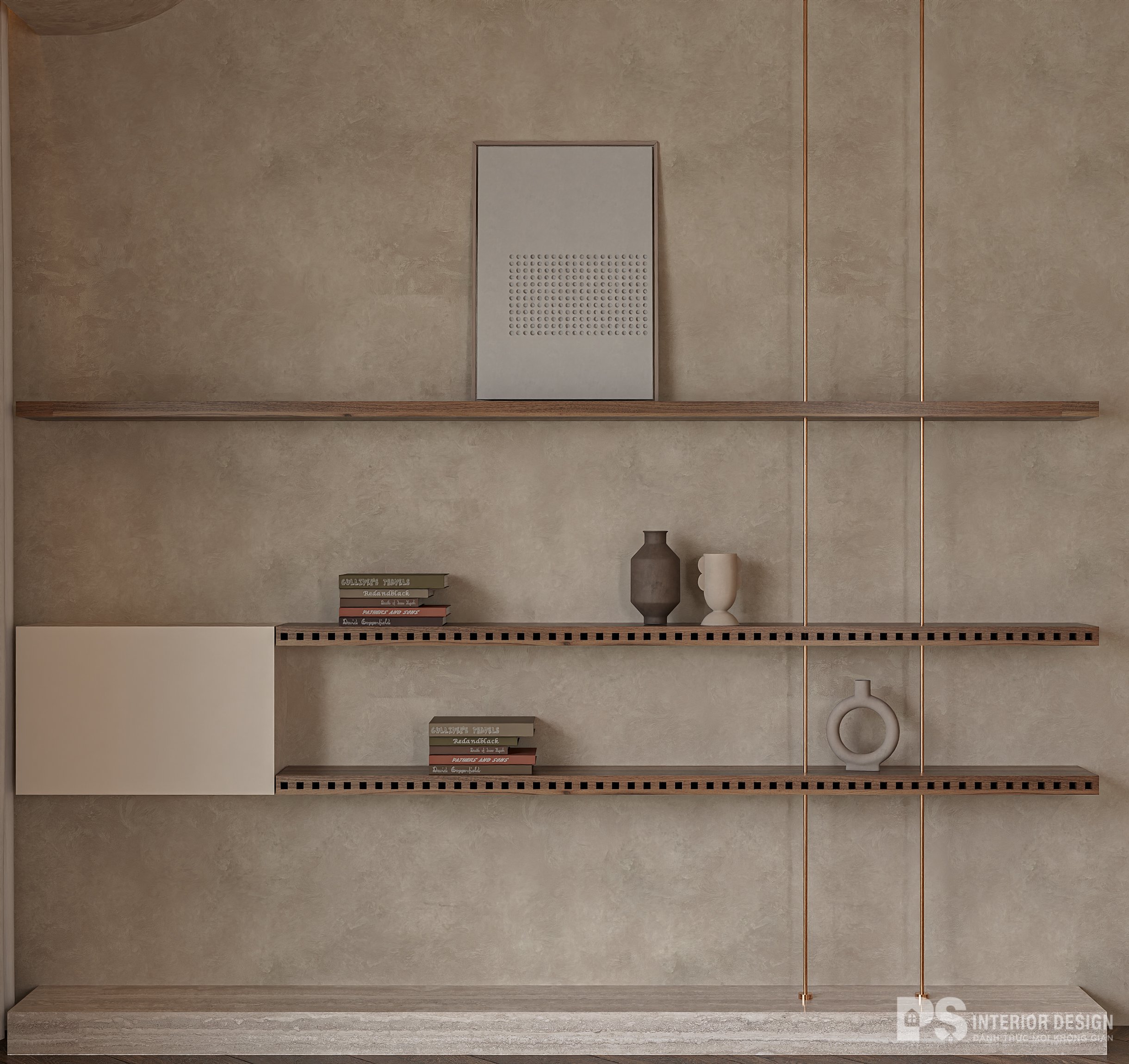 Kệ treo tường là giải pháp tuyệt vời để tận dụng không gian trống trên các bức tường và tối ưu hóa các góc chết trong phòng. Bạn nên chọn kệ góc hình tam giác để có thêm không gian chứa đồ trang trí nhỏ, tạo cảm giác mềm mại và thú vị cho căn phòng. Ngoài ra, tủ âm tường cũng là một giải pháp tiết kiệm không gian hiệu quả. Tủ âm tường không chỉ giấu đồ một cách gọn gàng mà còn giúp bạn có thêm chỗ để sắp xếp các đồ dùng cá nhân mà không chiếm nhiều diện tích.