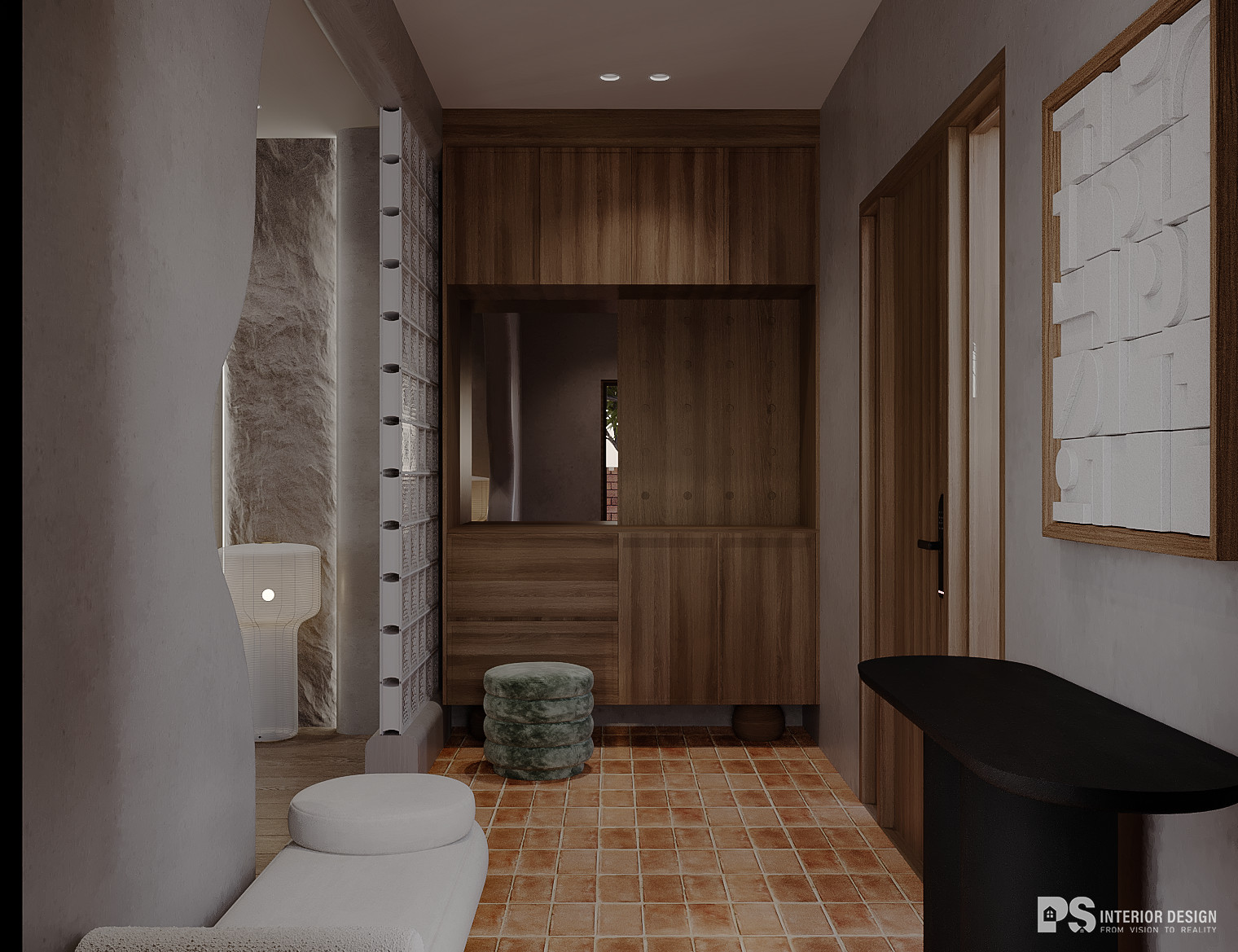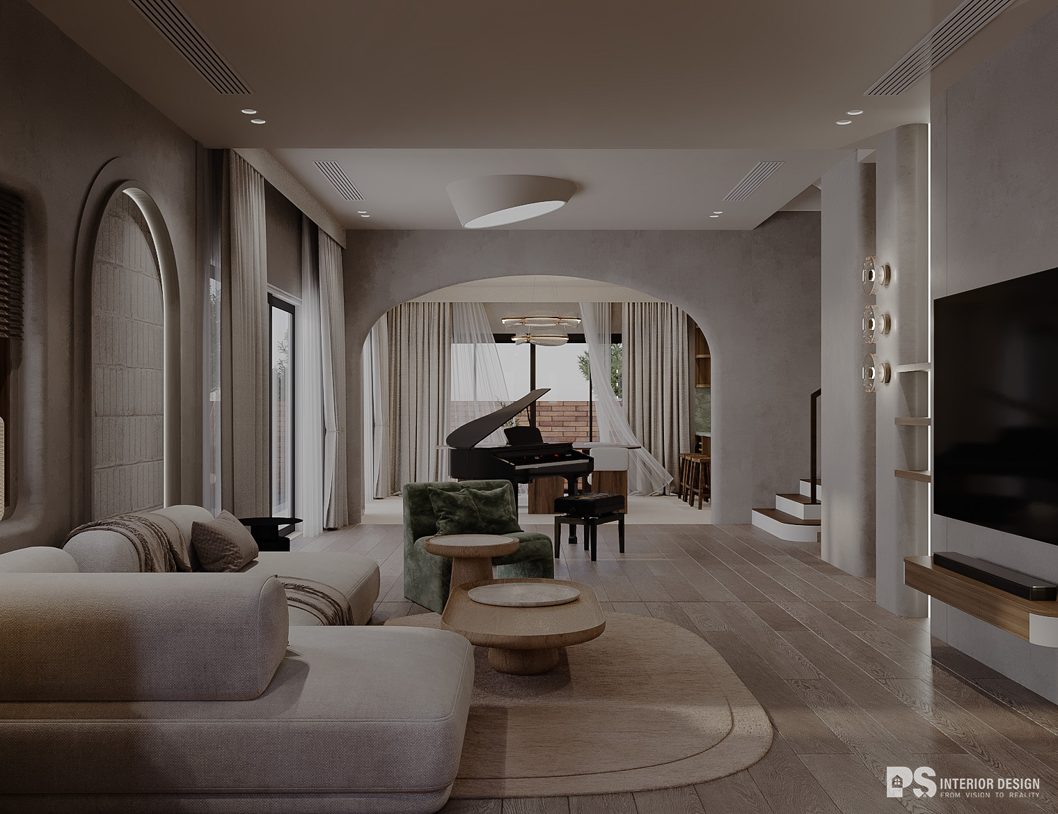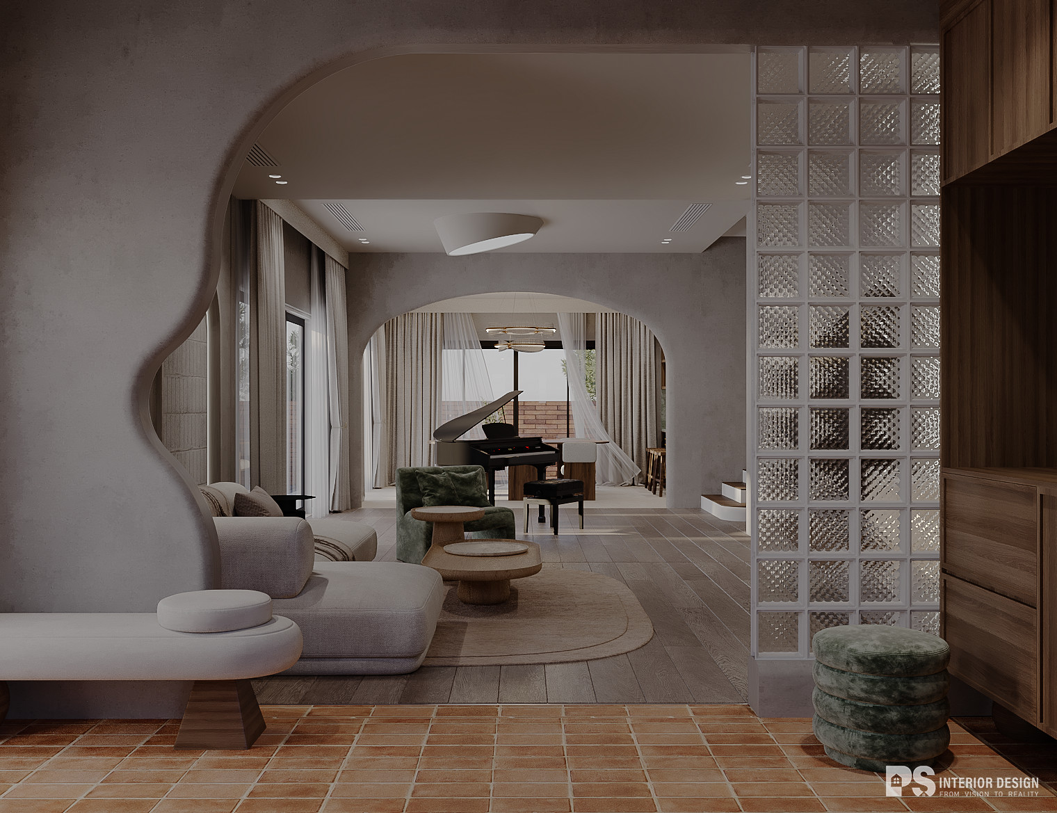 Nhà phố Aqua Riverside City Biên Hoà Đồng Nai có diện tích 978m² với quy mô: Sảnh trước | Phòng khách | Phòng ăn - bếp | 3 Phòng ngủ | Phòng làm việc | Phòng thờ | Phòng xem phim; được PS INTERIOR DESIGN thiết kế thanh lịch và tự nhiên theo phong cách Wabi Sabi. Phong cách nội thất Wabi Sabi không hướng con người ta đến một không gian sống hoàn mỹ, mà giúp họ tìm thấy sự đủ đầy trong tâm hồn hiện hữu trong vẻ đẹp nguyên sơ, bất toàn.