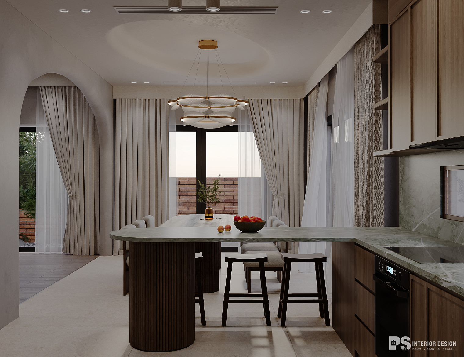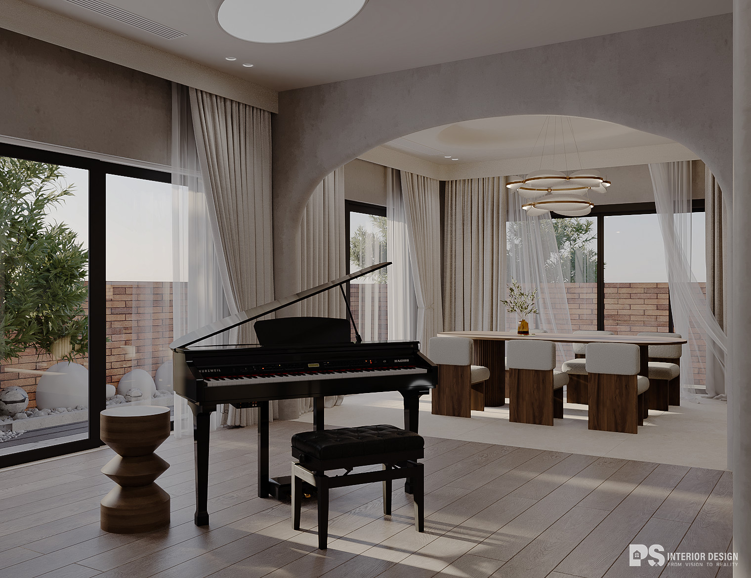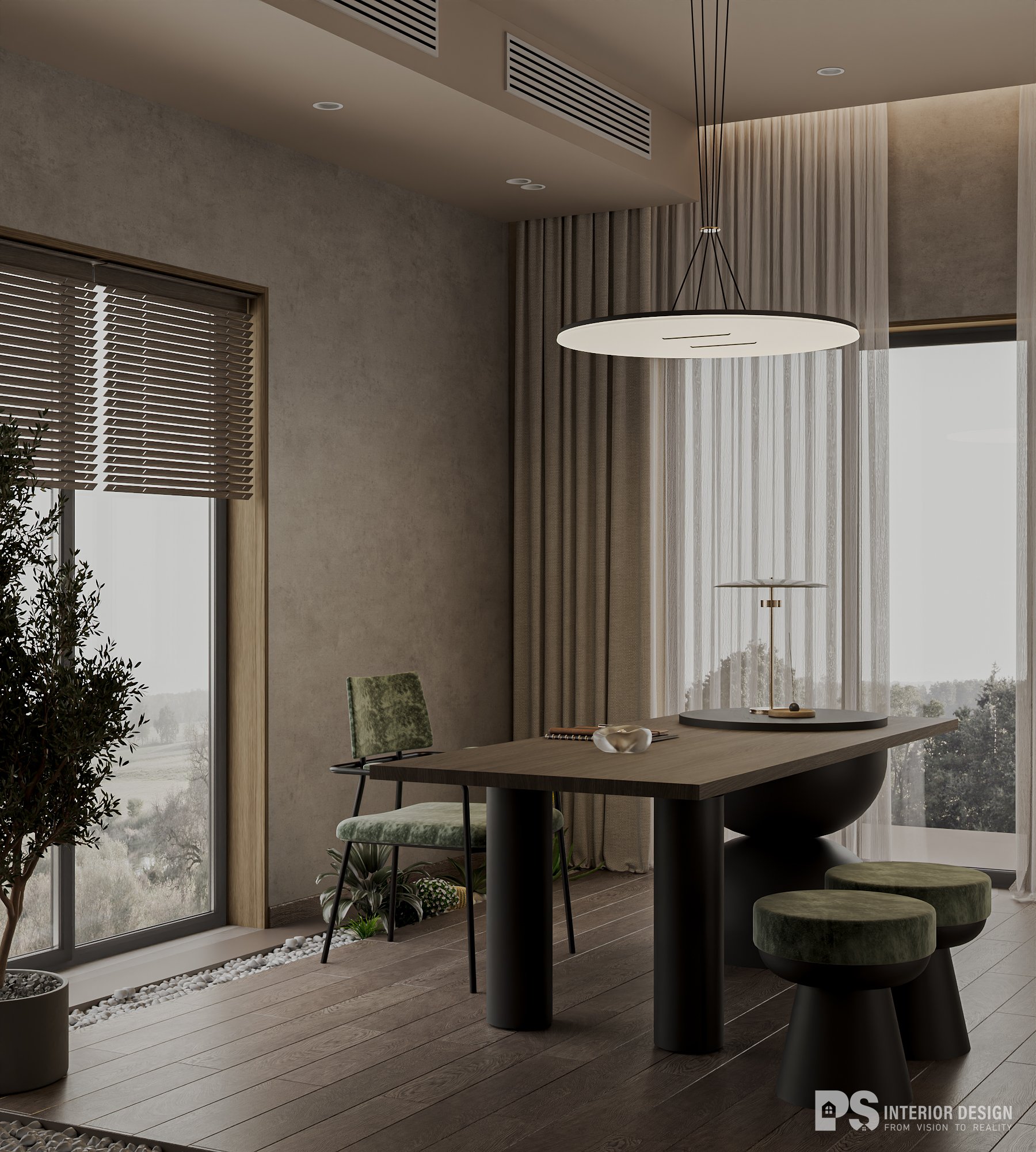 Nhà phố Aqua Riverside City Biên Hoà Đồng Nai có diện tích 978m² với quy mô: Sảnh trước | Phòng khách | Phòng ăn - bếp | 3 Phòng ngủ | Phòng làm việc | Phòng thờ | Phòng xem phim; được PS INTERIOR DESIGN thiết kế thanh lịch và tự nhiên theo phong cách Wabi Sabi. Phong cách nội thất Wabi Sabi không hướng con người ta đến một không gian sống hoàn mỹ, mà giúp họ tìm thấy sự đủ đầy trong tâm hồn hiện hữu trong vẻ đẹp nguyên sơ, bất toàn.