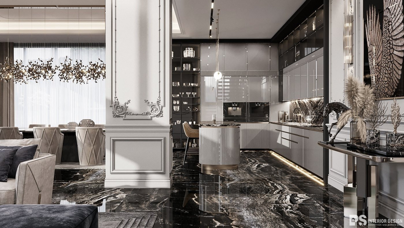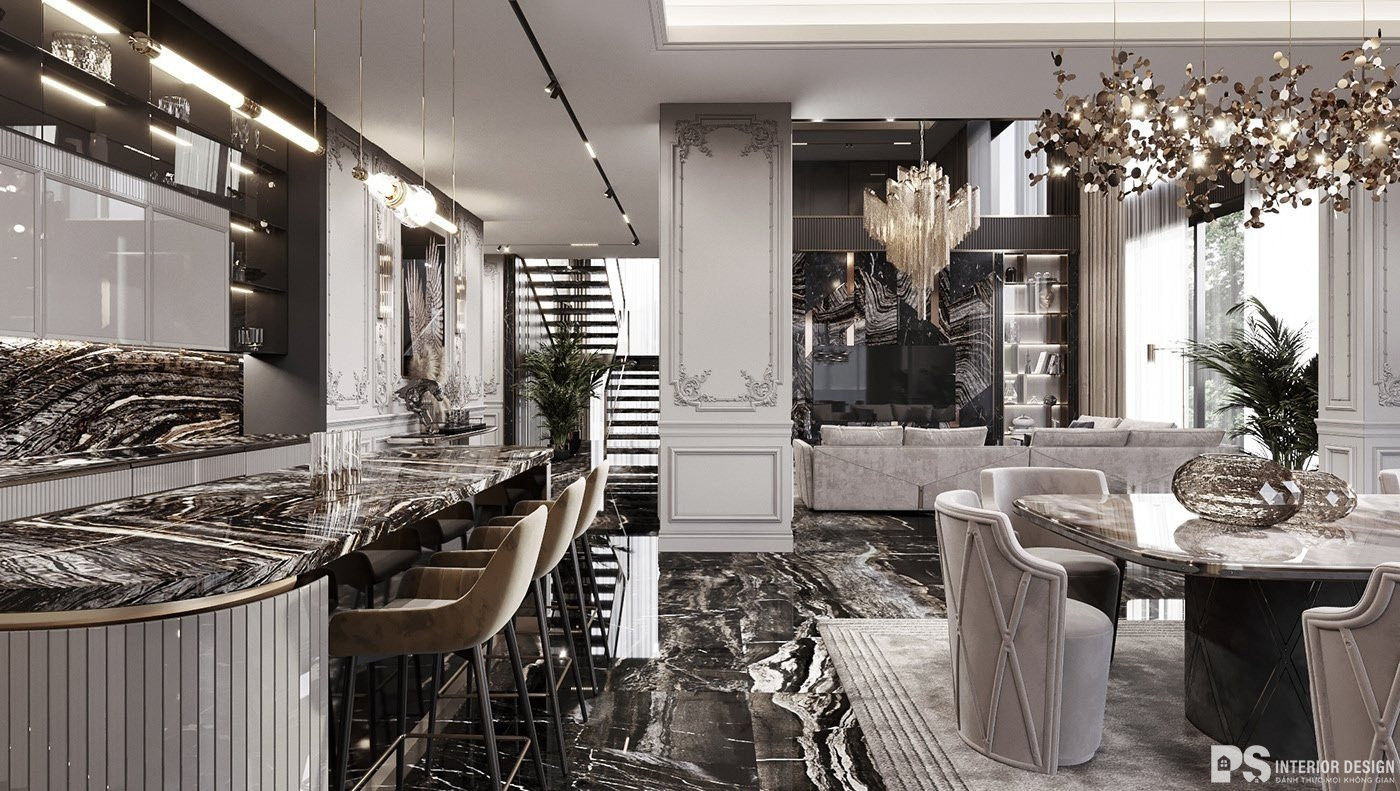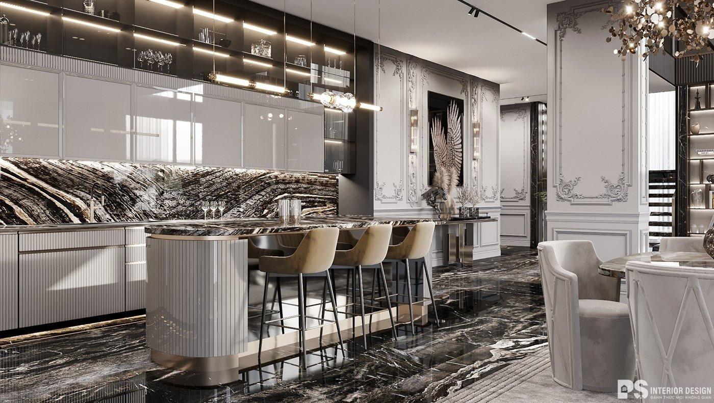 Quầy bar được lắp mặt đá có các vân đá màu vàng đồng đan xen trên bề mặt đen quý phái đã tạo ra sự ngăn cách giữa phòng khách và bếp vô cùng tinh tế.