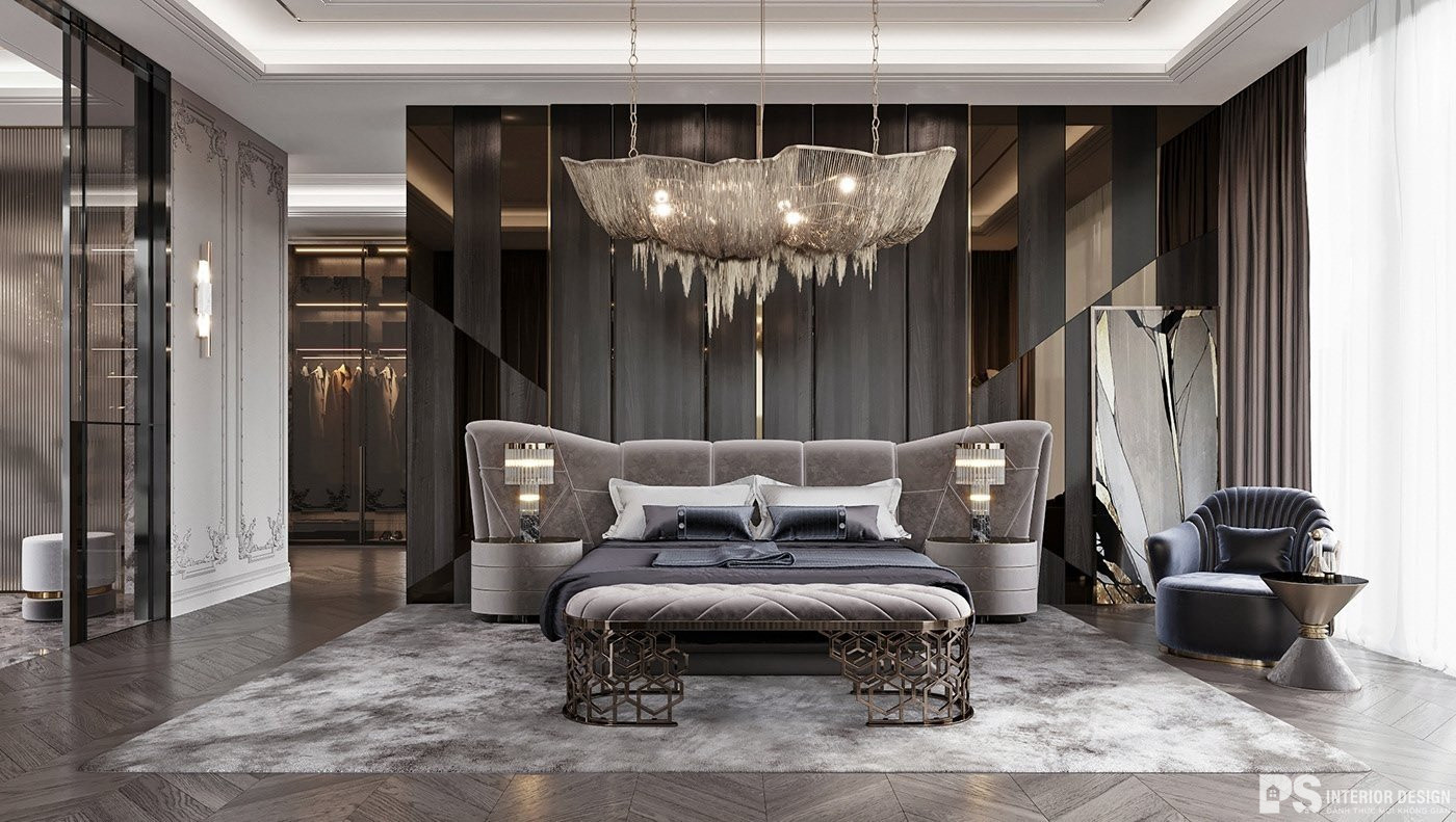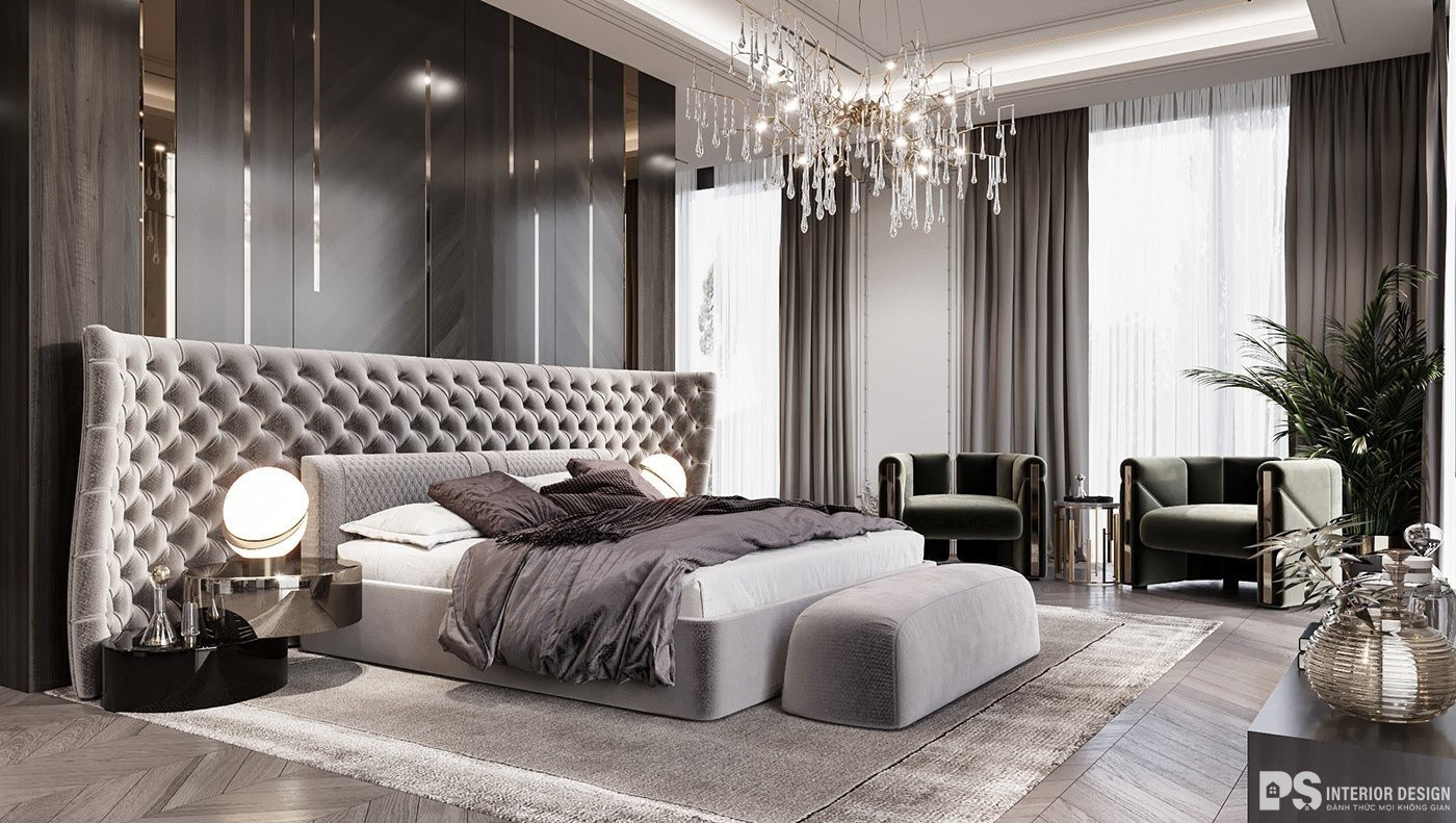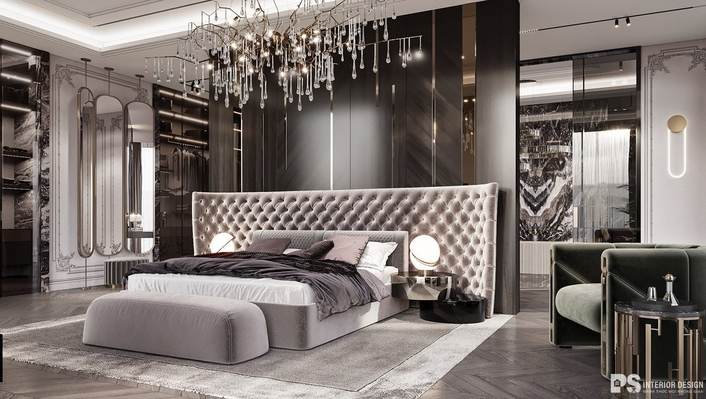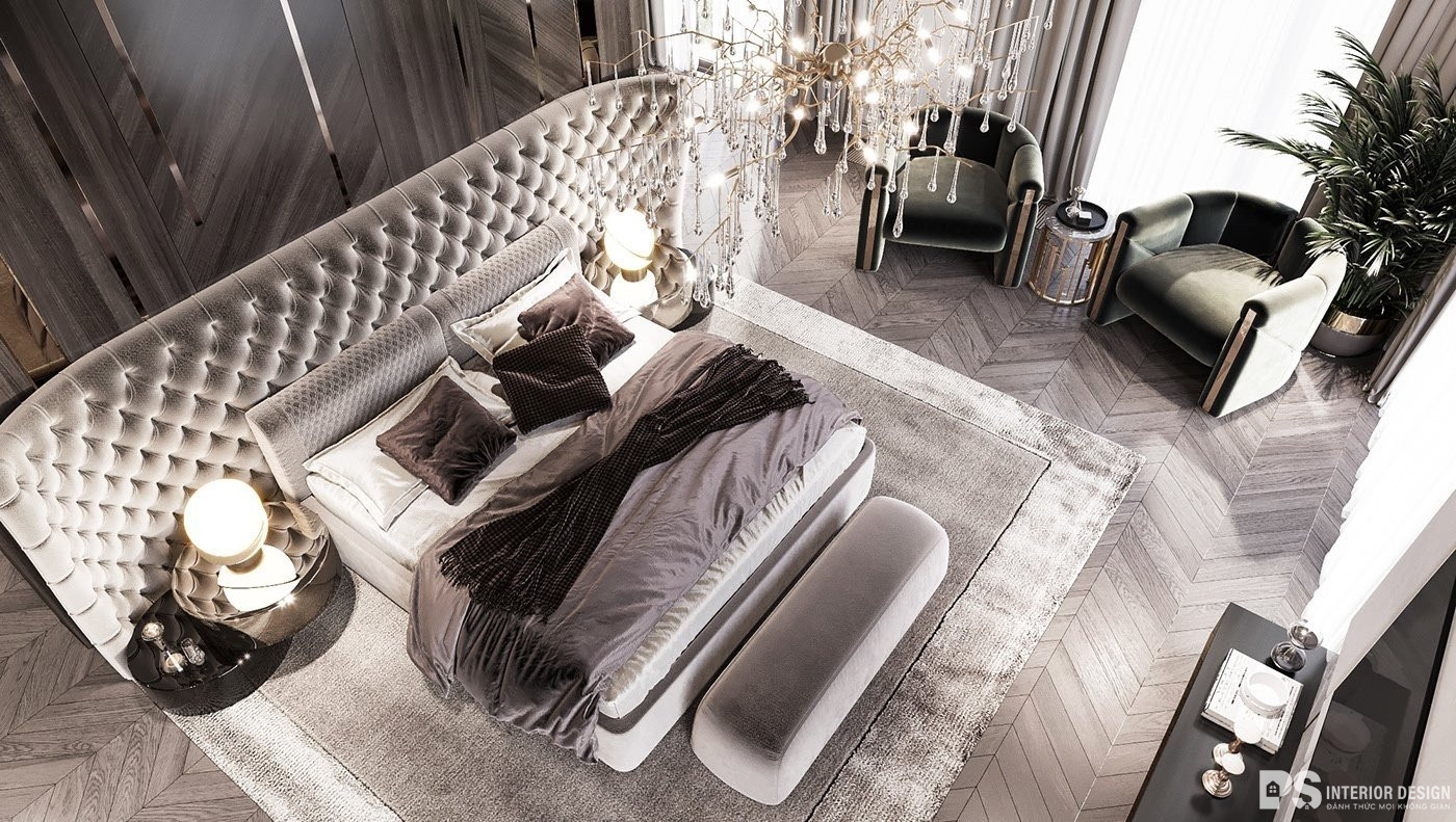 Bên cạnh đó miếng ốp đầu giường bọc nhung và kết hợp với bộ đèn chùm phía trên đã tạo nên sự sang trọng cho nơi này.